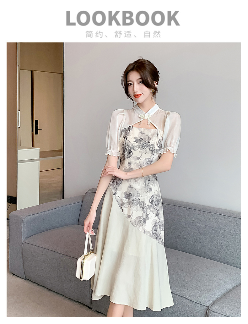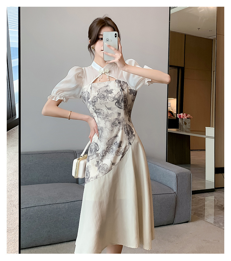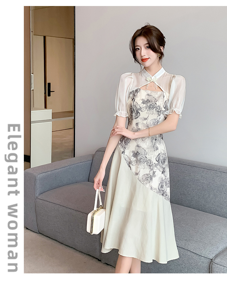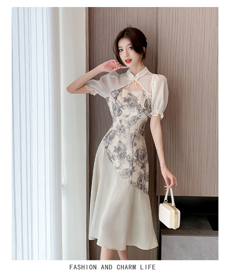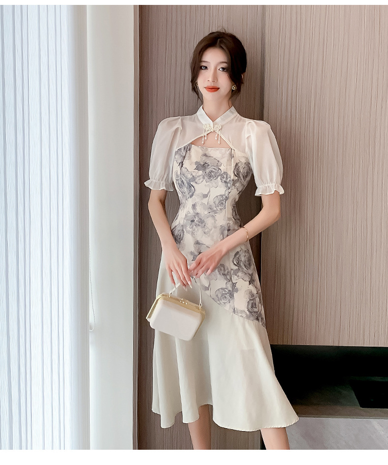 새로운 중국 스타일의 스탠드 칼라 짧은 소매 여름 2024 새로운 허리 슬리밍 중간 길이 잉크 꽃 스티칭 요정 스커트스토어 가기