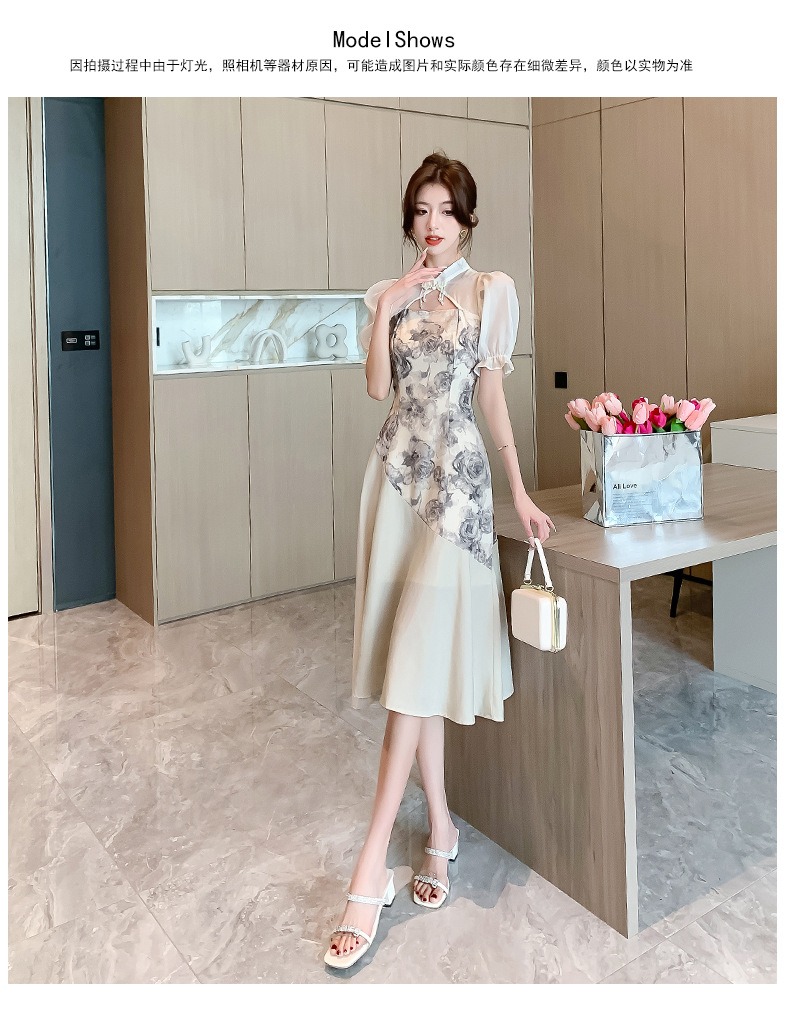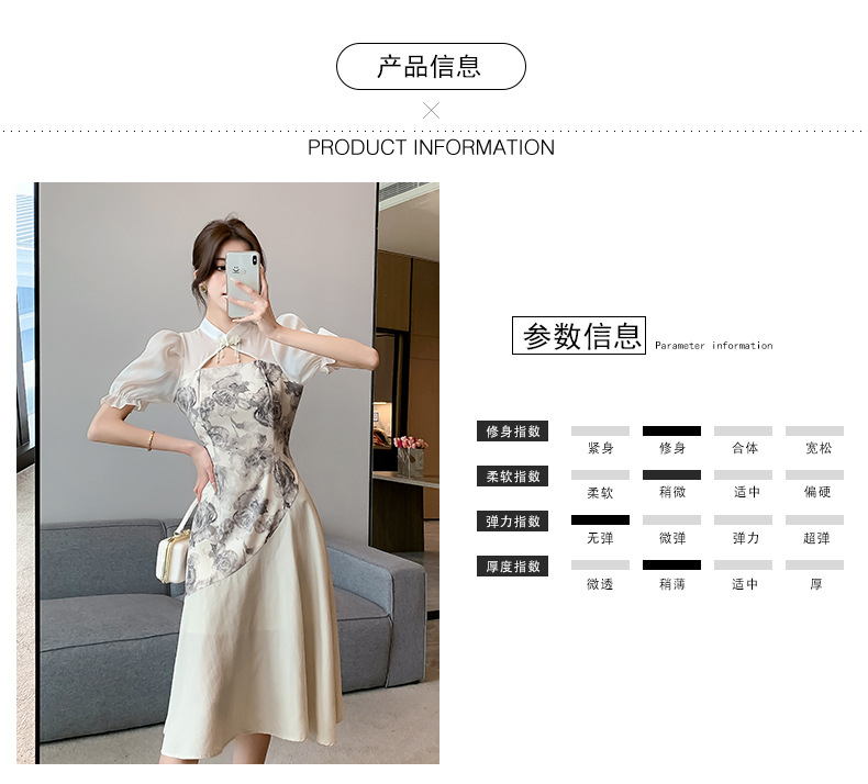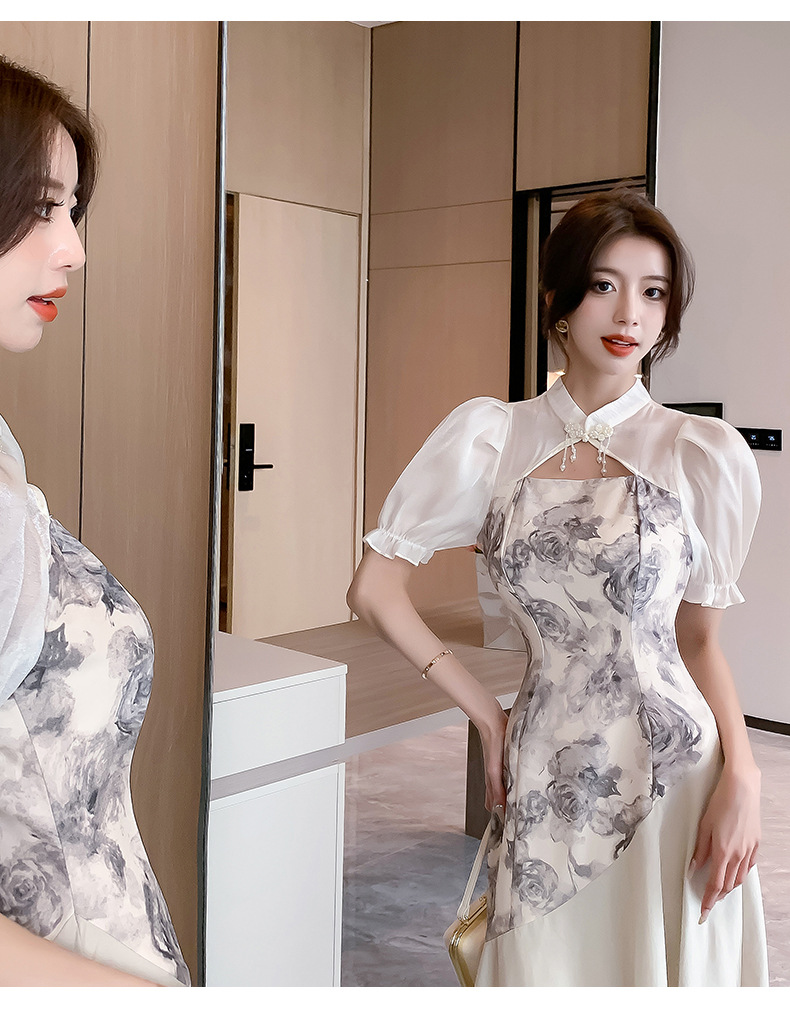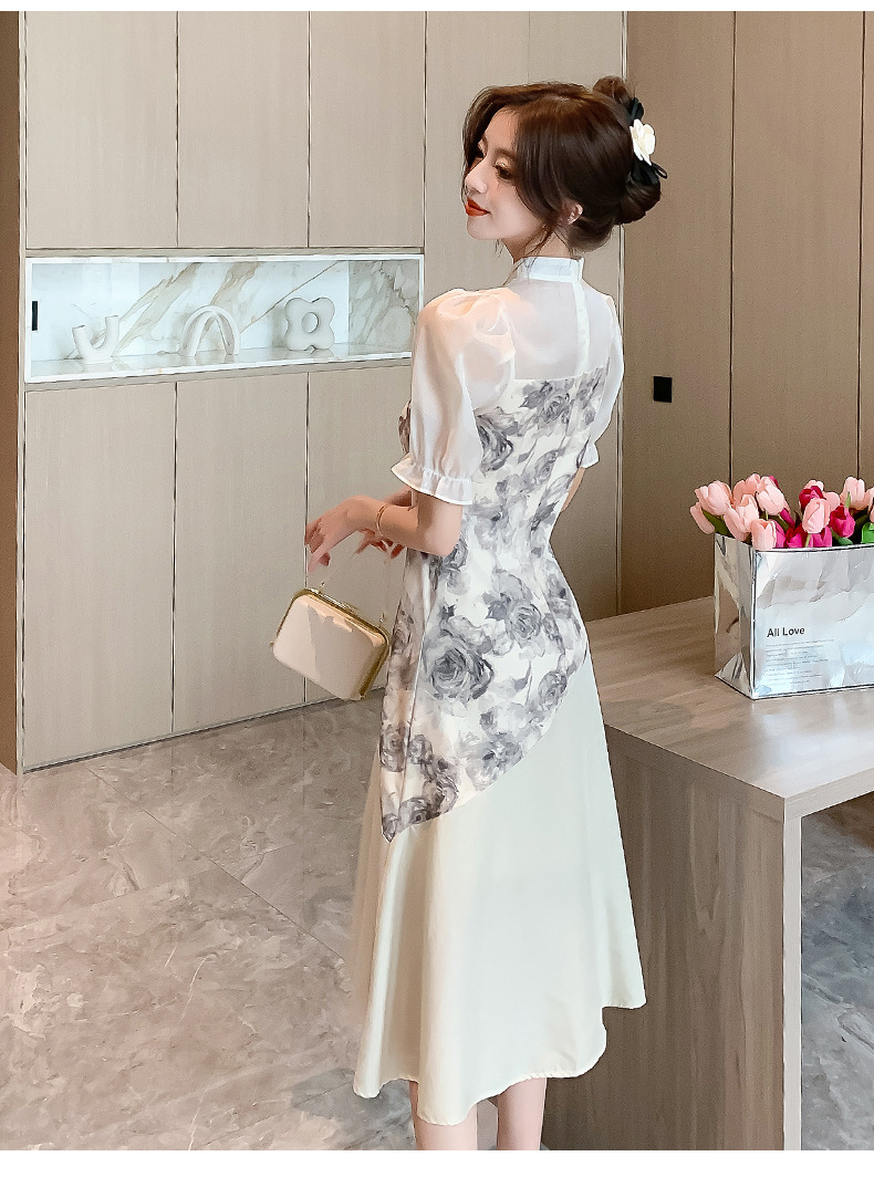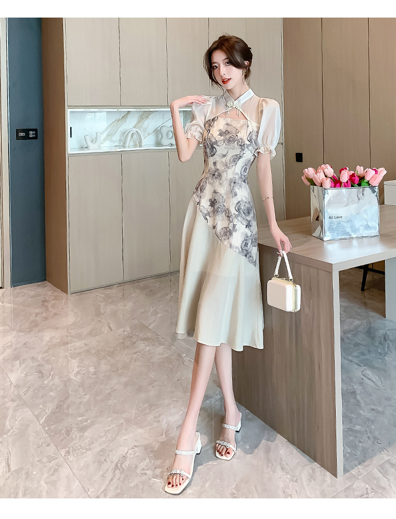 새로운 중국 스타일의 스탠드 칼라 짧은 소매 여름 2024 새로운 허리 슬리밍 중간 길이 잉크 꽃 스티칭 요정 스커트스토어 가기