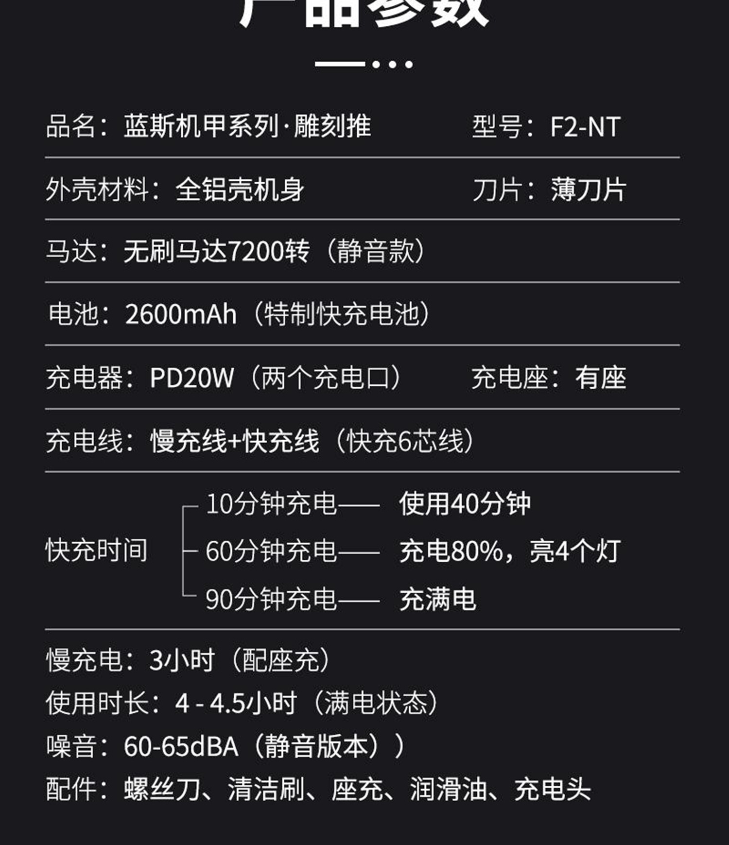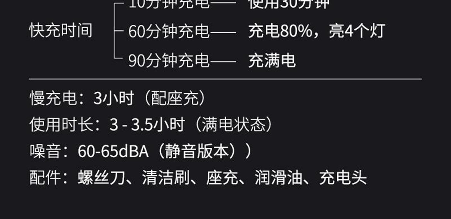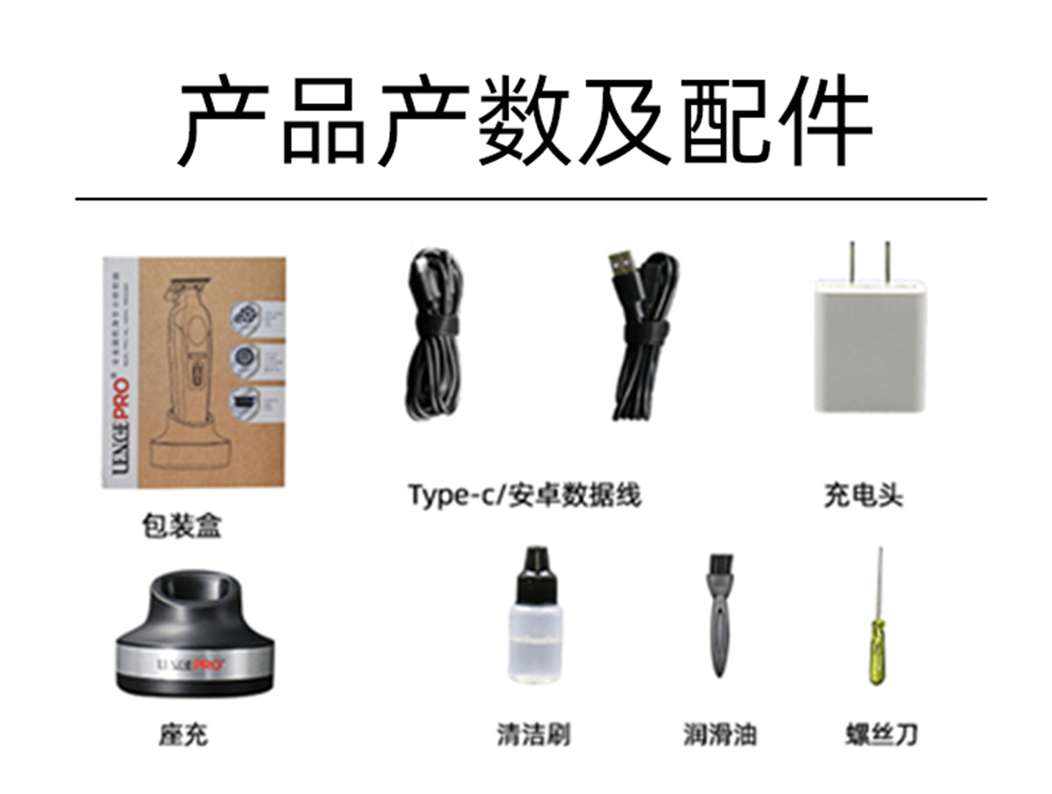 产品包含:主机、电源适配器、刷子、限位梳、油瓶、调节匙、说明书