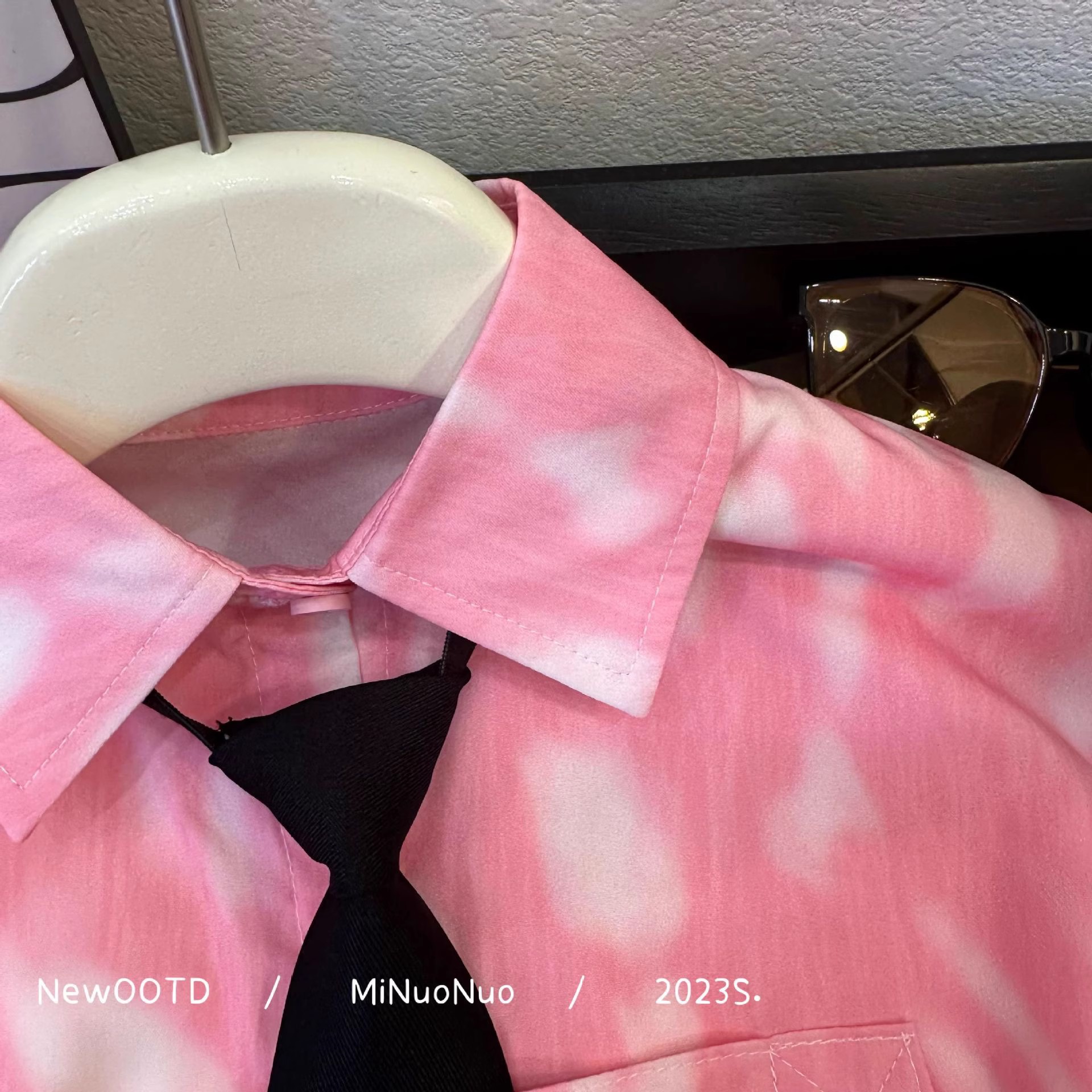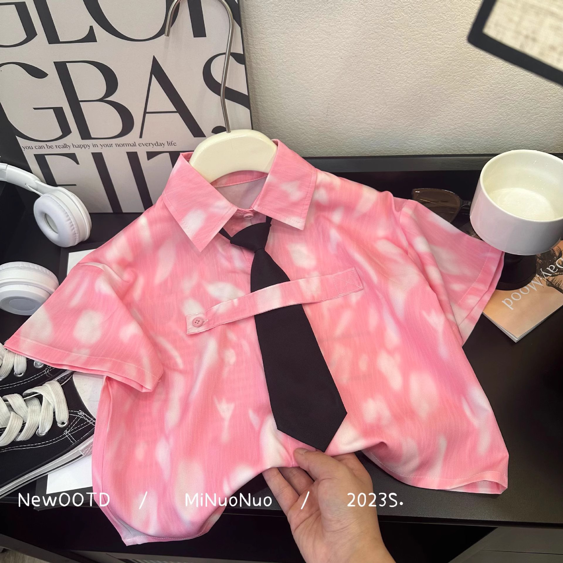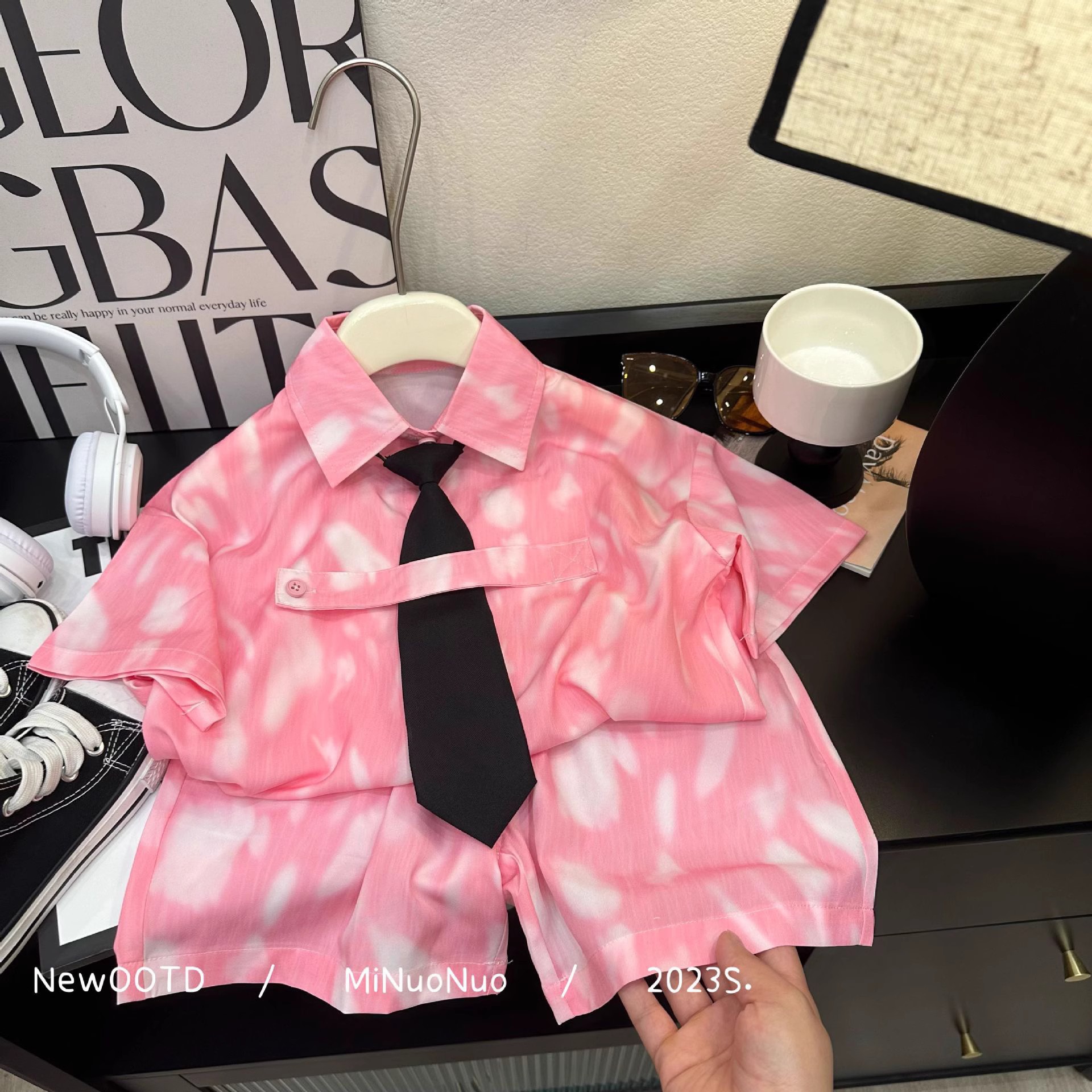 남아 반팔 셔츠 세트 2025 여름 여아 한국 스타일 넥타이 핑크 쉬폰 셔츠 반바지 3종 세트 트렌디