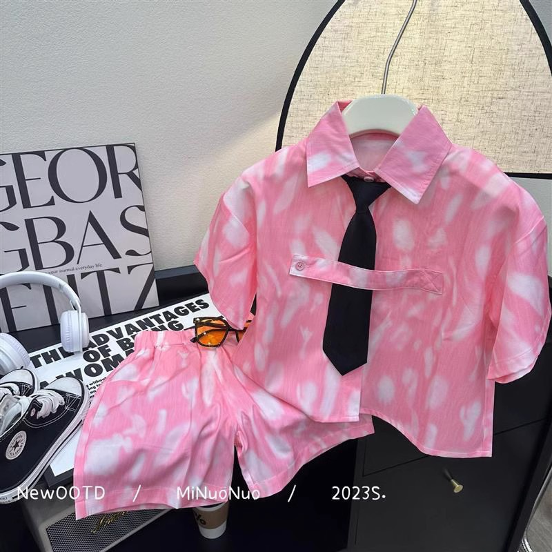 남아 반팔 셔츠 세트 2025 여름 여아 한국 스타일 넥타이 핑크 쉬폰 셔츠 반바지 3종 세트 트렌디스토어 가기