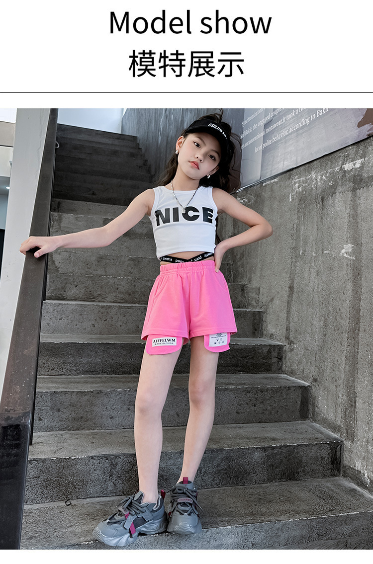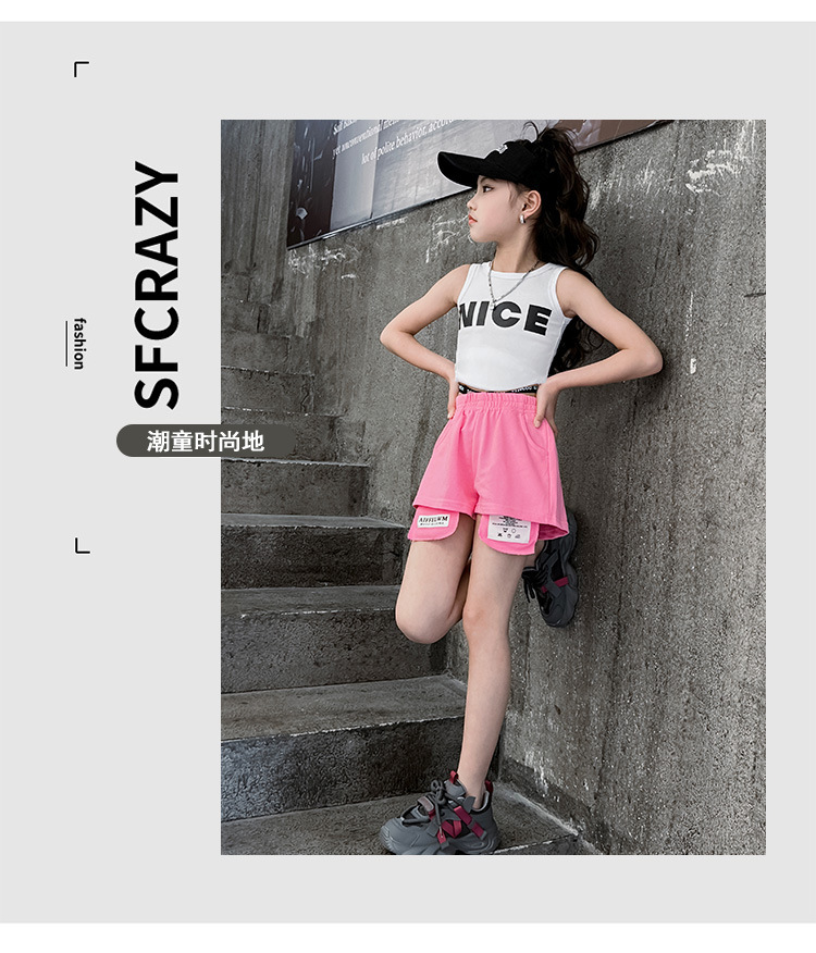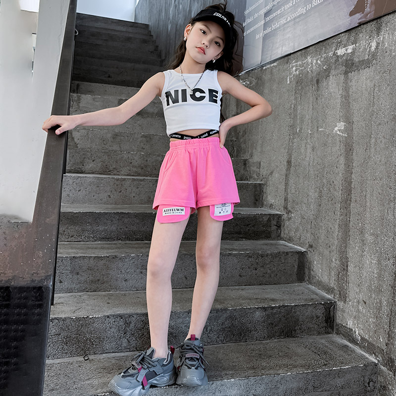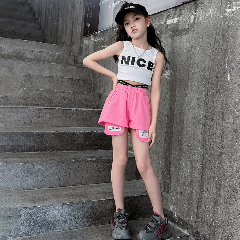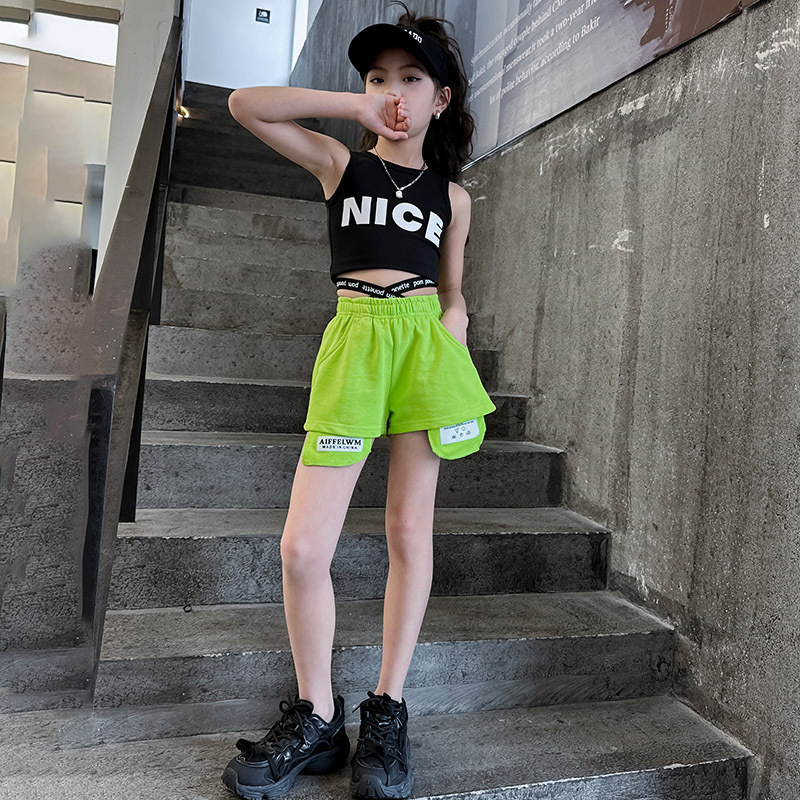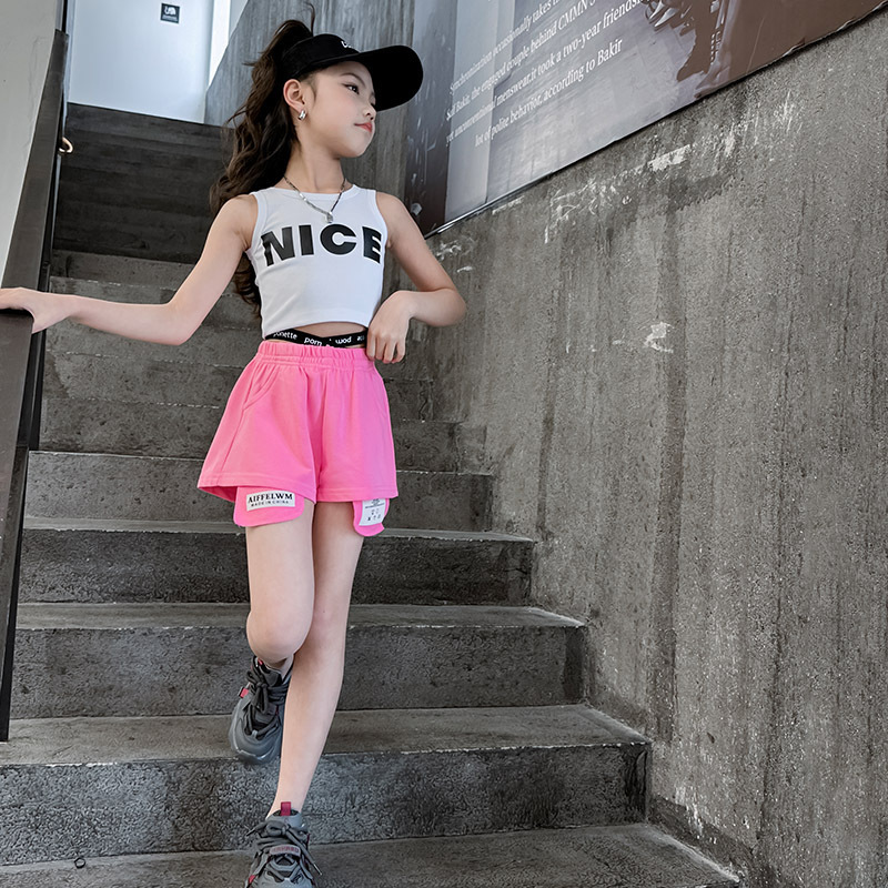 소녀의 여름 세트 2024 새로운 스타일 도파민 착용 소녀의 향신료 조끼 스포츠 반바지 2 조각 유행 세트