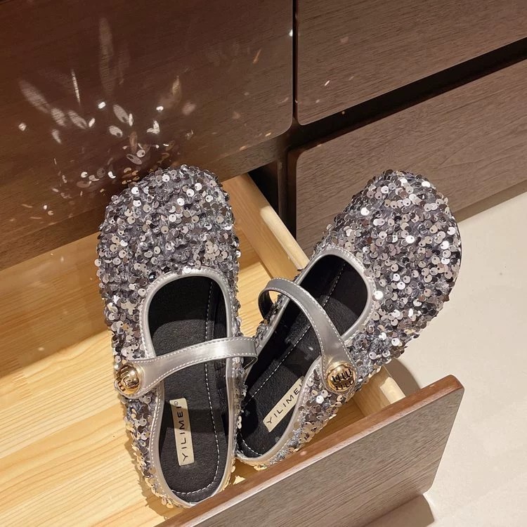 하이 엔드 센스 2024 봄과 여름 새로운 스팽글은 Mary Jane 신발 싱글 레이어 신발 여성 슈즈와 함께 발가락 하프 소프 샌들을 덮었습니다.스토어 가기