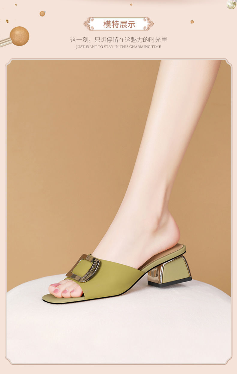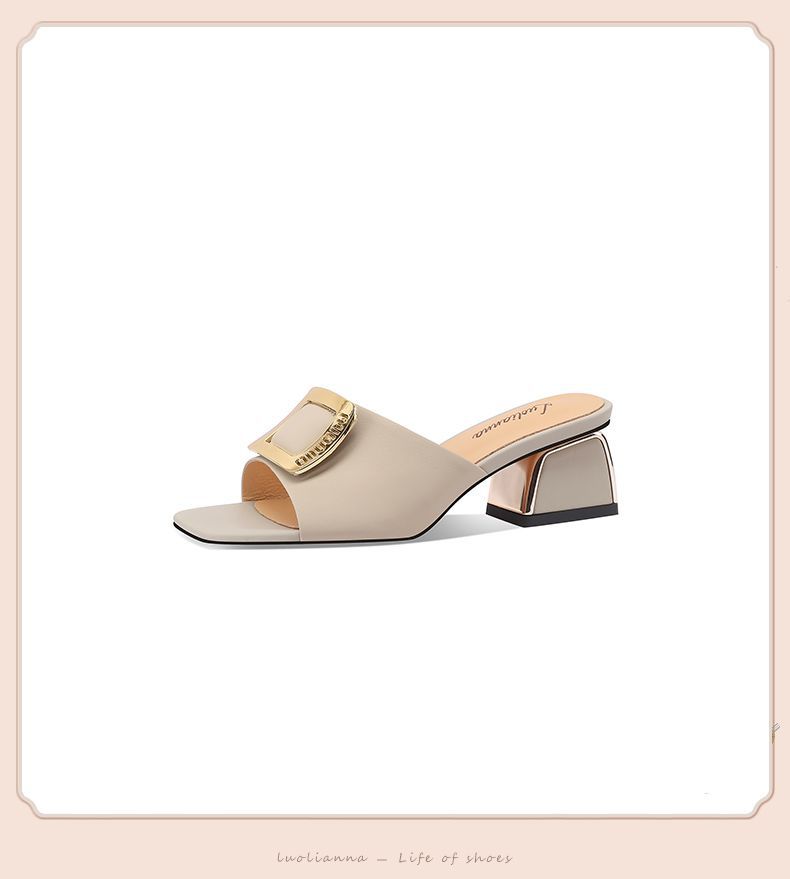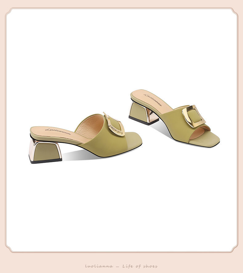 물고기 입 슬리퍼 여성의 여름 외부 착용 2024 새로운 패션 미드 힐 메탈 버클 두꺼운 힐 슬리퍼