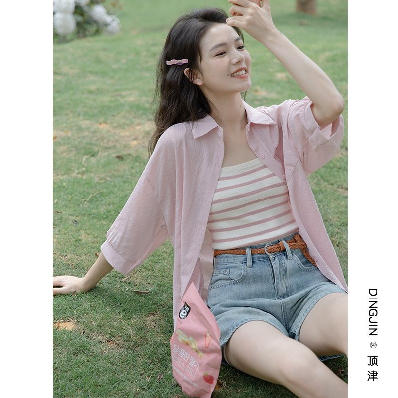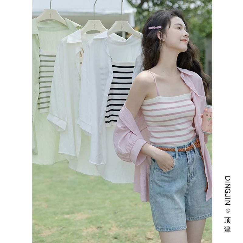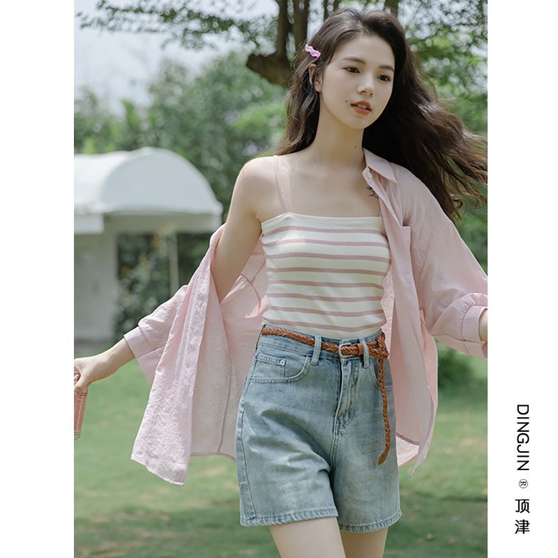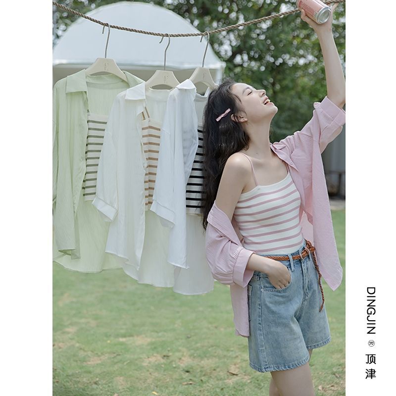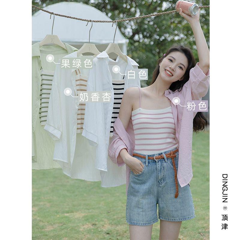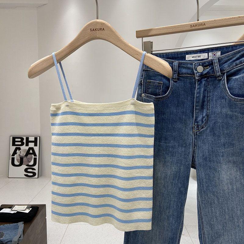 스트라이프 작은 조끼 슬링 여성의 봄과 가을 내베이스 셔츠 여자 여름 올매치 아름다운 뒤 짧은 니트 반팔 티셔츠