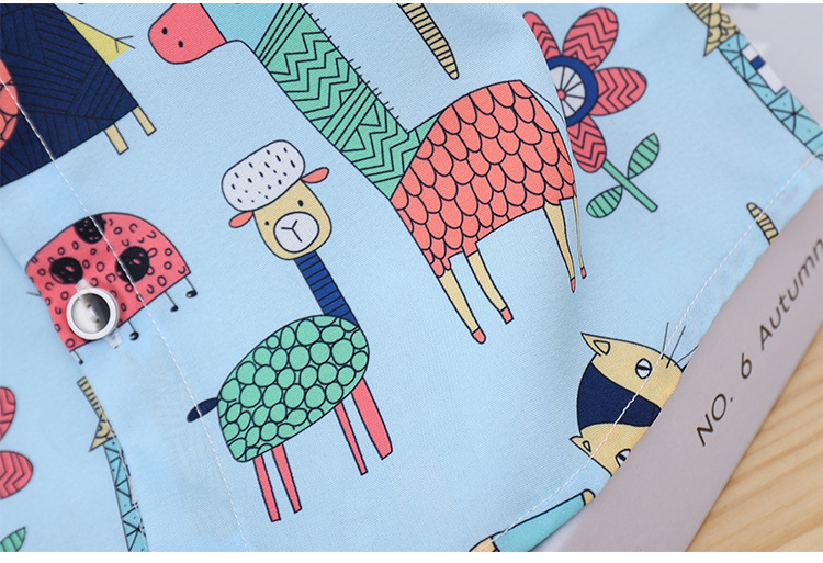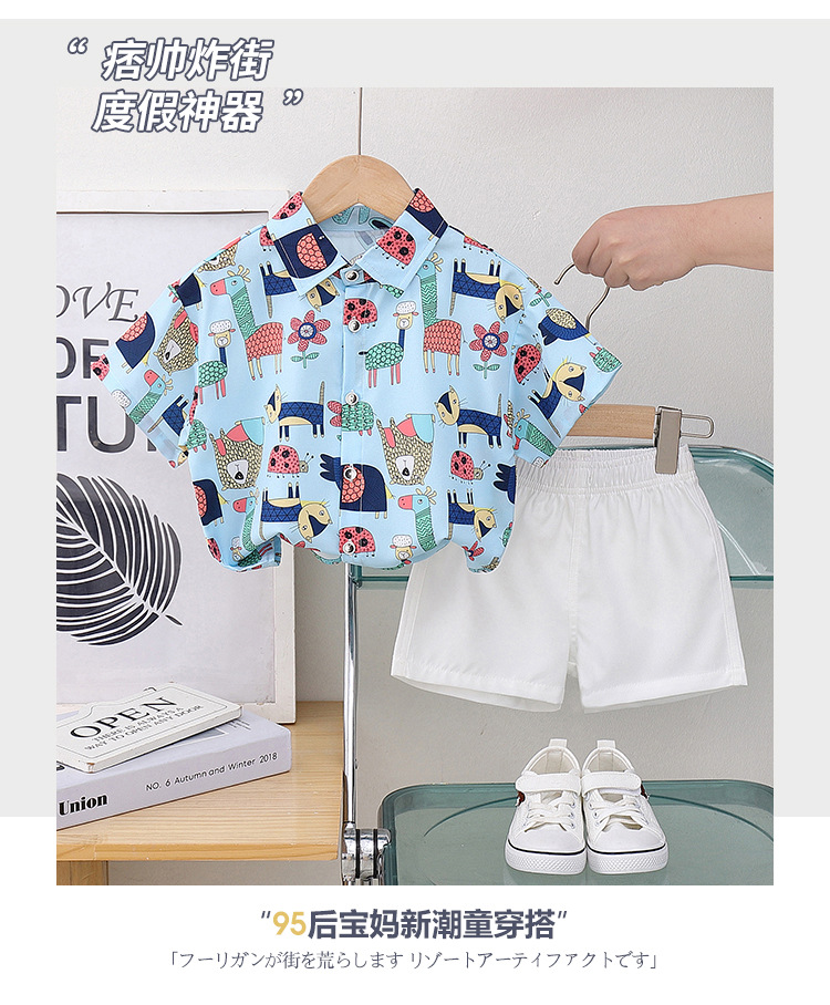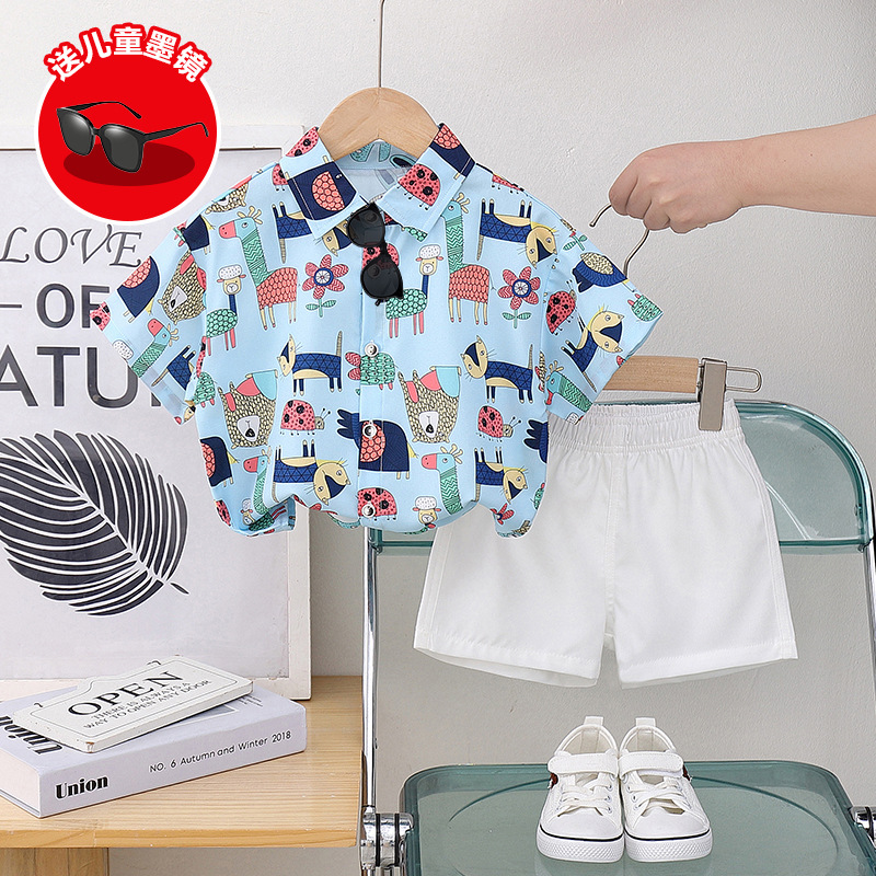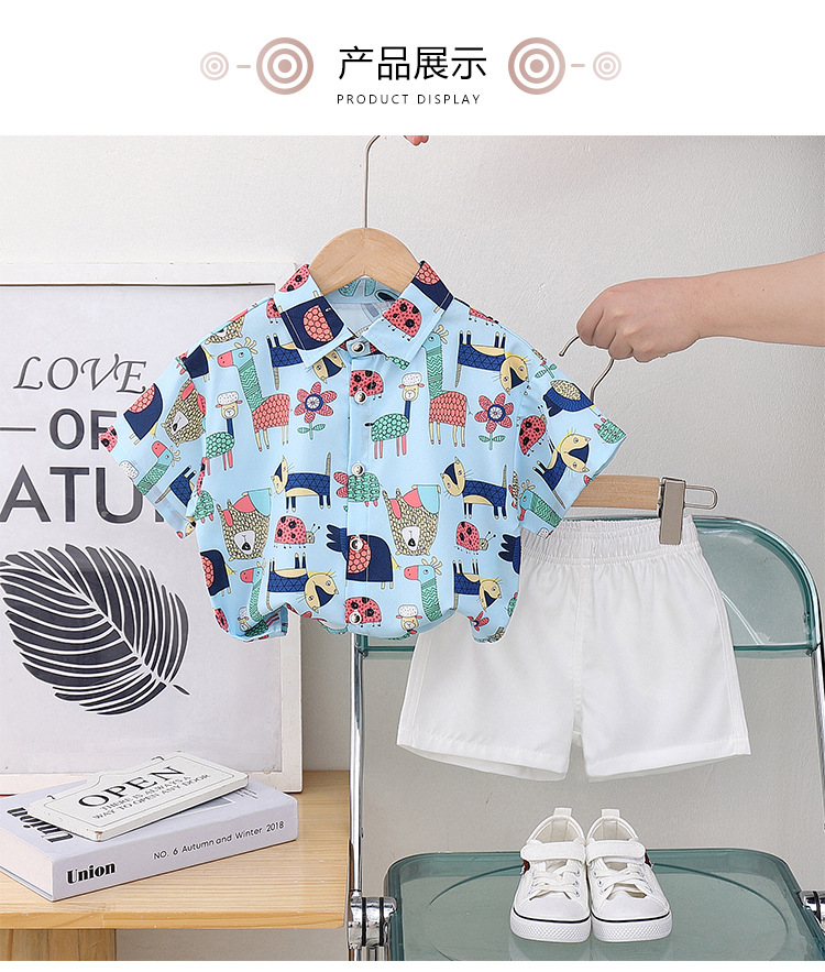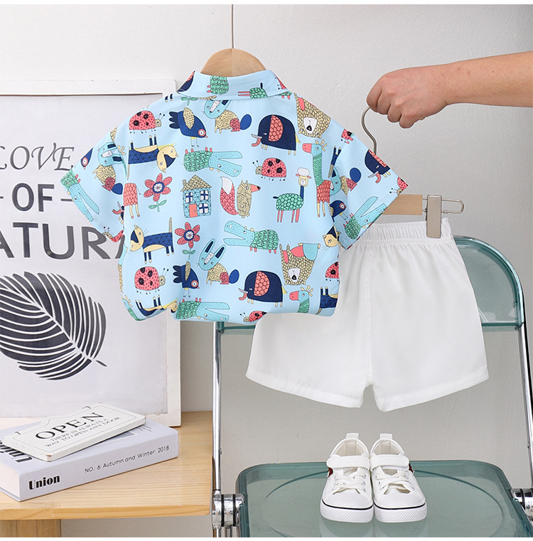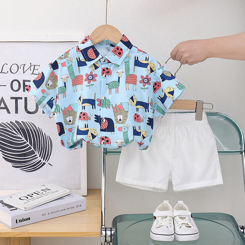 아동 의류 블루 동물 프린트 소년 반팔 셔츠 새로운 홍콩 스타일 캐주얼 셔츠 반바지 아동복 여름 의류