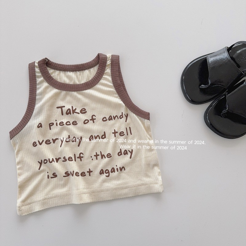 어린이 조끼 2024 아동복 여름 신상품 한국 스타일 아기 단색 문자 티셔츠 캐주얼 여아 민소매 라운드넥