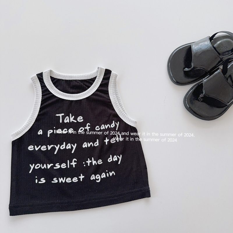 어린이 조끼 2024 아동복 여름 신상품 한국 스타일 아기 단색 문자 티셔츠 캐주얼 여아 민소매 라운드넥스토어 가기