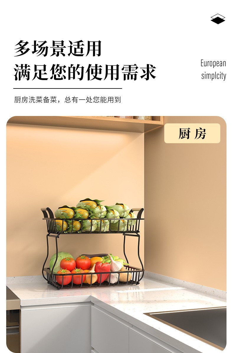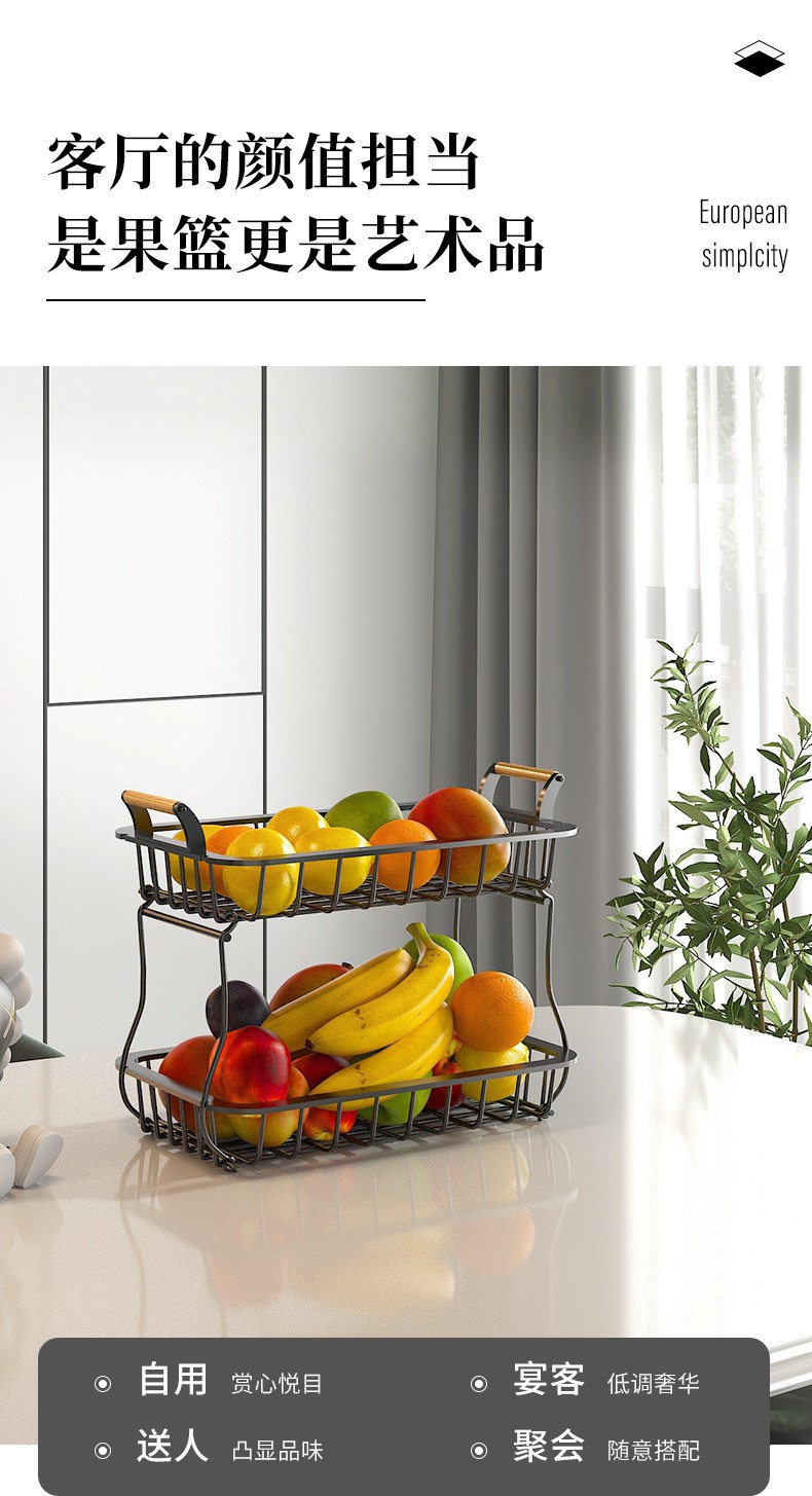나무 손잡이가있는 Amazon 크리 에이 티브 과일 바구니 랙 주방 보관 랙 이동식 조미료 랙 더블 레이어 바구니스토어 가기