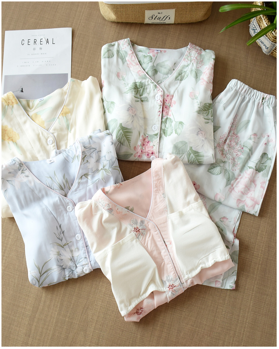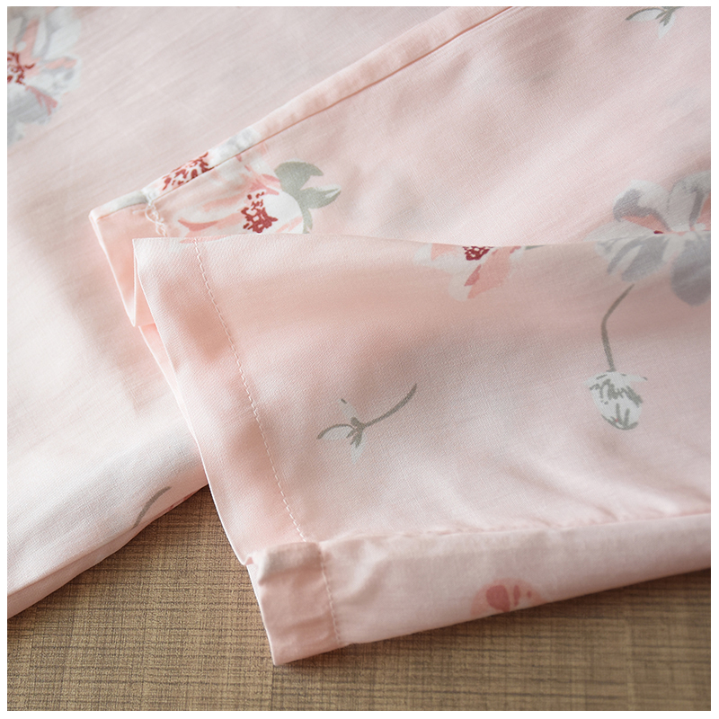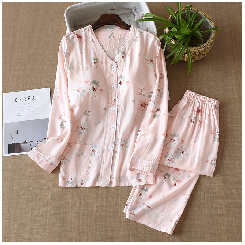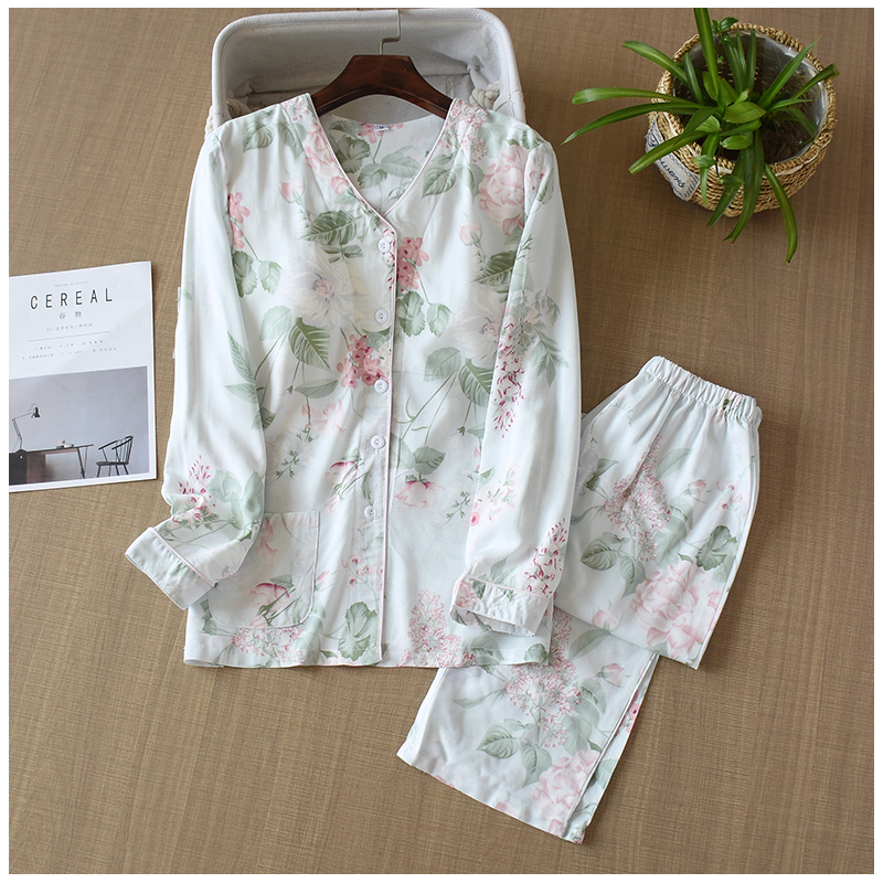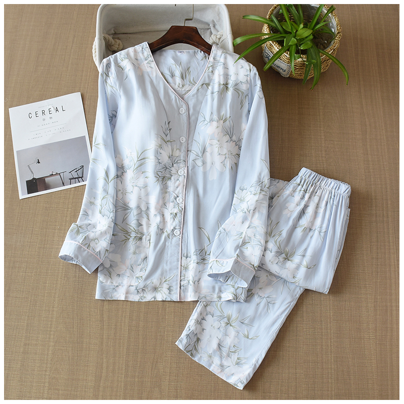 부드러운 면 실크 긴팔 홈 의류 세트 여성 여름 에어컨 의류 가슴 패드 잠옷 인공 면 얇은 봄과 가을스토어 가기