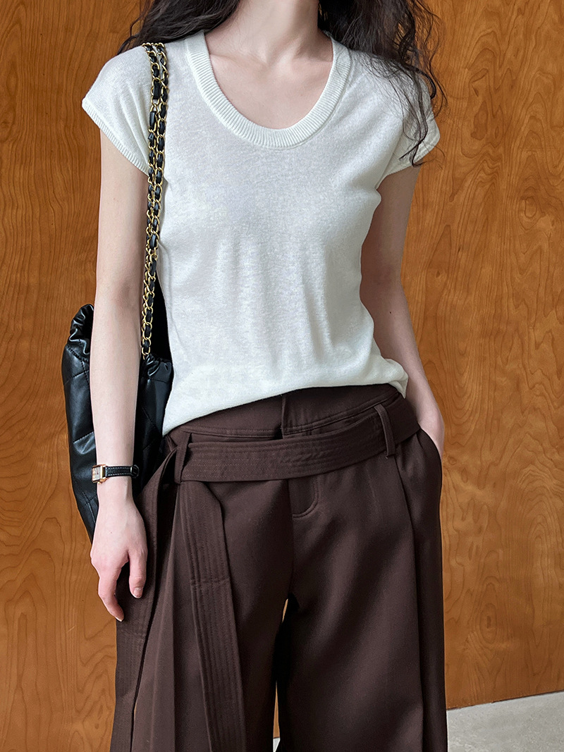 Luxi U-collar 작은 플라이 슬리브 스웨터 여성 봄과 여름 새로운 간단한 드롭 숄더 바닥 반팔 티셔츠 탑 얇은 ss396