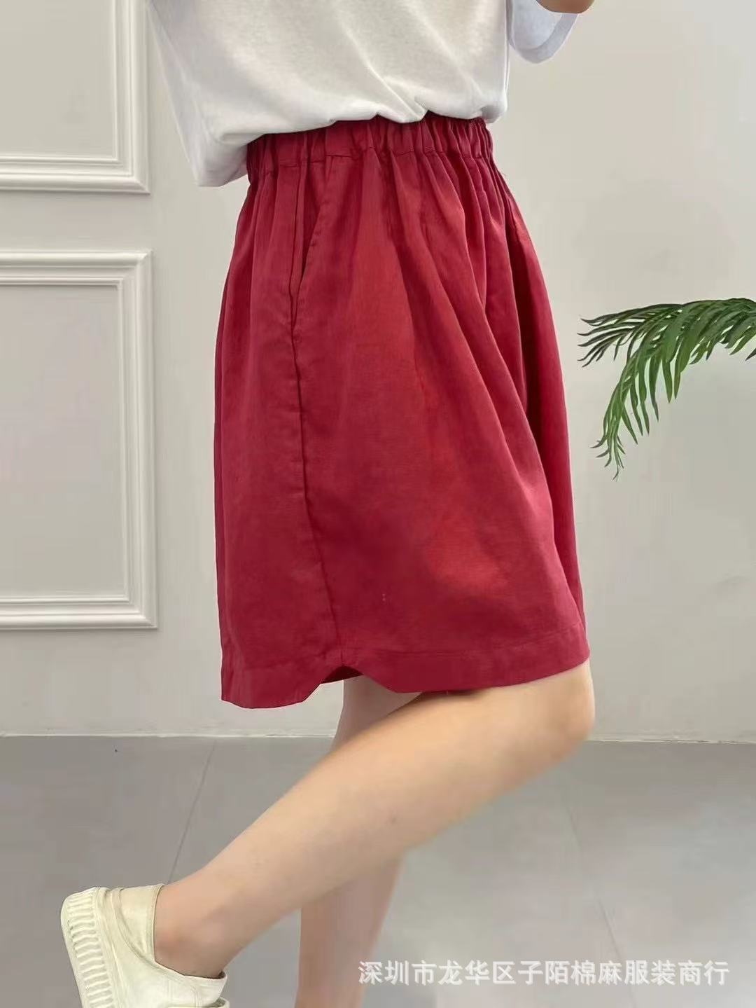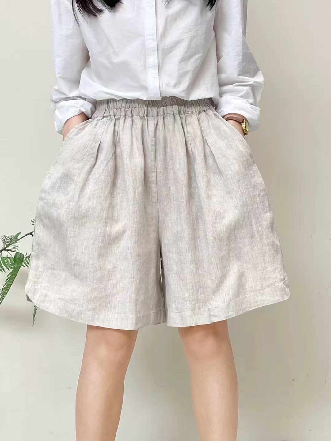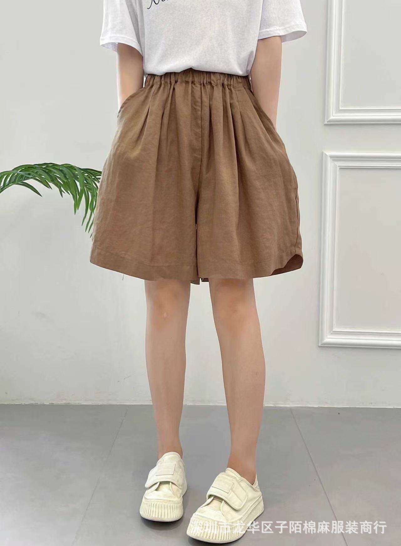 2025 여름 새로운 예술 레트로 린넨 단색 반바지 여성용 탄성 허리 3 점 바지 마이크로 탄성 여성용 캐주얼 바지스토어 가기