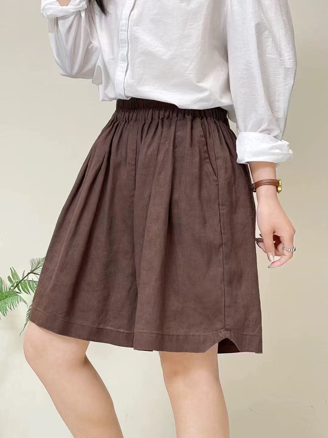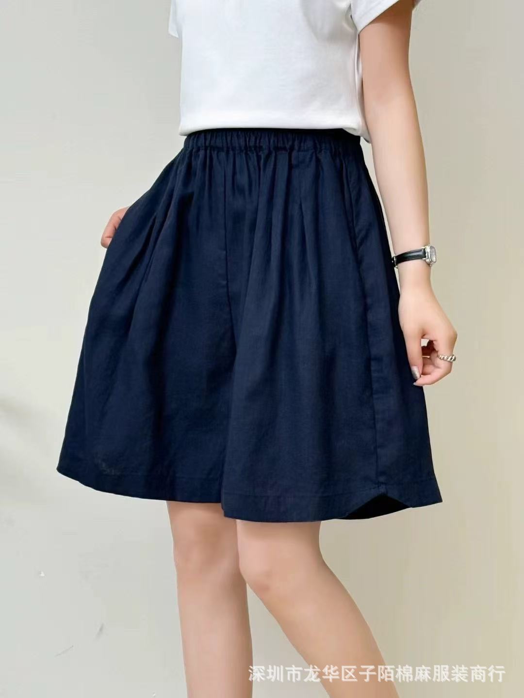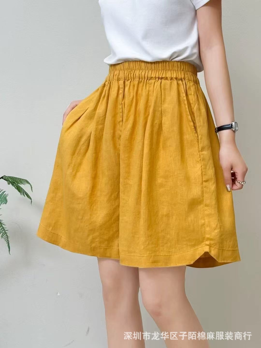 2025 여름 새로운 예술 레트로 린넨 단색 반바지 여성용 탄성 허리 3 점 바지 마이크로 탄성 여성용 캐주얼 바지스토어 가기