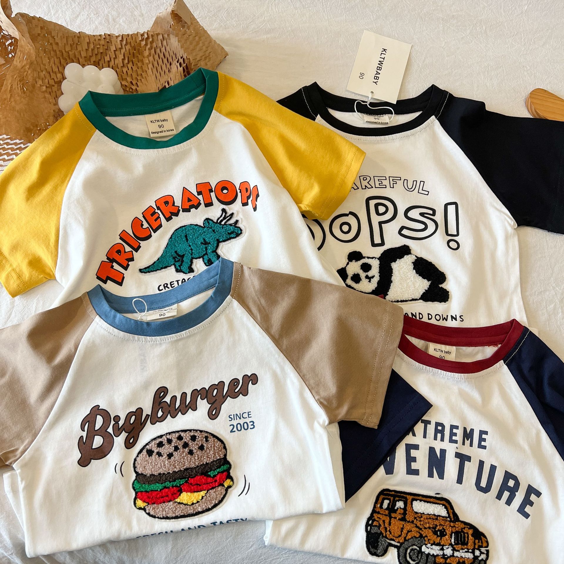 어린이 반팔 2024 여름 소년과 소녀 라운드 넥 탑 아기 만화 티셔츠 대비 컬러 티셔츠스토어 가기