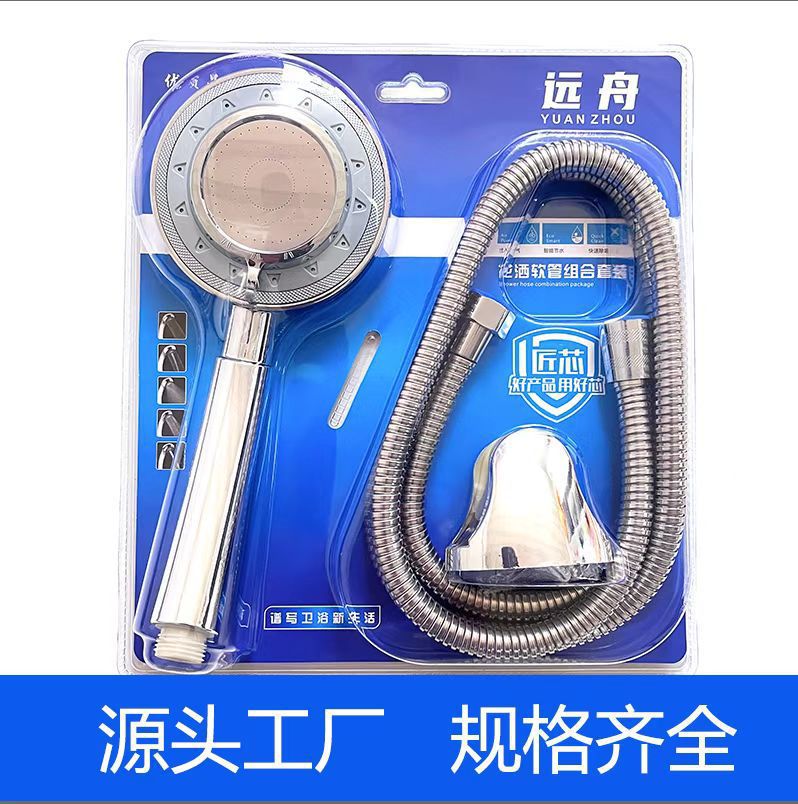 • 厂家批发花洒套装淋浴花洒增压喷头三件套花洒软管套装吸塑套装4.8折扣价:4.8