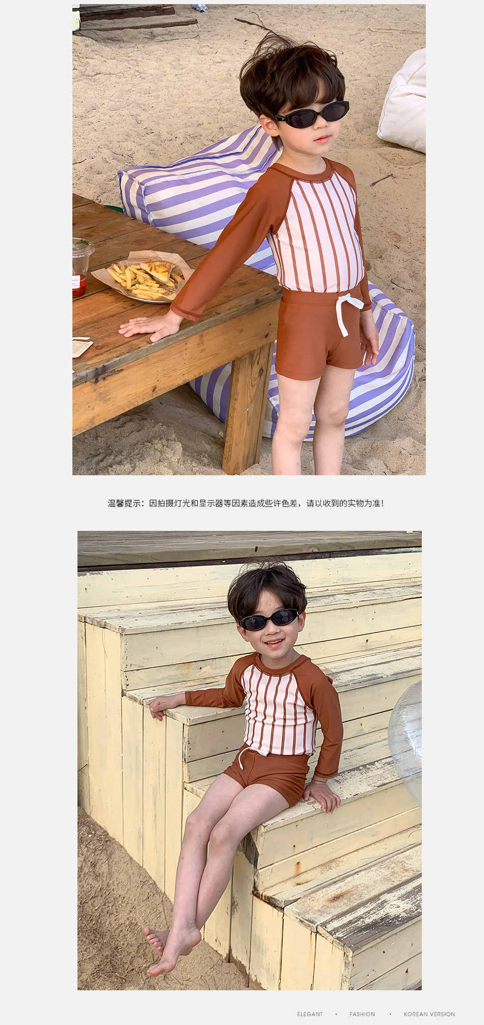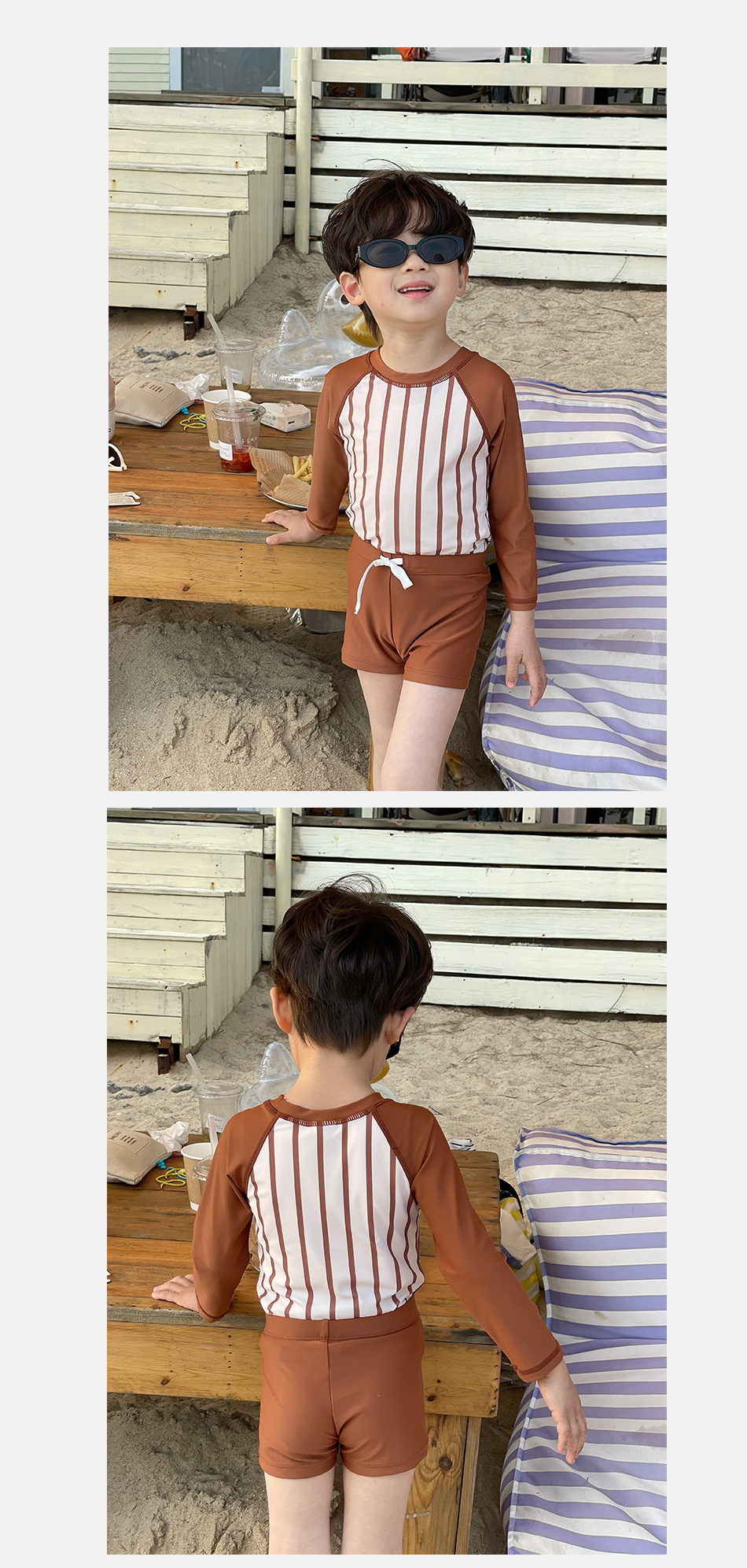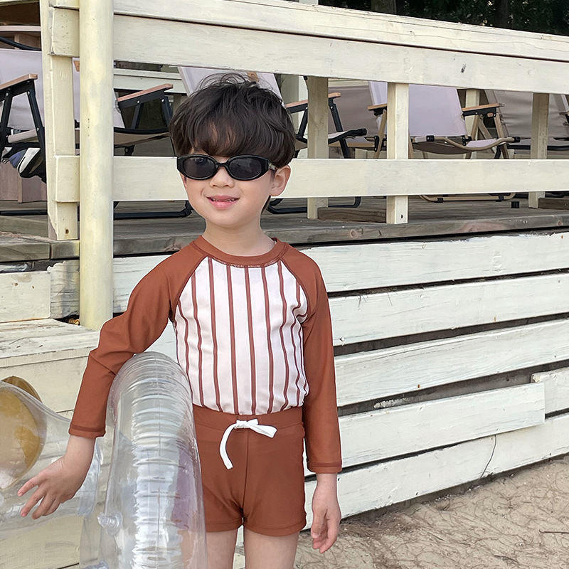 새로운 어린이 분할 아기 소년 한국 스타일 다크 브라운 줄무늬 긴 소매 태양 방지 빠른 건조 여름 수영복