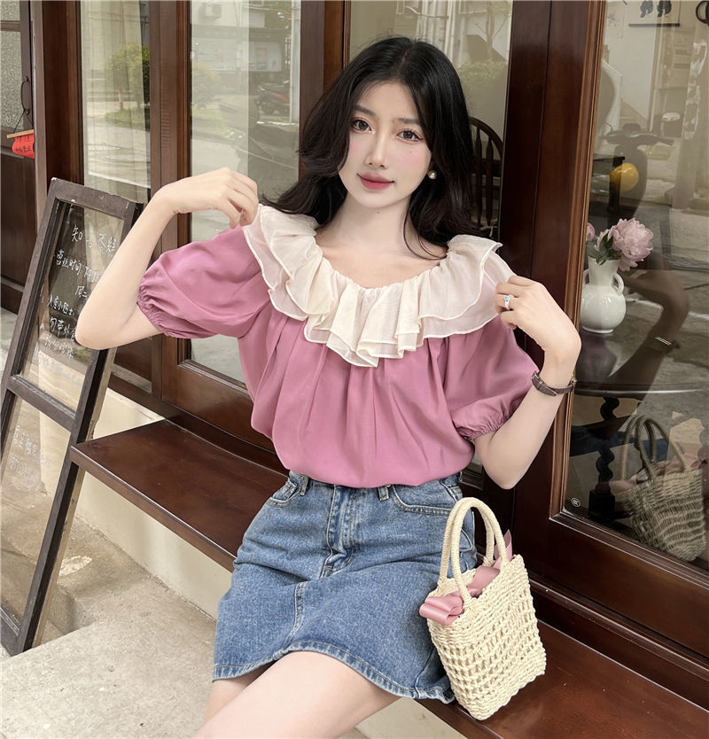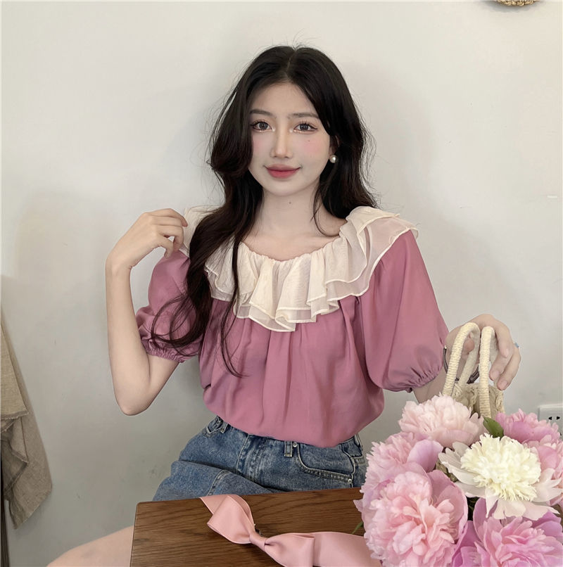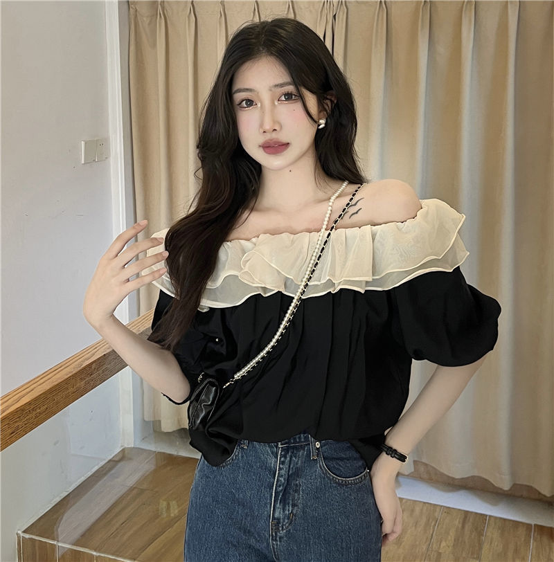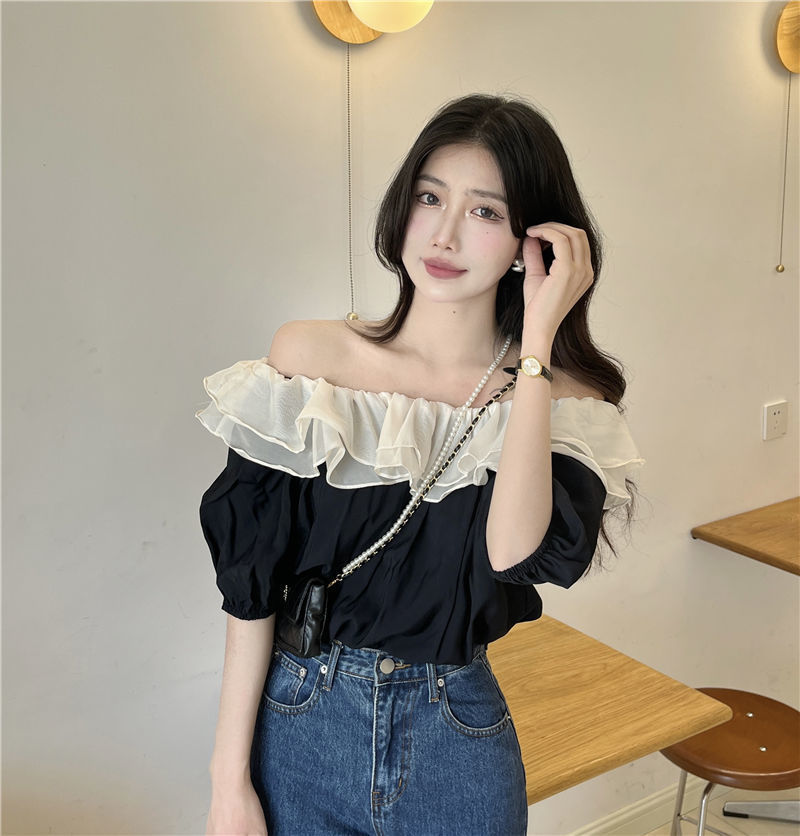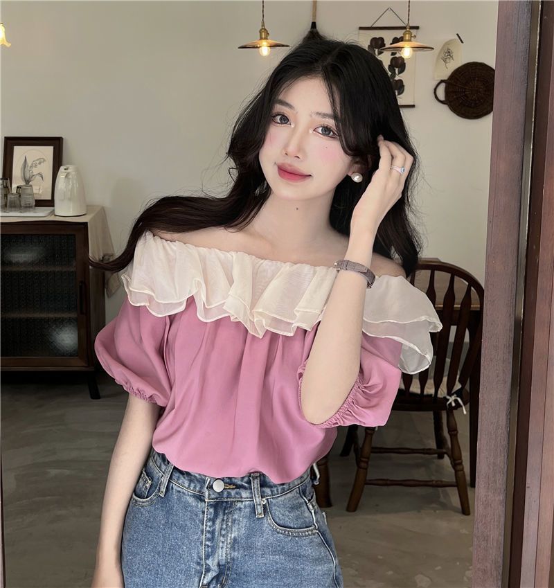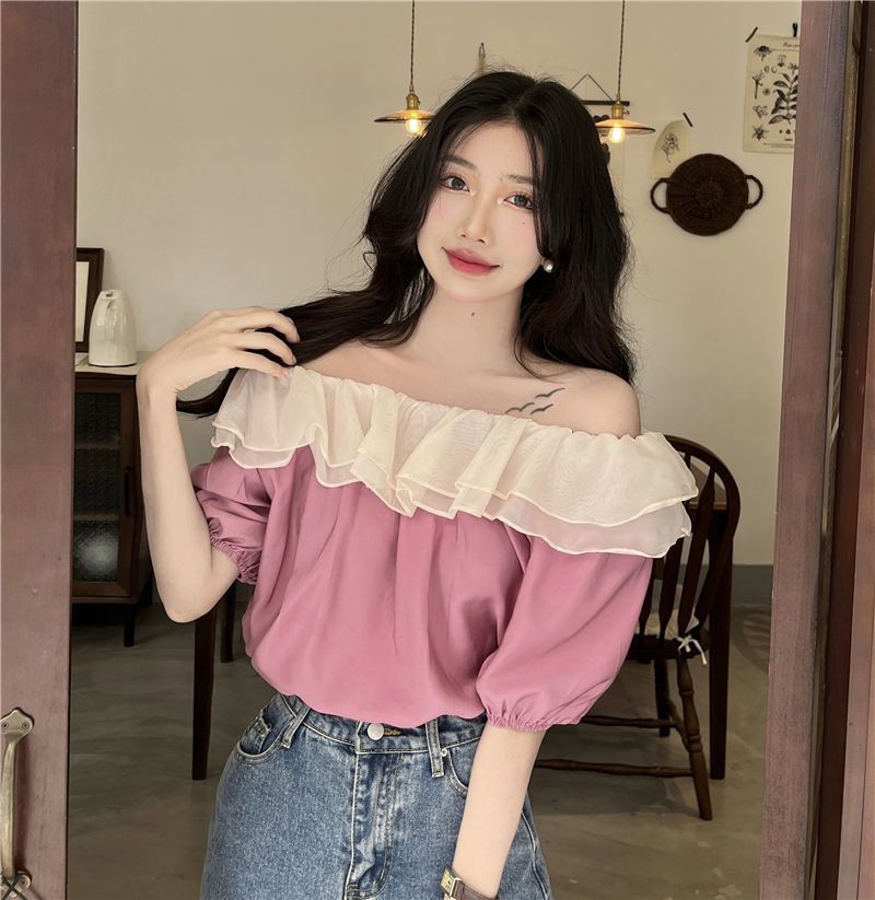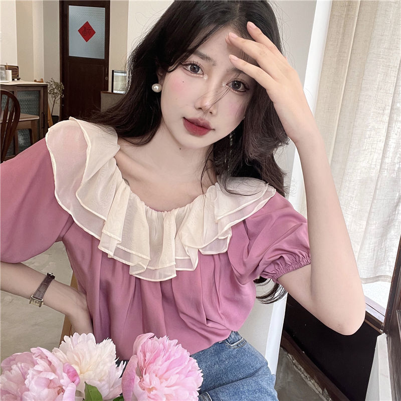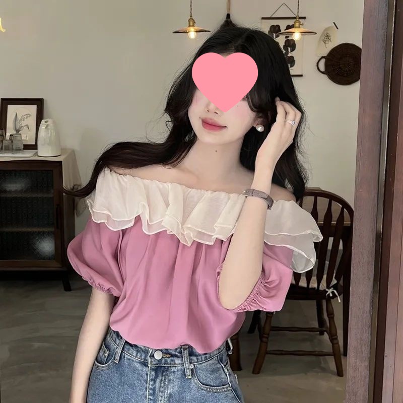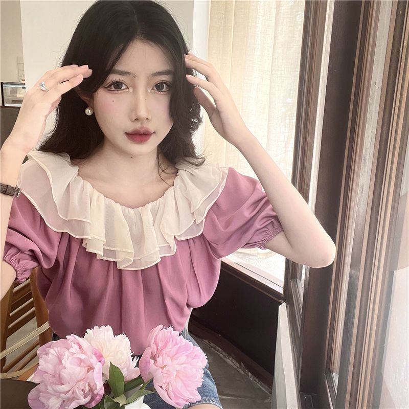 프랑스 스타일 쉬폰 반팔 셔츠 오프 숄더 탑 여성용 2024 여름 새로운 부드러운 바람 달콤한 셔츠 조수스토어 가기