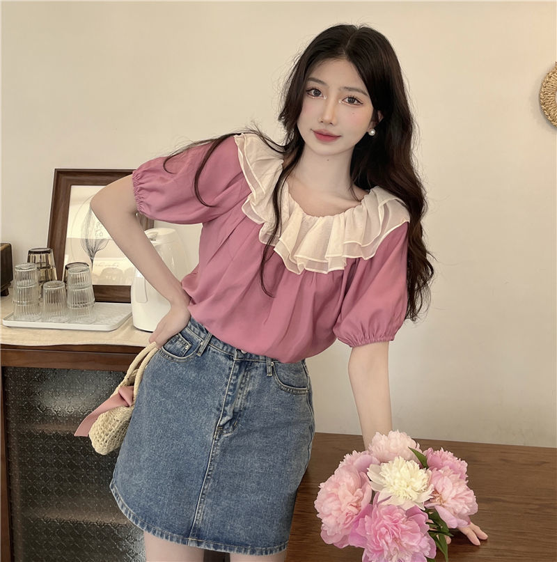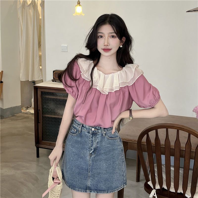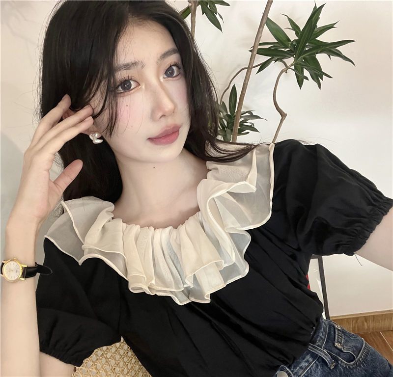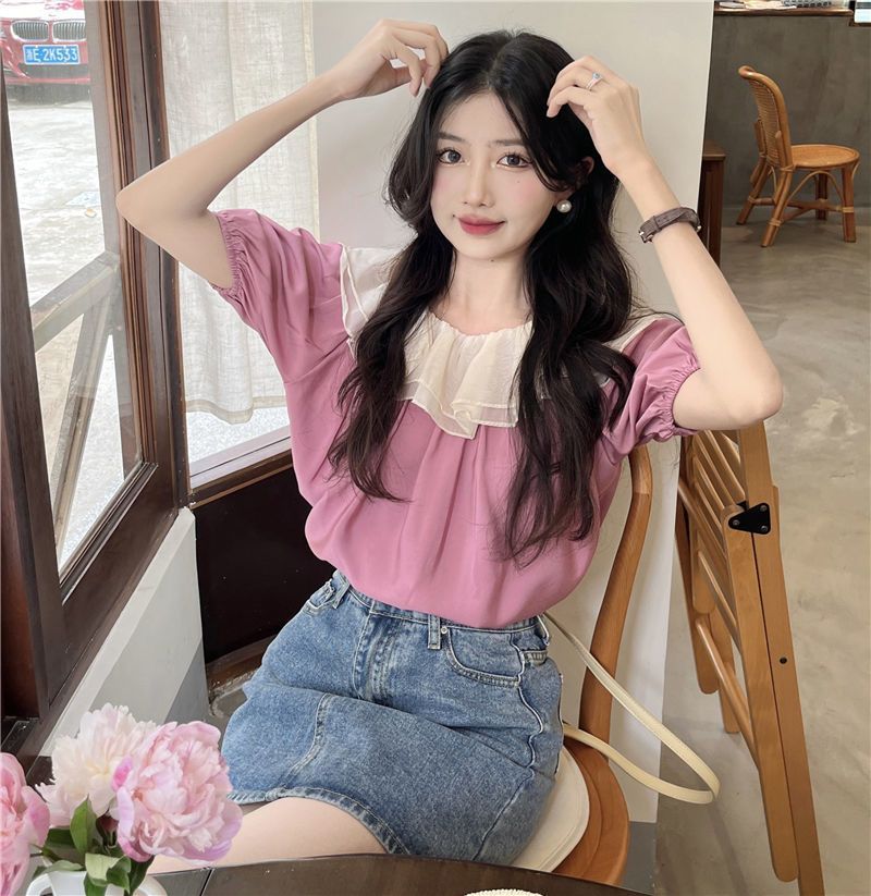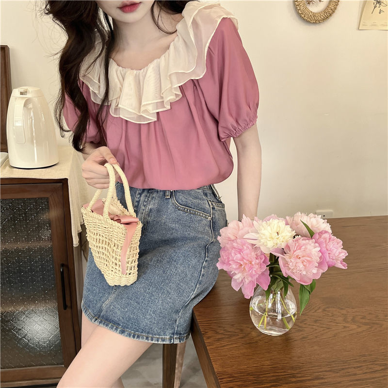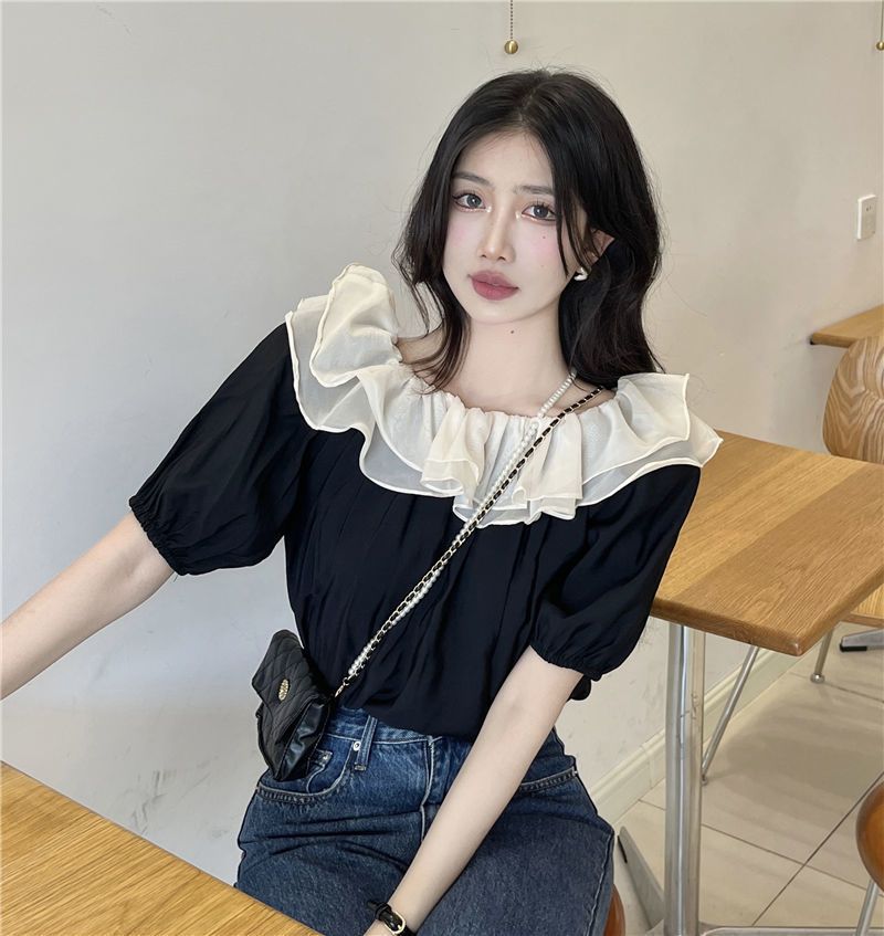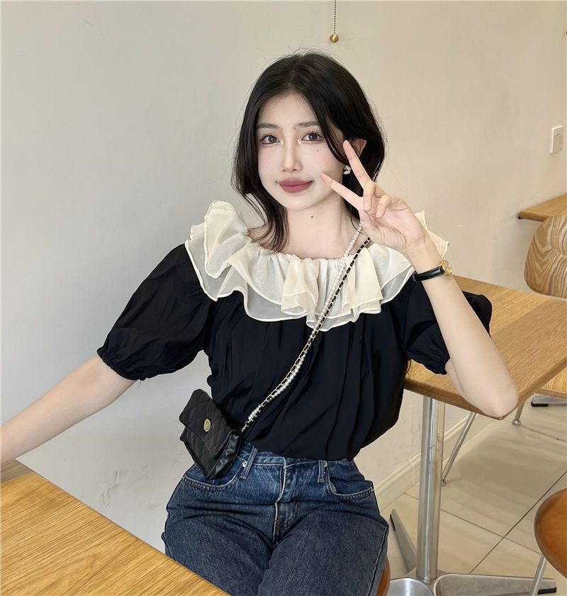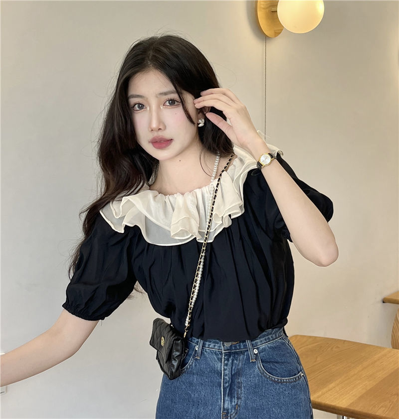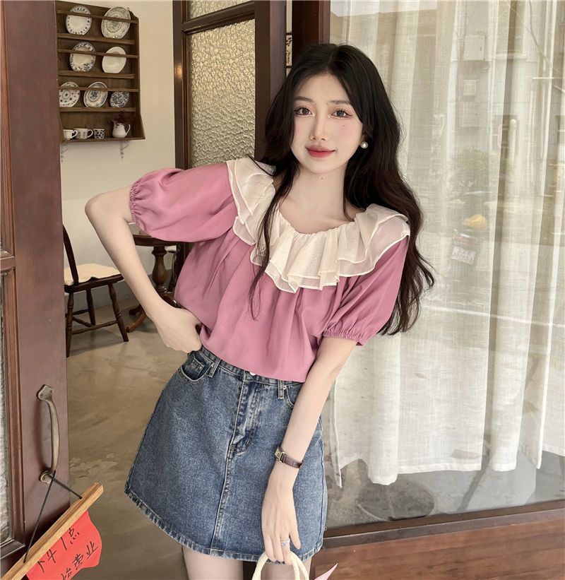 프랑스 스타일 쉬폰 반팔 셔츠 오프 숄더 탑 여성용 2024 여름 새로운 부드러운 바람 달콤한 셔츠 조수스토어 가기