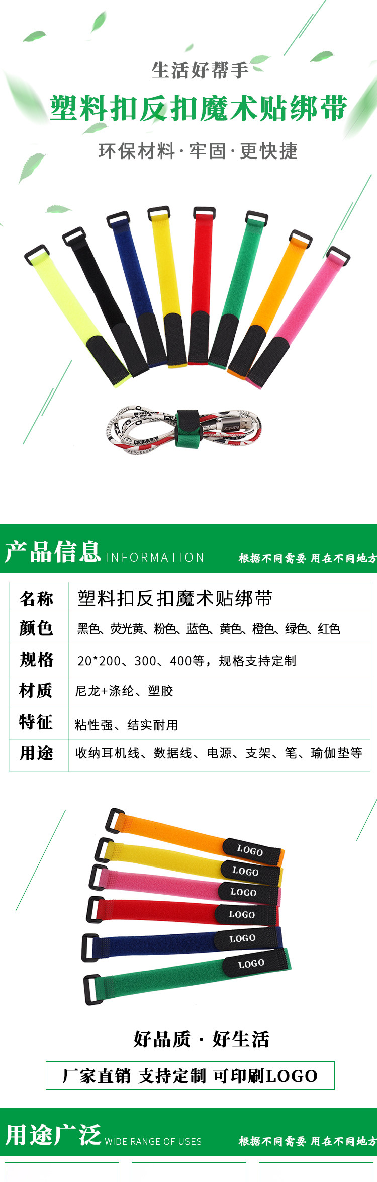 使用方法:用此绑带套住将要捆绑的物品,用带勾的一面从塑胶孔内穿过粘贴在另一面毛上即可.使用方便,可反复使用