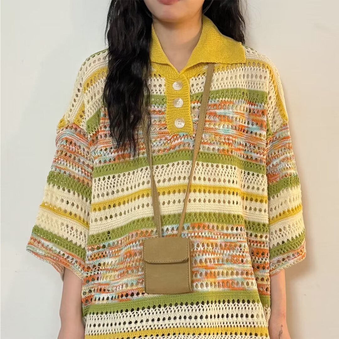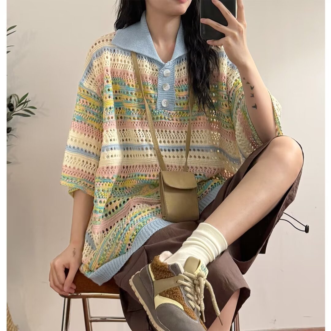 아메리칸 스타일 레트로 컬러 스트라이프 중공 니트웨어 봄과 여름 새로운 Lar Loose 캐주얼 셔츠 탑 트렌디 브랜드