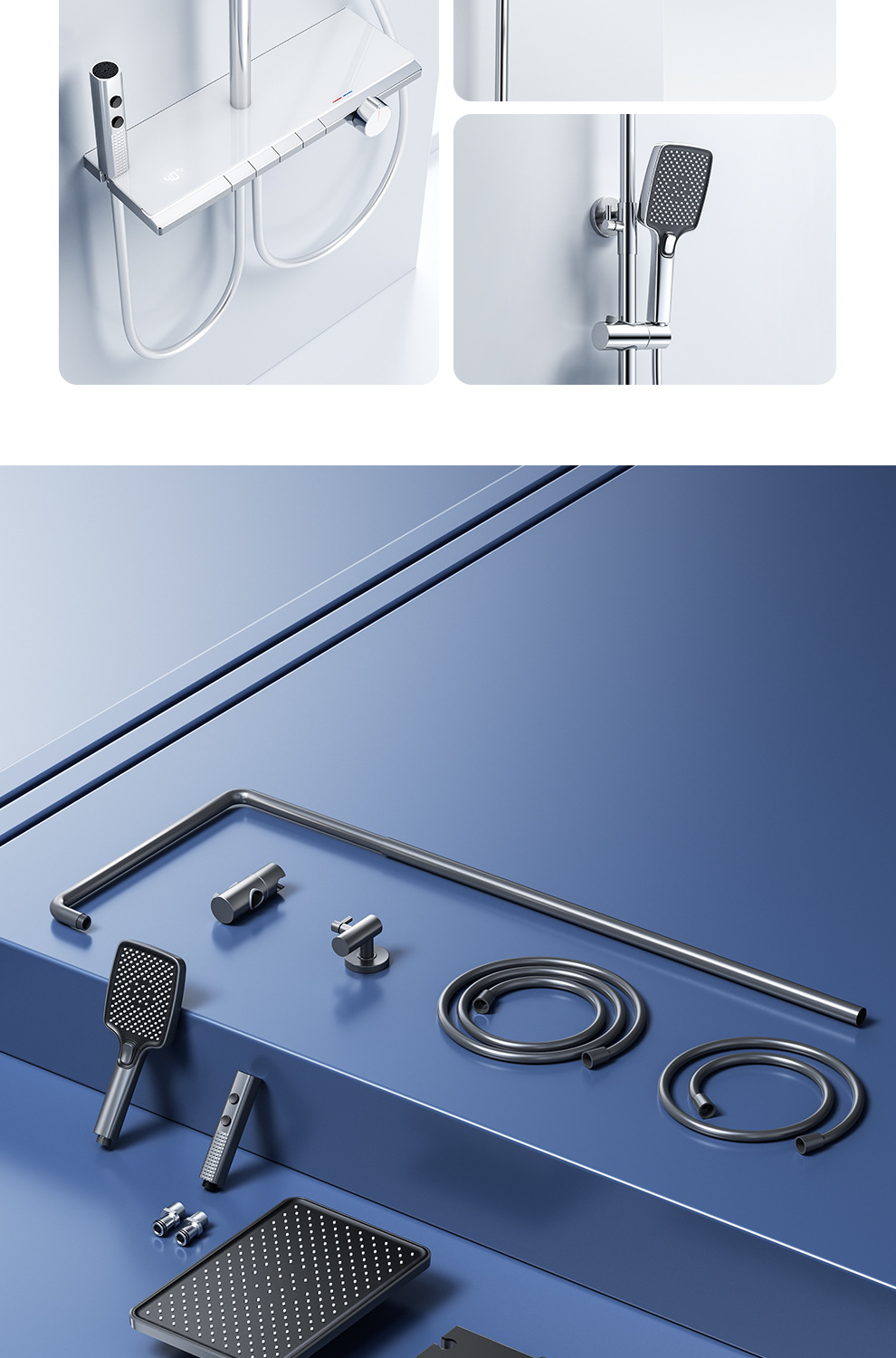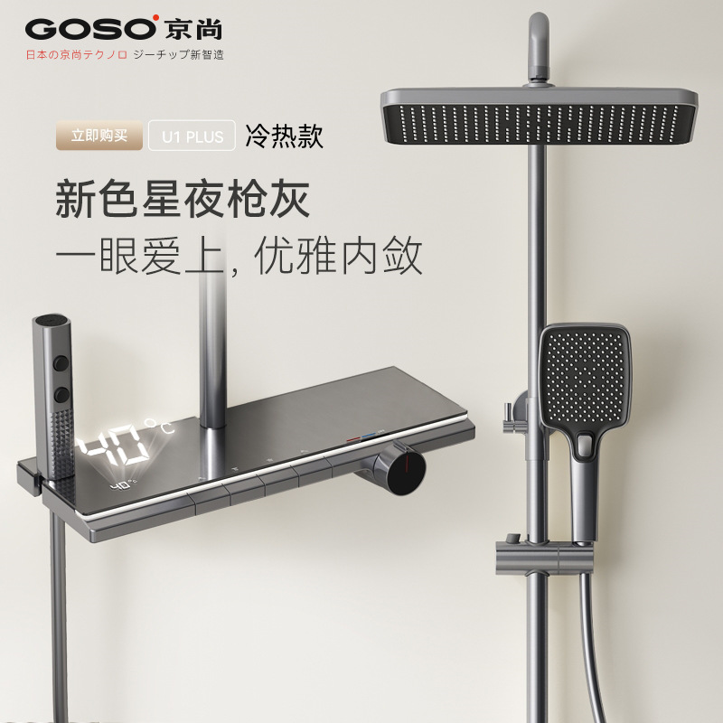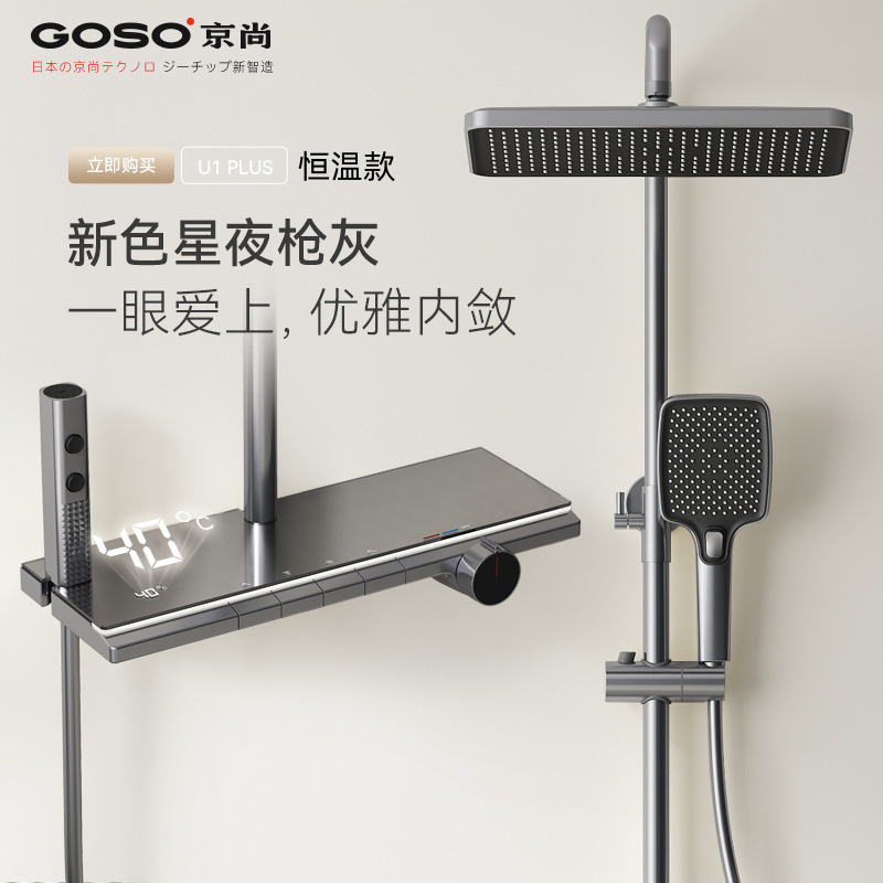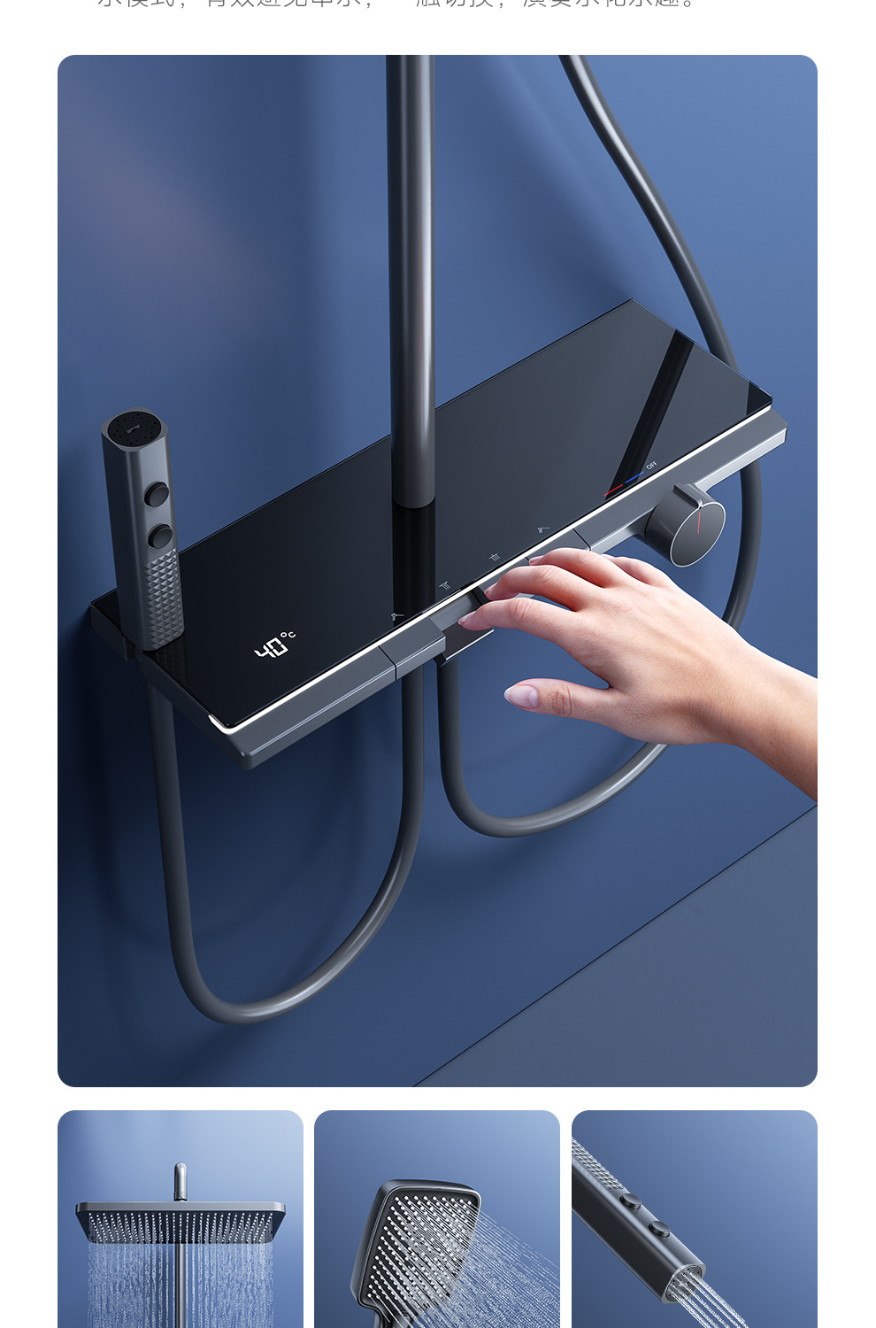 전동식 온도조절 기능이 있는 풀 코퍼 샤워기 세트, 고압 샤워헤드, 풀 코퍼 스마트 디지털 디스플레이, 건메탈 색상, 피아노 버튼 샤워기스토어 가기