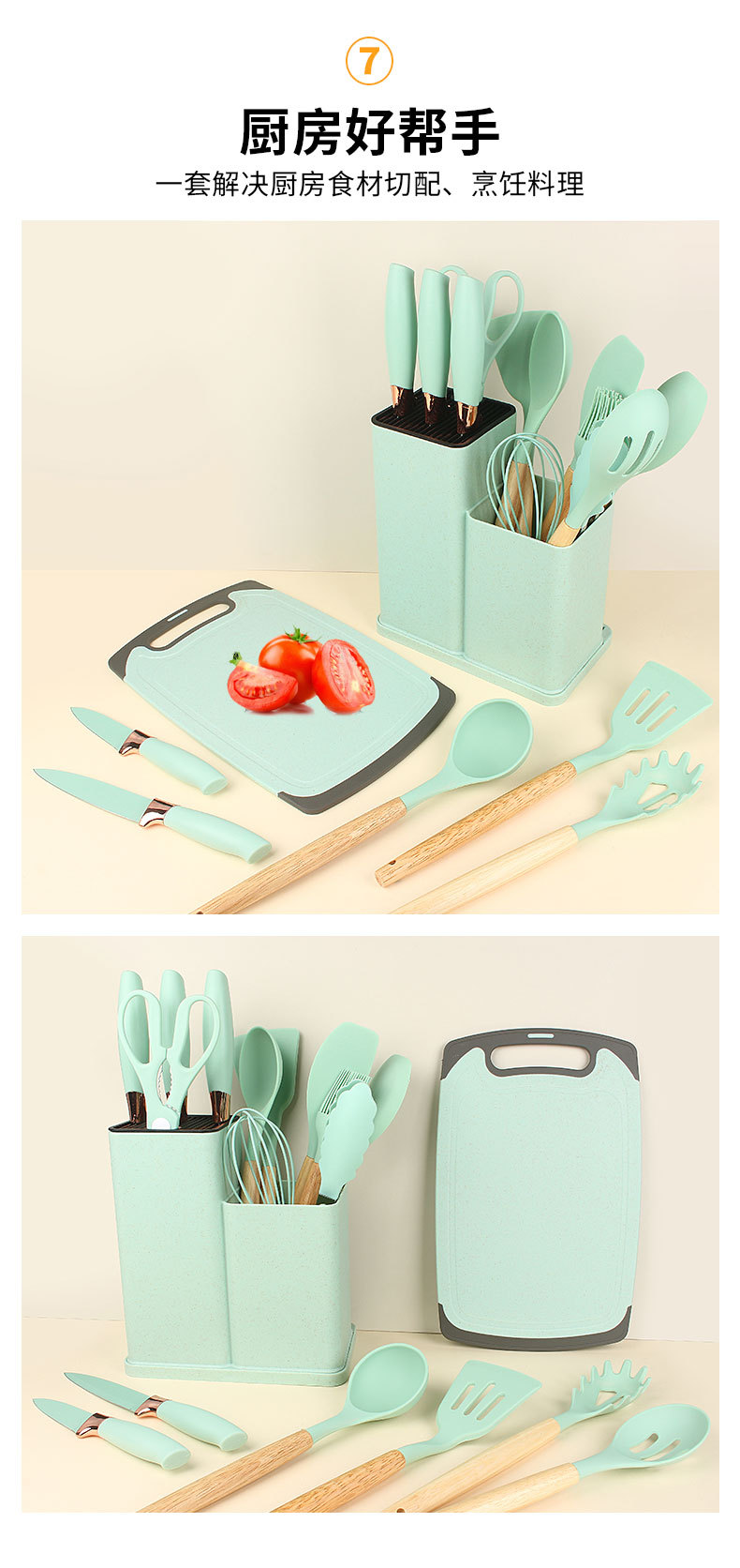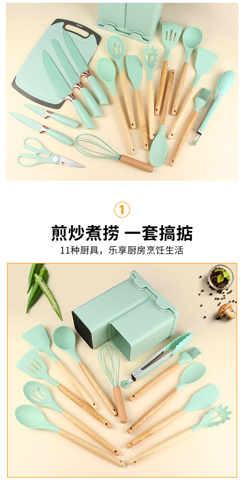 나무 손잡이 실리콘 주방용품 19 조각 저장 배럴 도구 조합 세트 공장 재고를 가진 비 스틱 요리 삽 세트스토어 가기