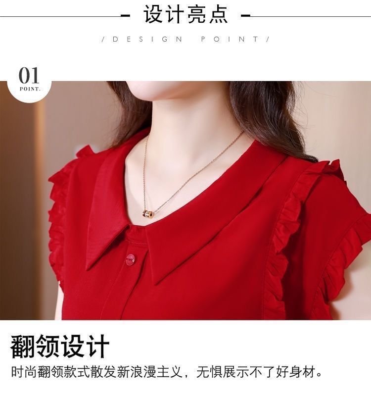 인형 칼라 쉬폰 셔츠 여성용 반팔 여름 스타일 연령 감소 벨리 커버 슬리밍 탑 솔리드 컬러 러플 셔츠스토어 가기
