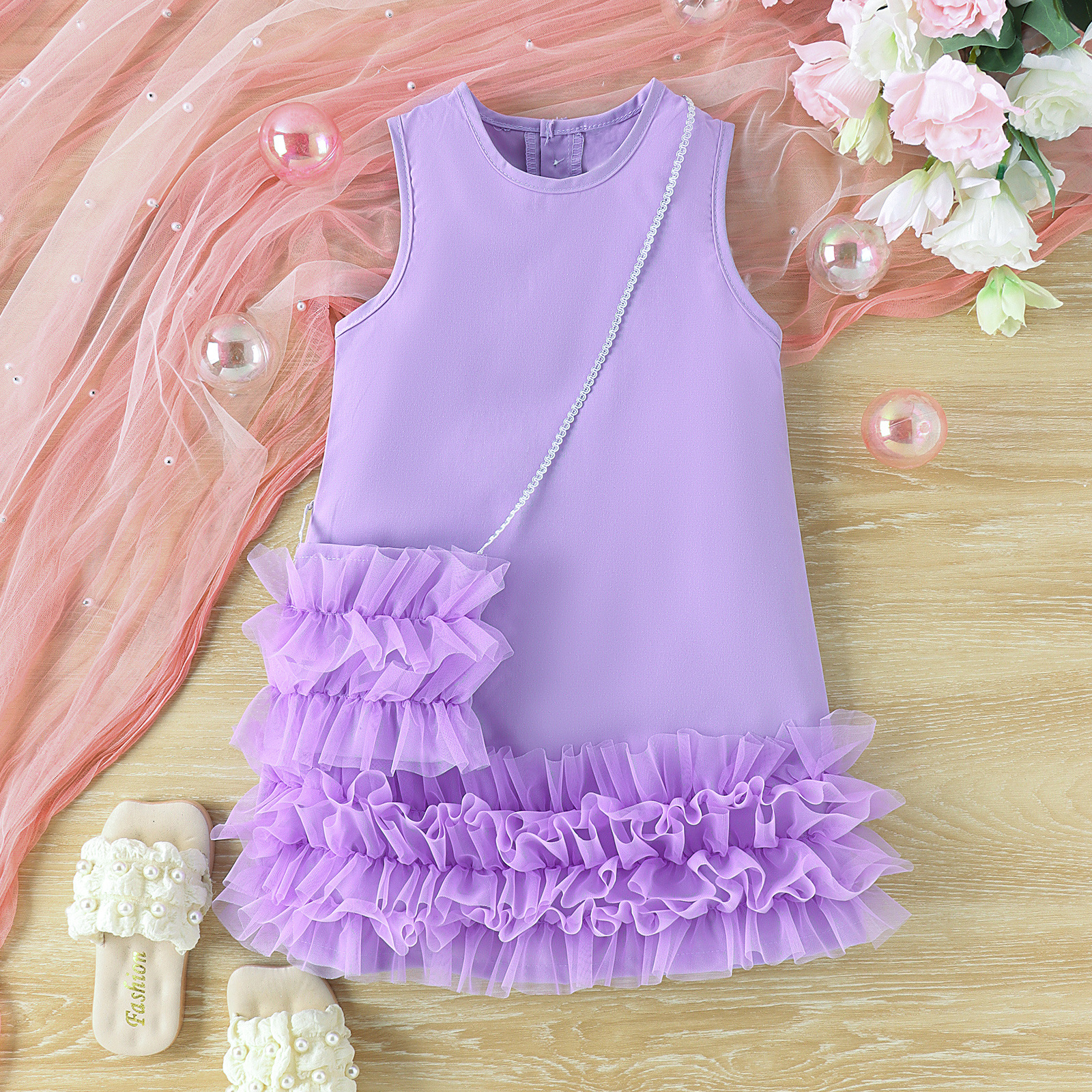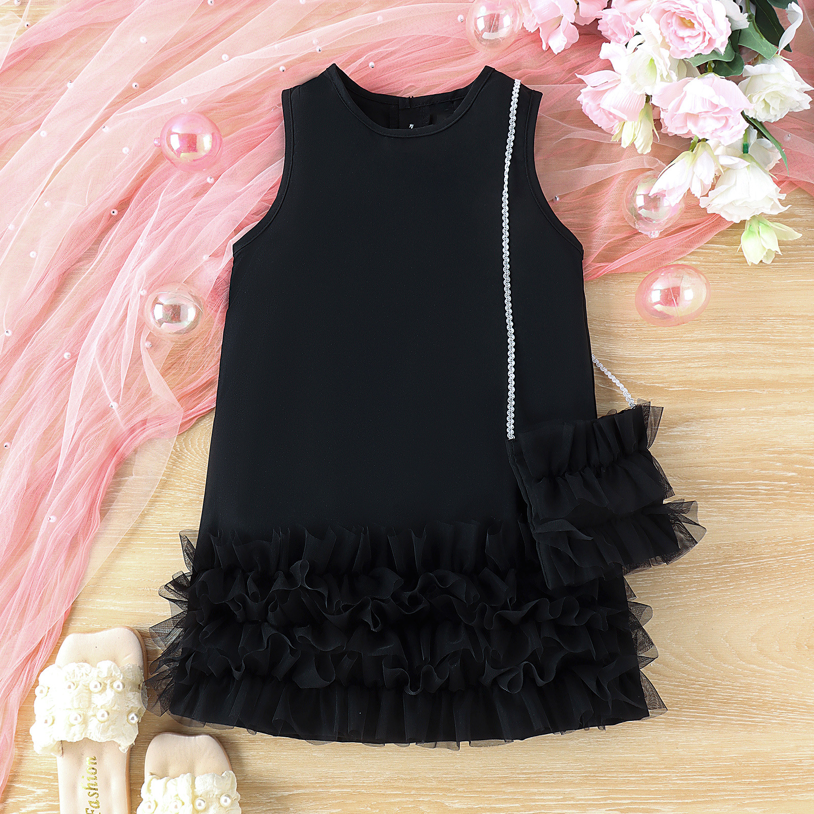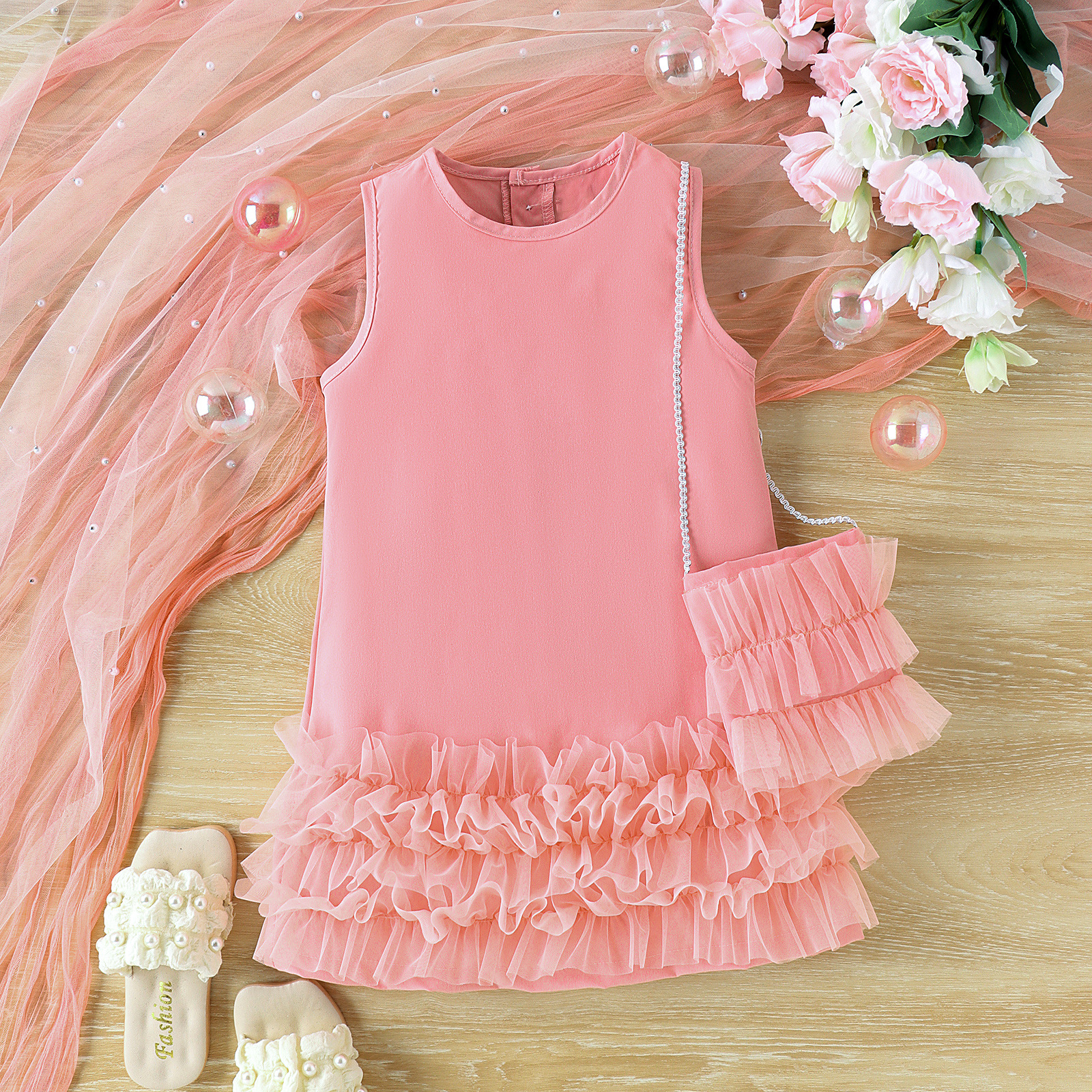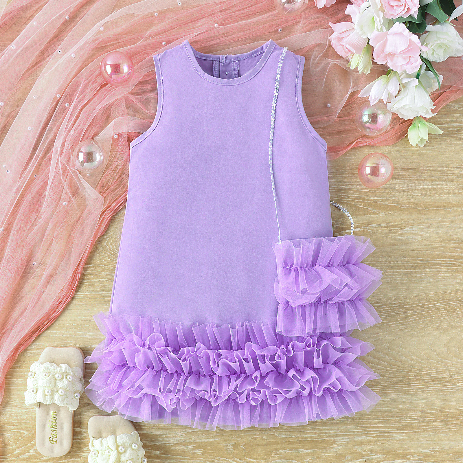 2024 여름 새로운 트렌디 아동복 국경 중소 어린이 소녀 민소매 메쉬 케이크 원피스 가방