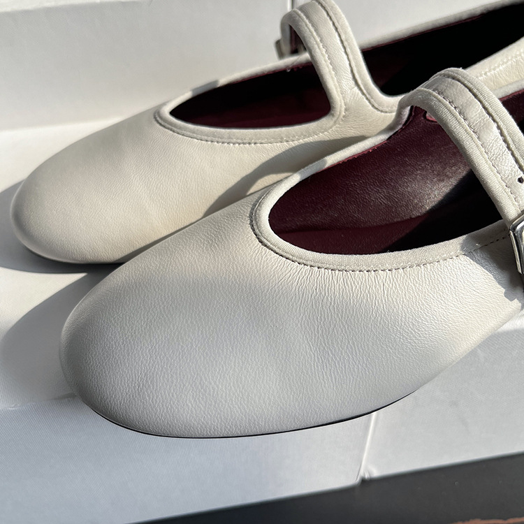 정품 가죽 레트로 얕은 플랫 버클 벨트 메리 제인 신발 여성 봄과 여름 캐주얼 발레 신발 밀크 신발