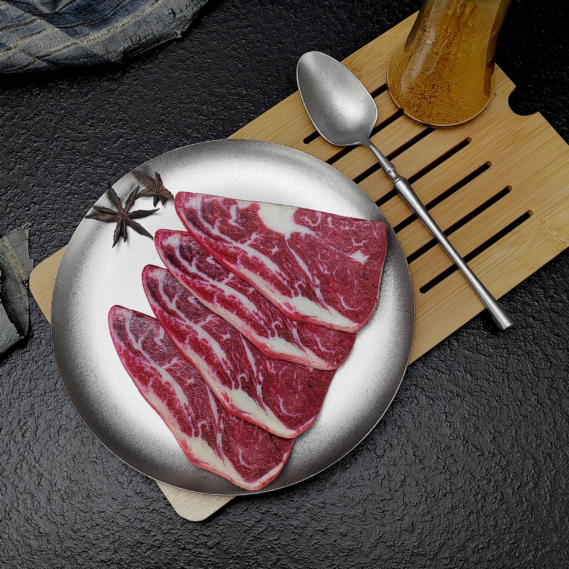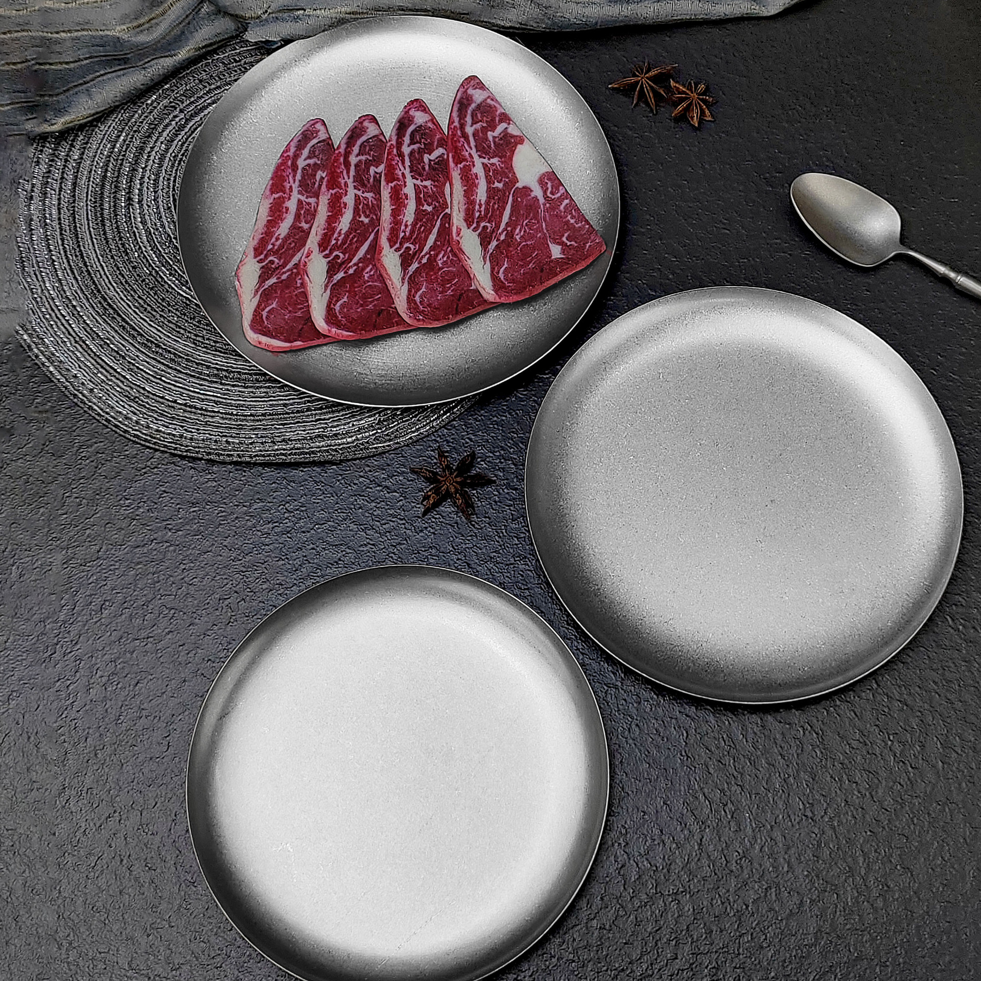 빈티지 스테인레스 스틸 디스크 카페 트레이 디저트 과일 플레이트 바베큐 플레이트 오래 된 서양 식품 플레이트 침 뼈 플레이트