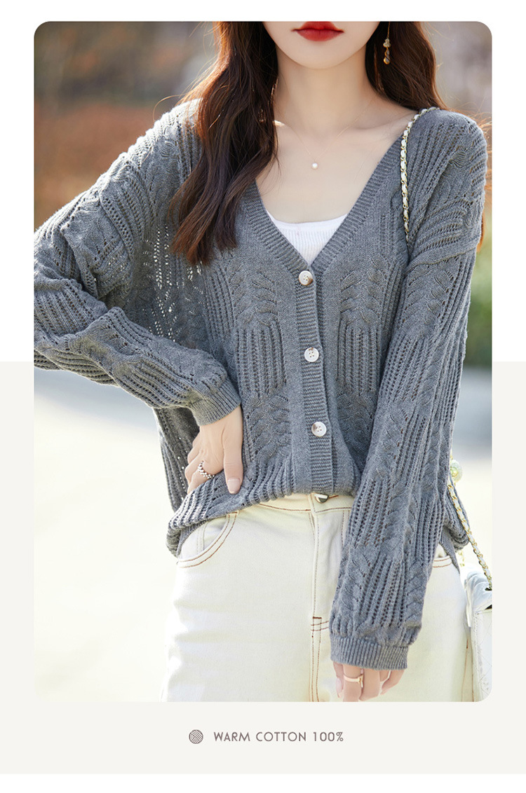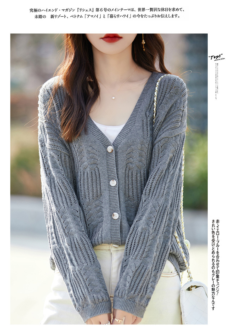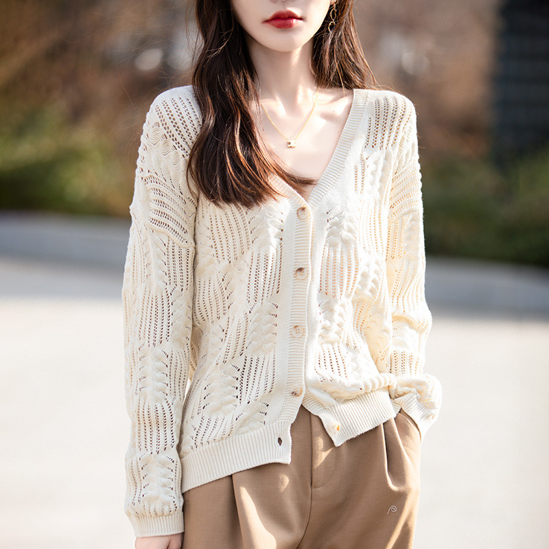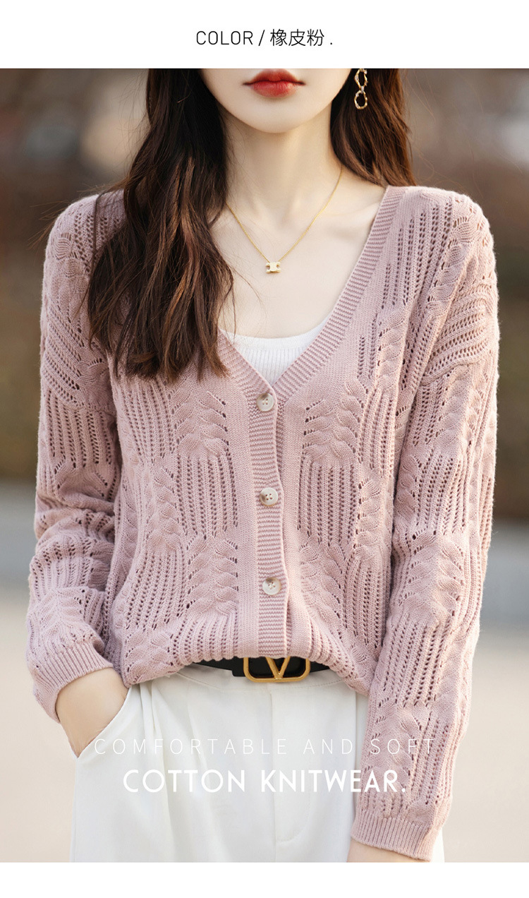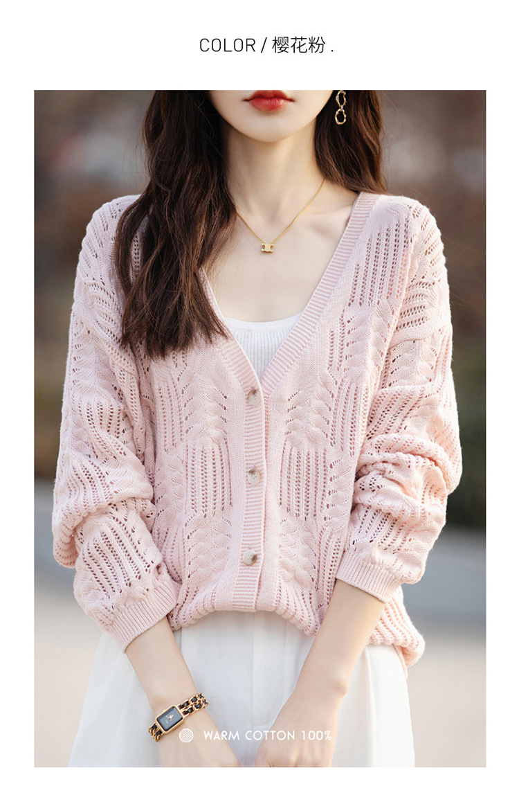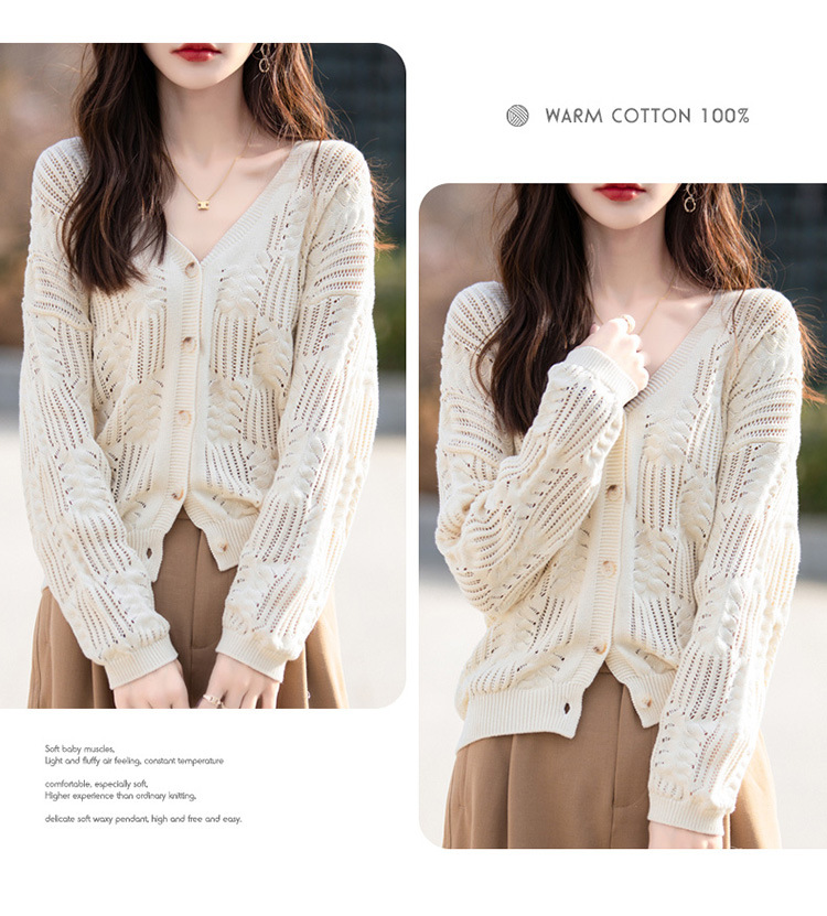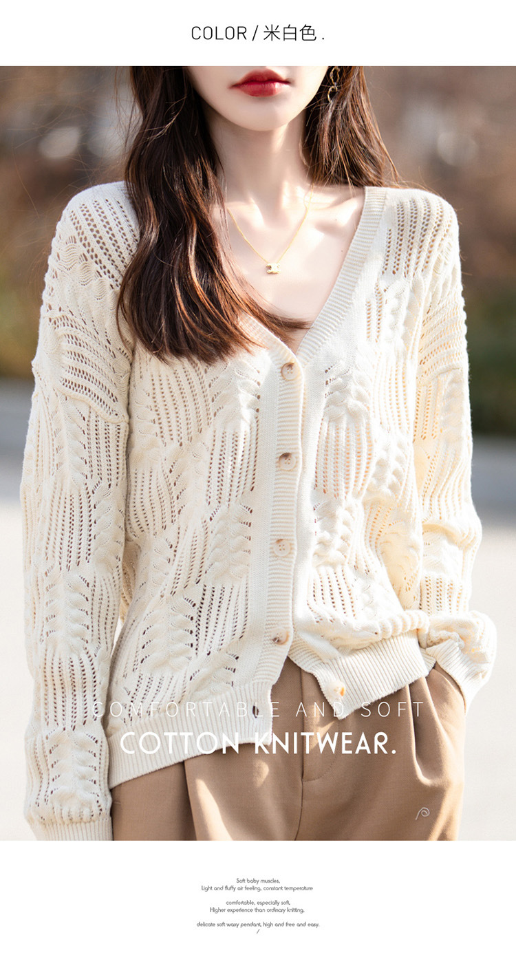 24 봄과 가을 새로운 코튼 라운드 넥 니트 카디건 여성 할로우 패션 우아한 느슨한 니트 코트 탑