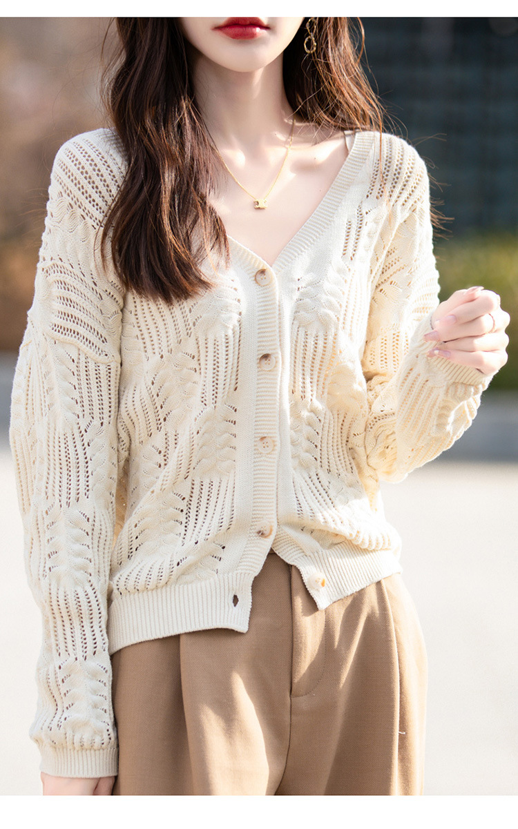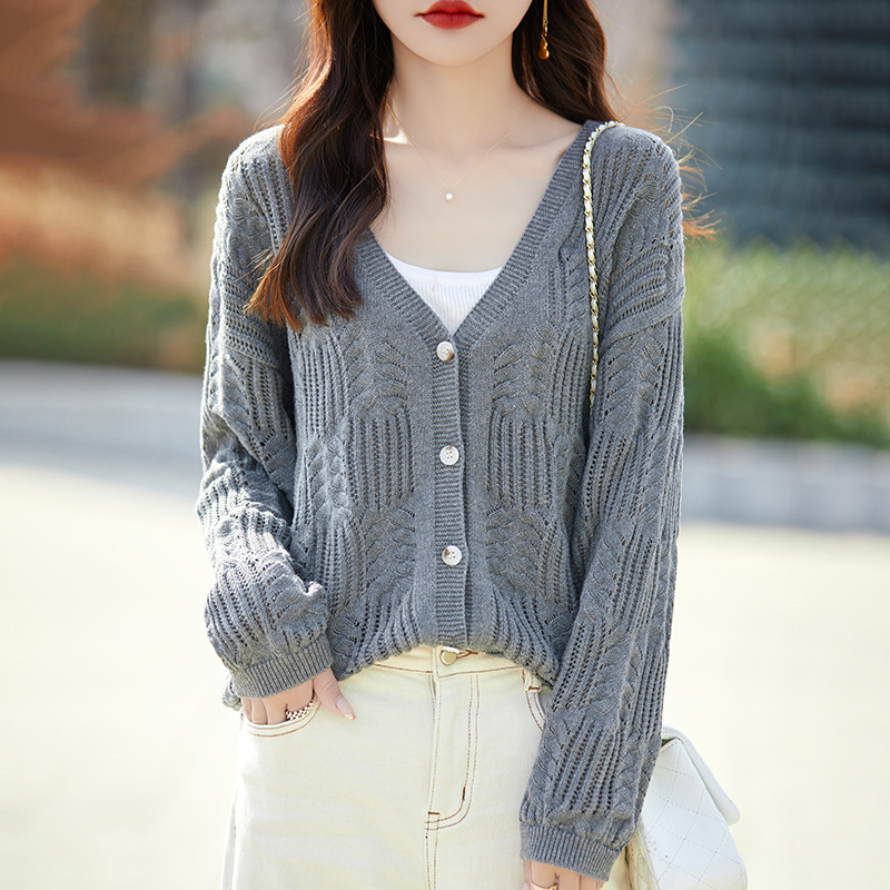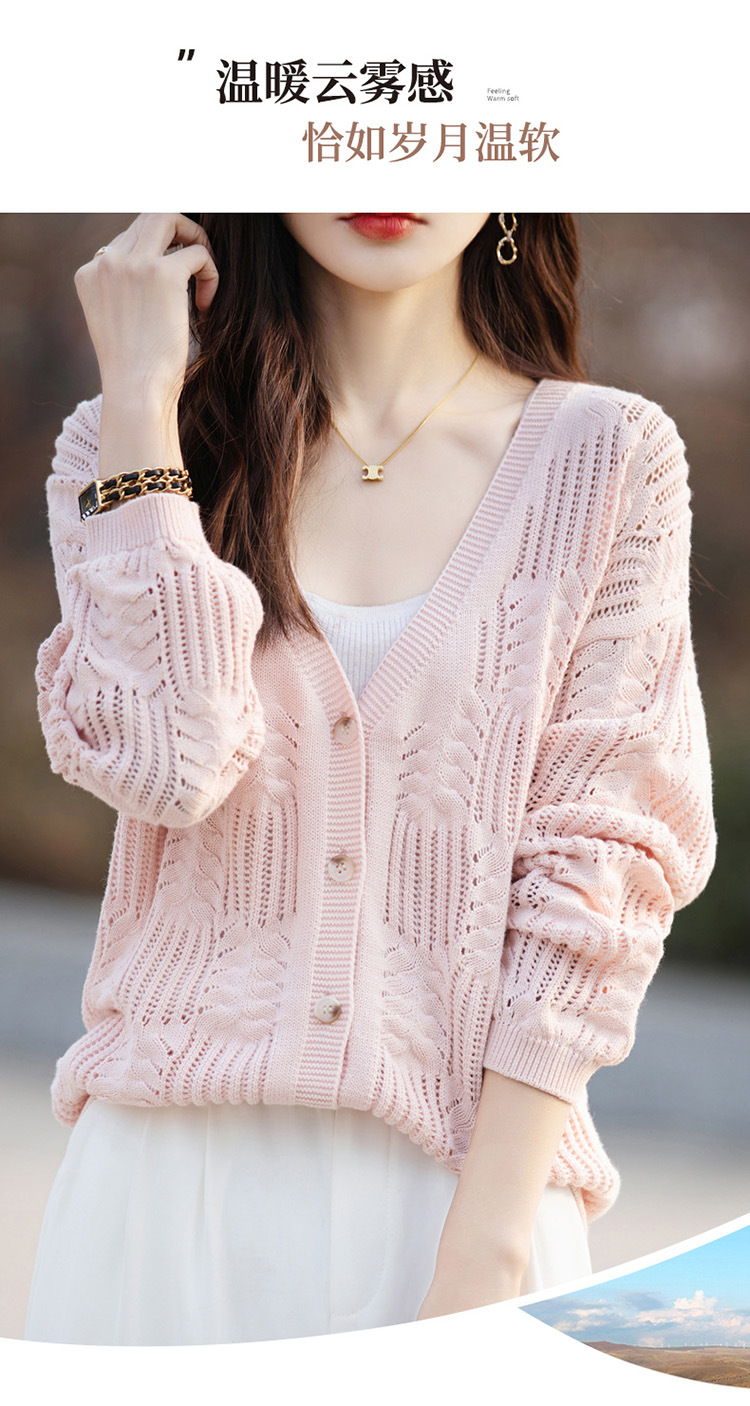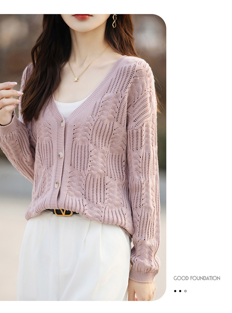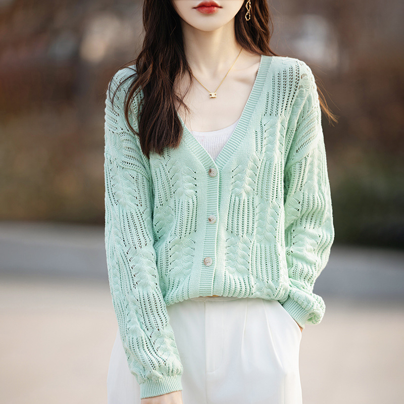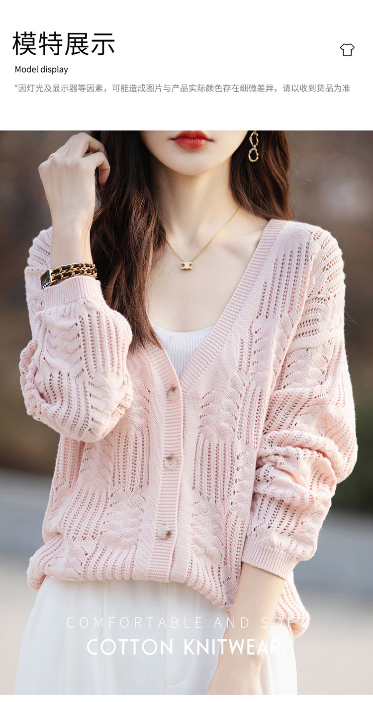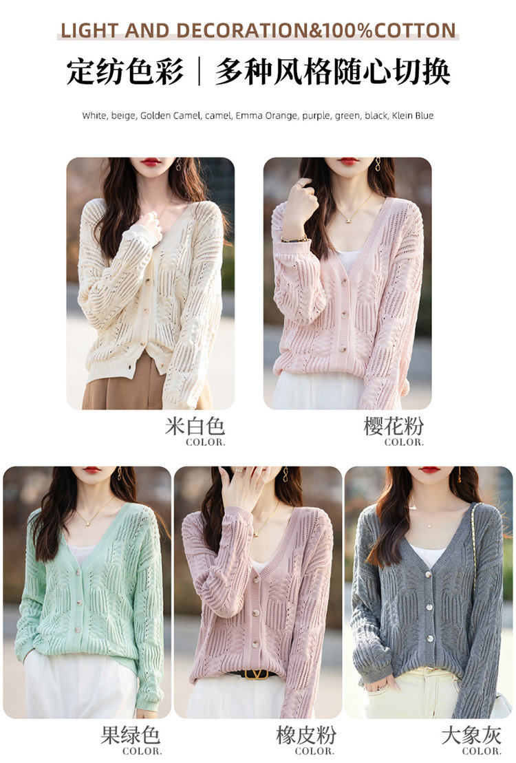 24 봄과 가을 새로운 코튼 라운드 넥 니트 카디건 여성 할로우 패션 우아한 느슨한 니트 코트 탑