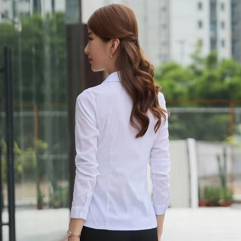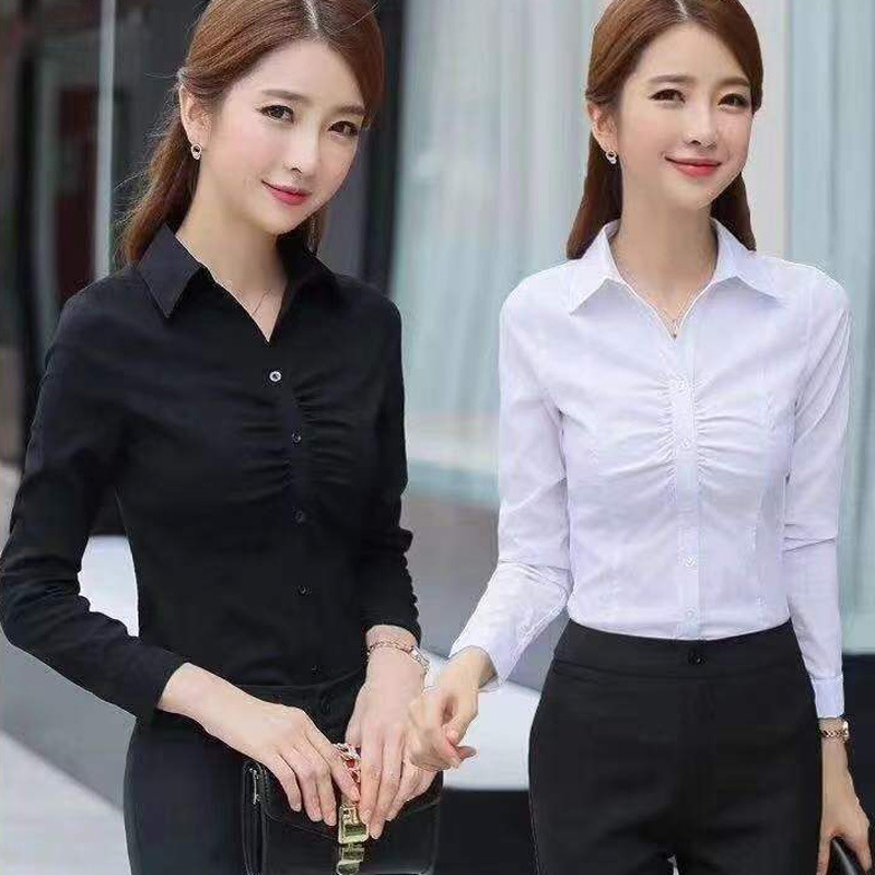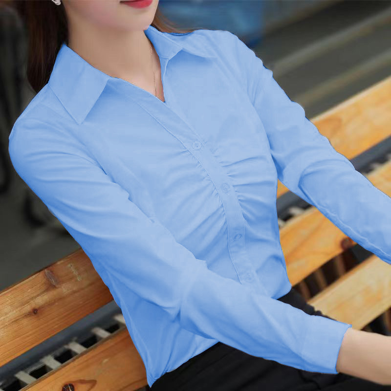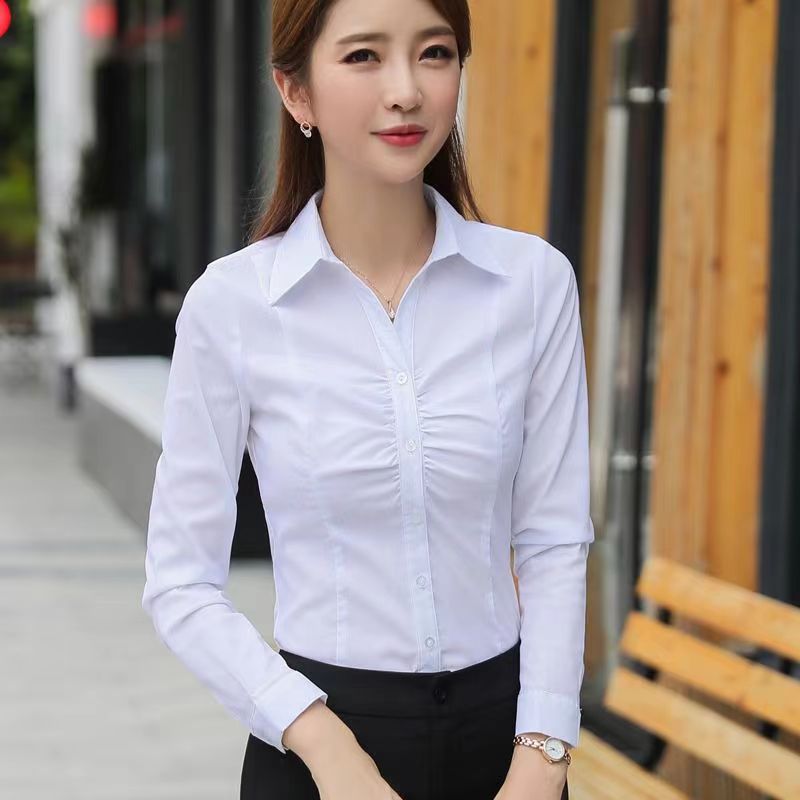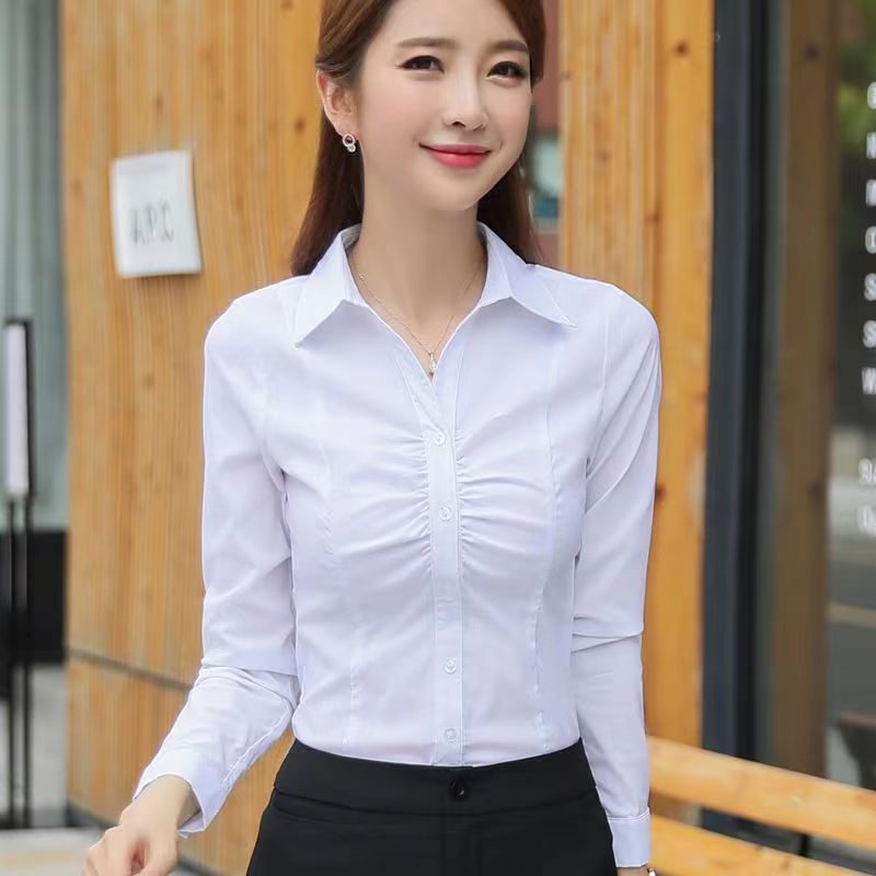 디자인감 있는 화이트 플리츠 여성 긴팔 2025 봄 신상 슬림핏 라펠 마이크로 엘라스틱 베이스 레이어 셔츠스토어 가기