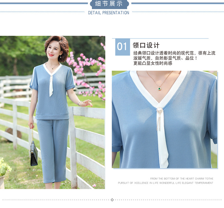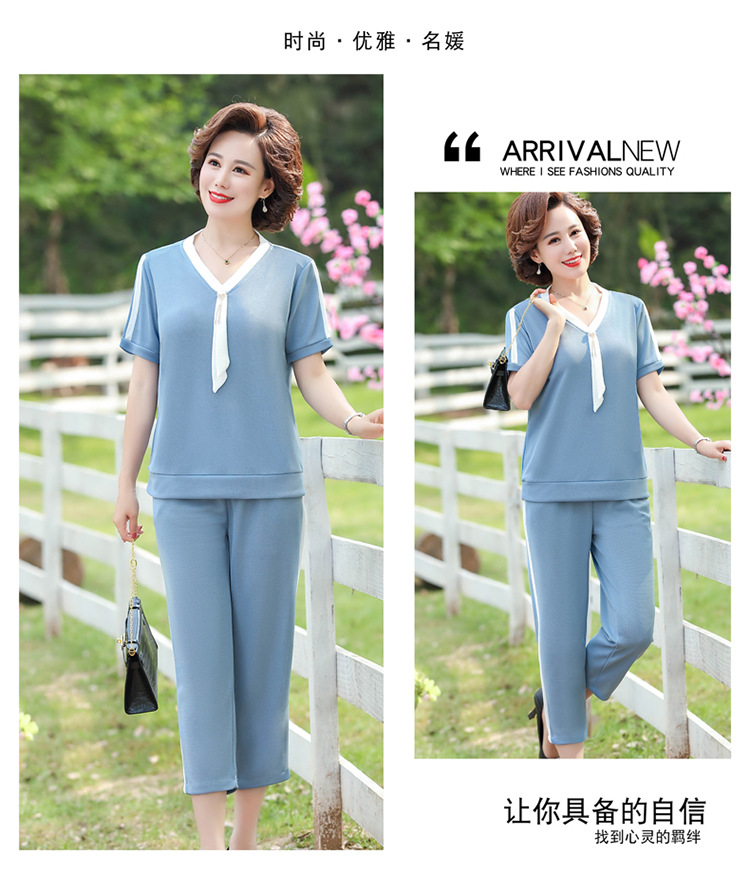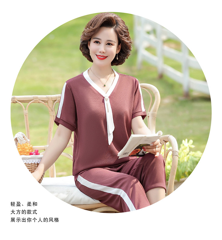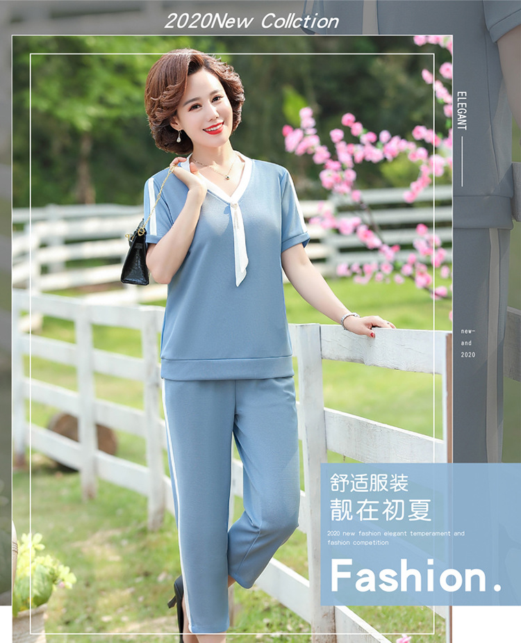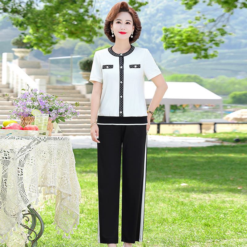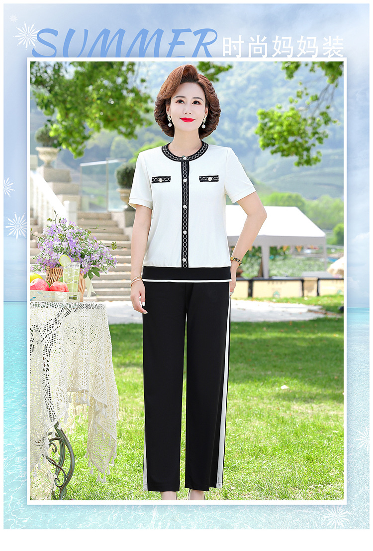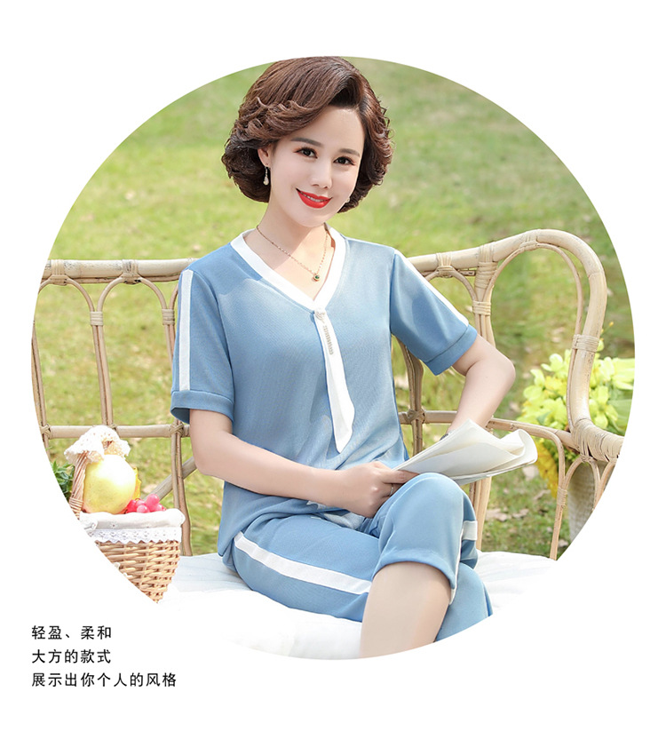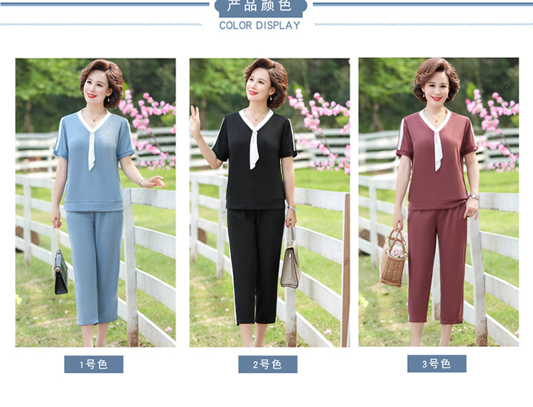 여름 새 스타일 세트 패션 캐주얼 어머니 옷 중년 및 노인 여성 투피스 세트 엄마를위한 중년 반팔 아이스 실크 탑