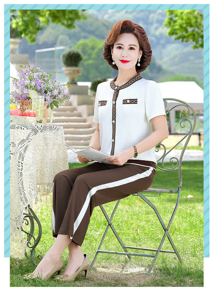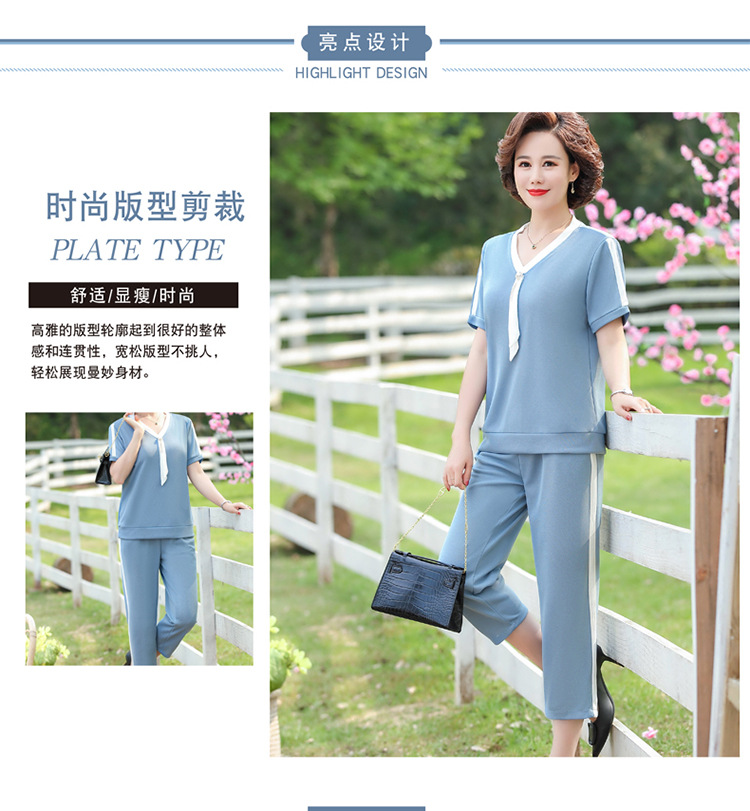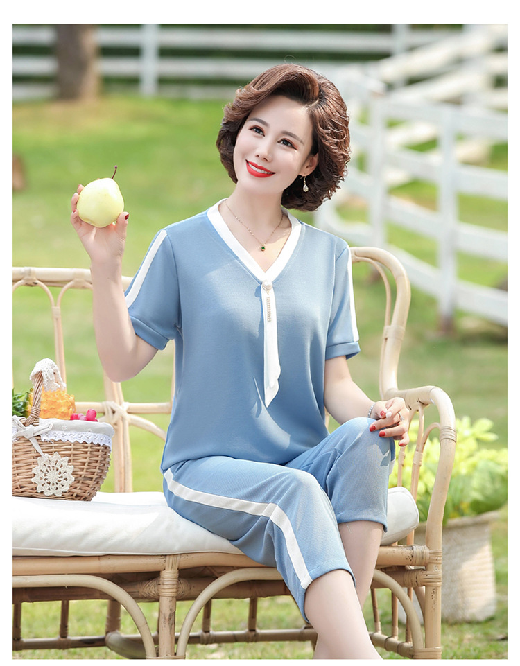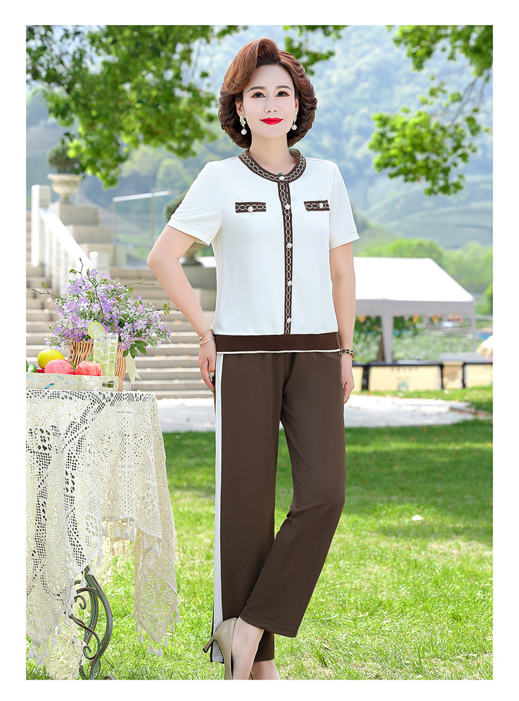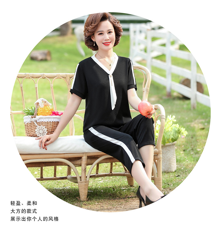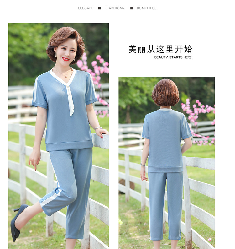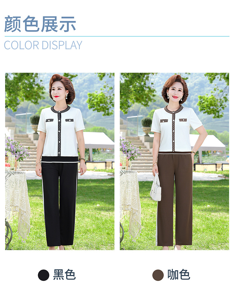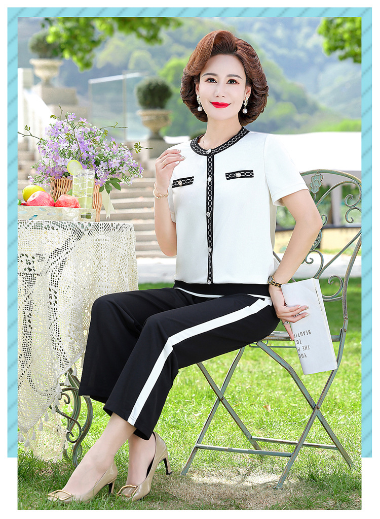 여름 새 스타일 세트 패션 캐주얼 어머니 옷 중년 및 노인 여성 투피스 세트 엄마를위한 중년 반팔 아이스 실크 탑