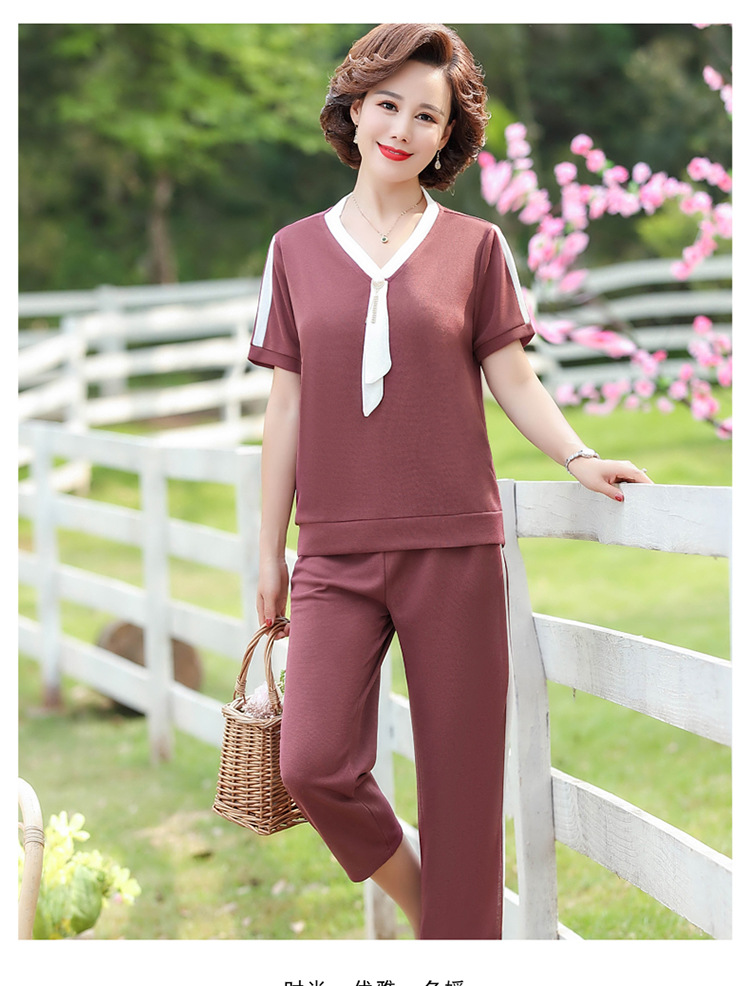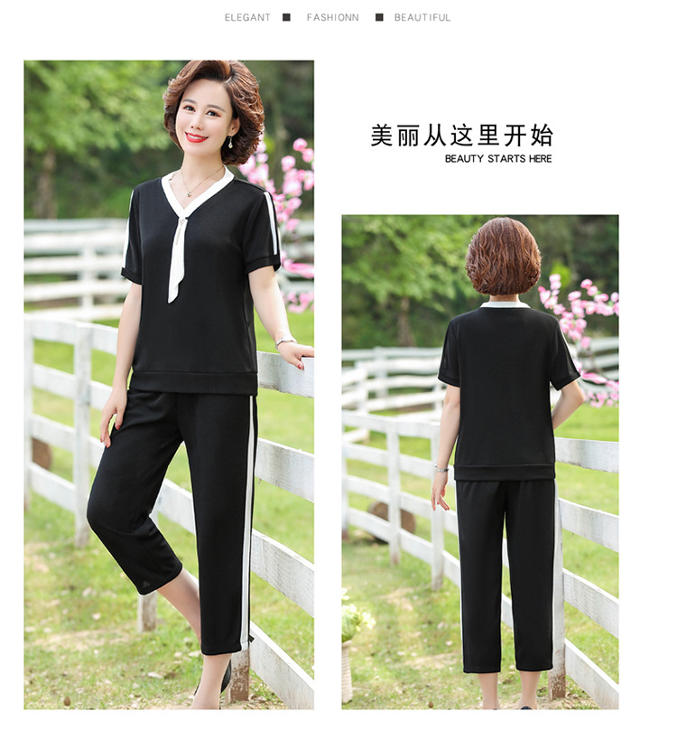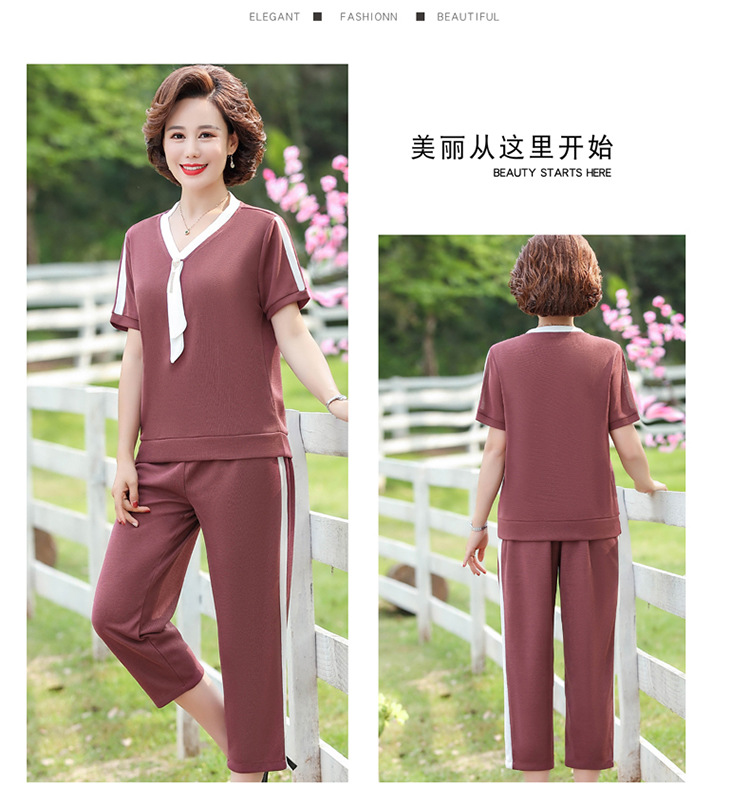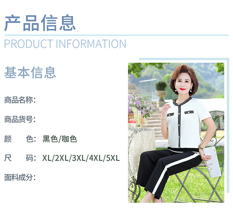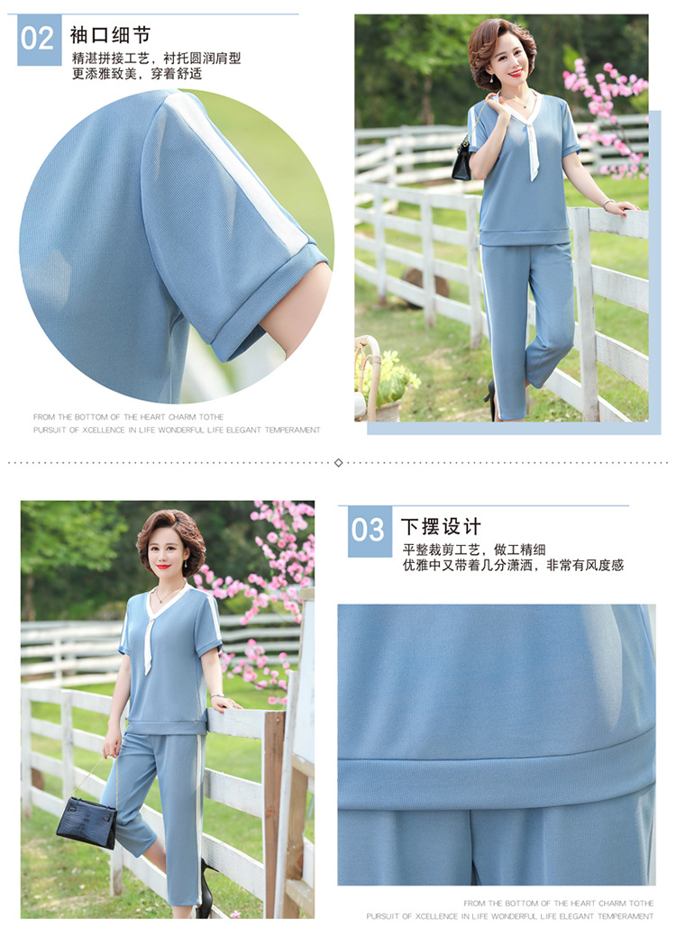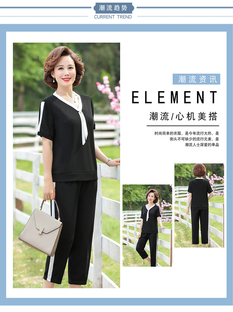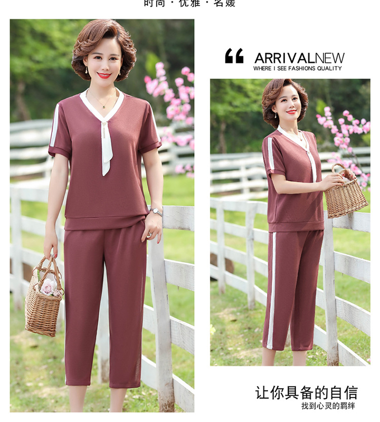 여름 새 스타일 세트 패션 캐주얼 어머니 옷 중년 및 노인 여성 투피스 세트 엄마를위한 중년 반팔 아이스 실크 탑