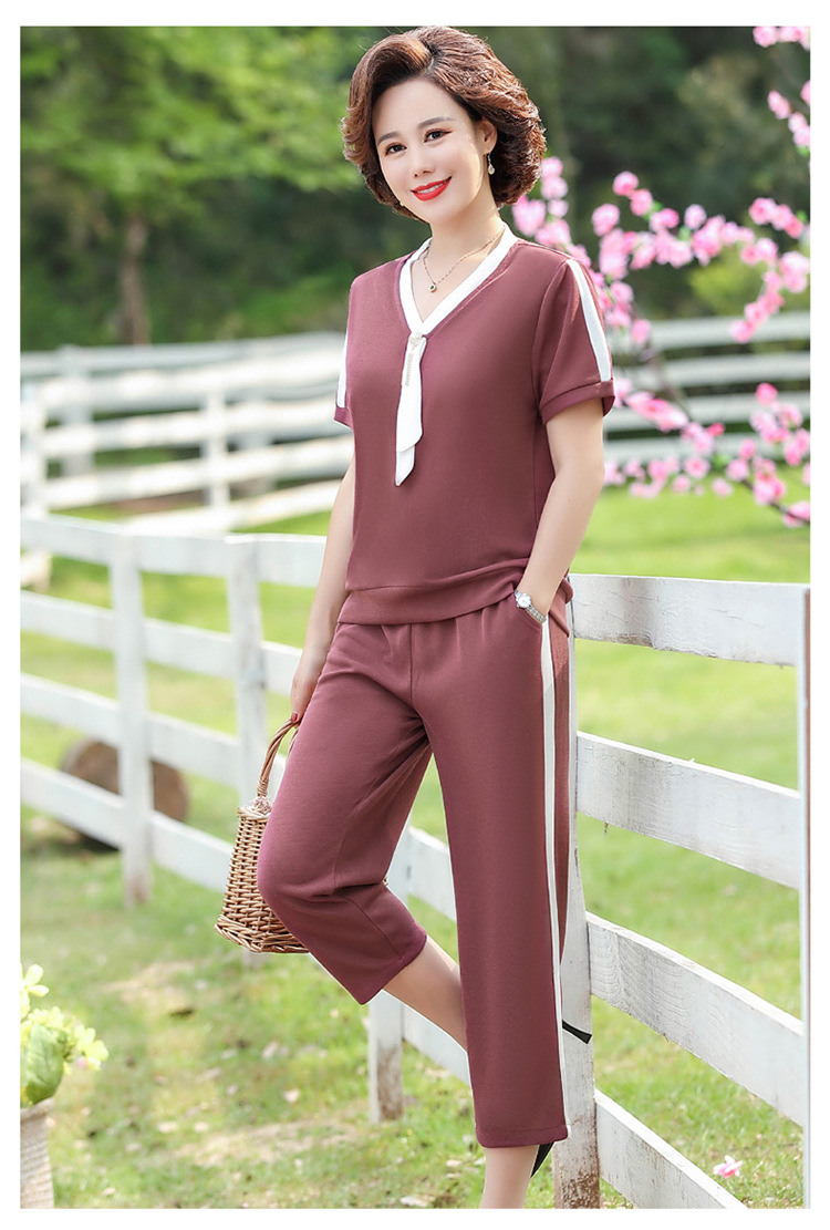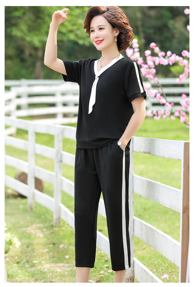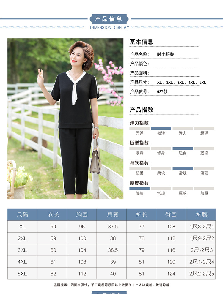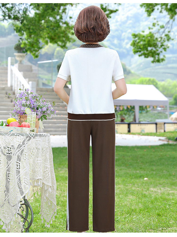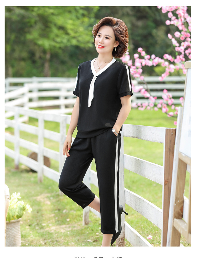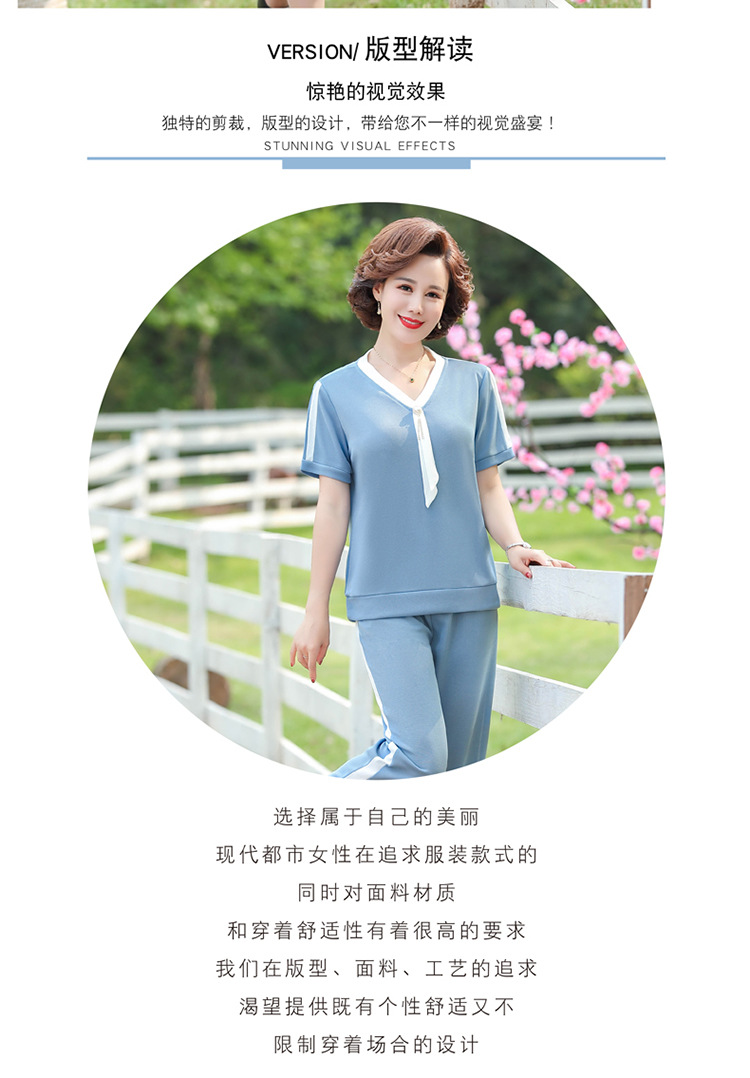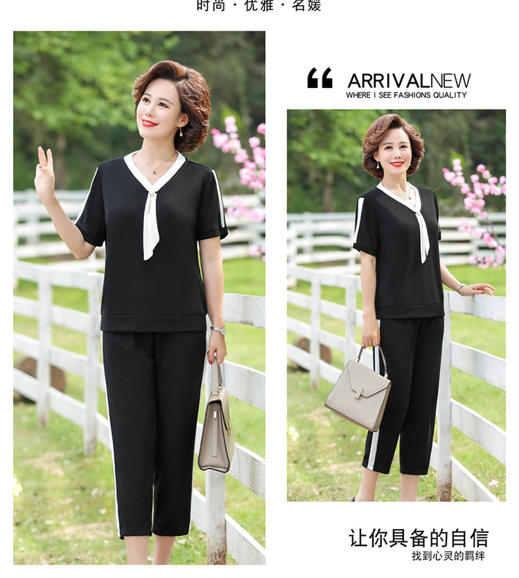여름 새 스타일 세트 패션 캐주얼 어머니 옷 중년 및 노인 여성 투피스 세트 엄마를위한 중년 반팔 아이스 실크 탑