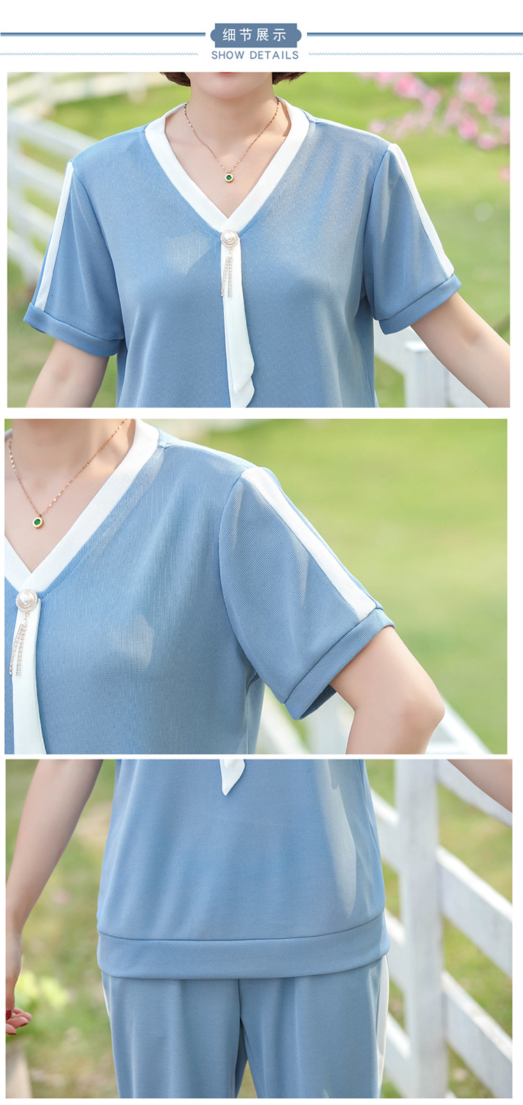 여름 새 스타일 세트 패션 캐주얼 어머니 옷 중년 및 노인 여성 투피스 세트 엄마를위한 중년 반팔 아이스 실크 탑스토어 가기