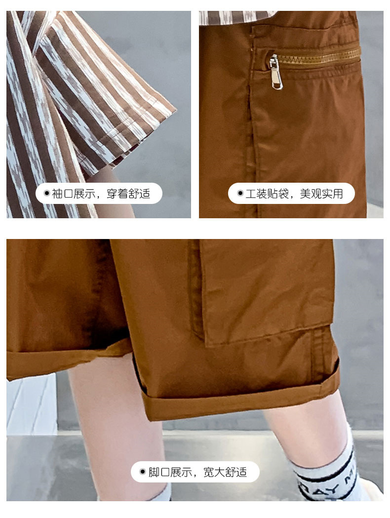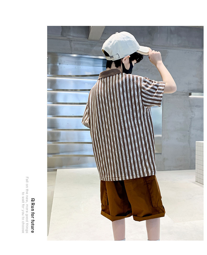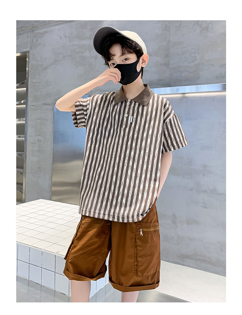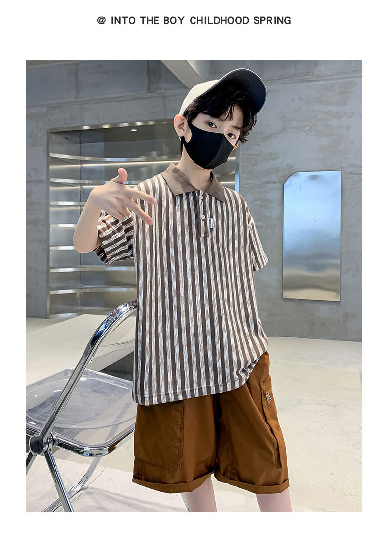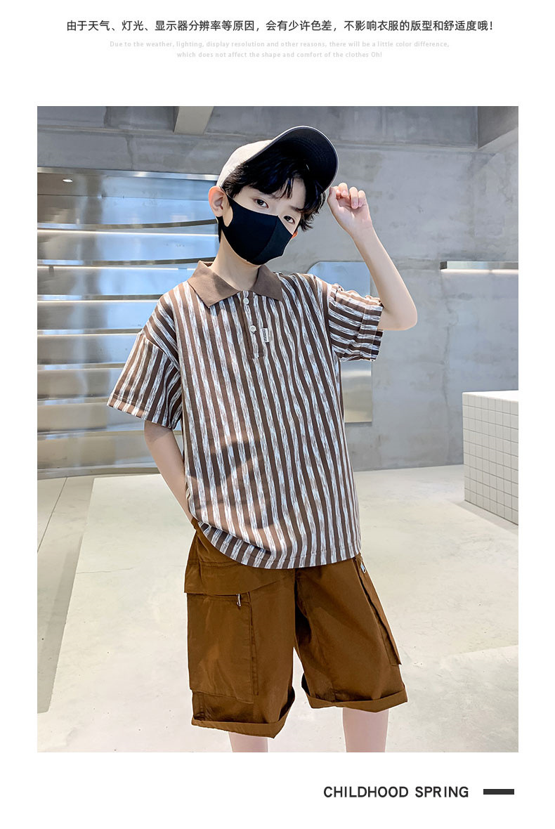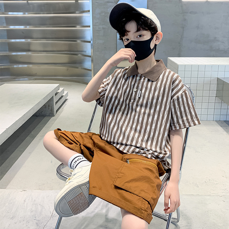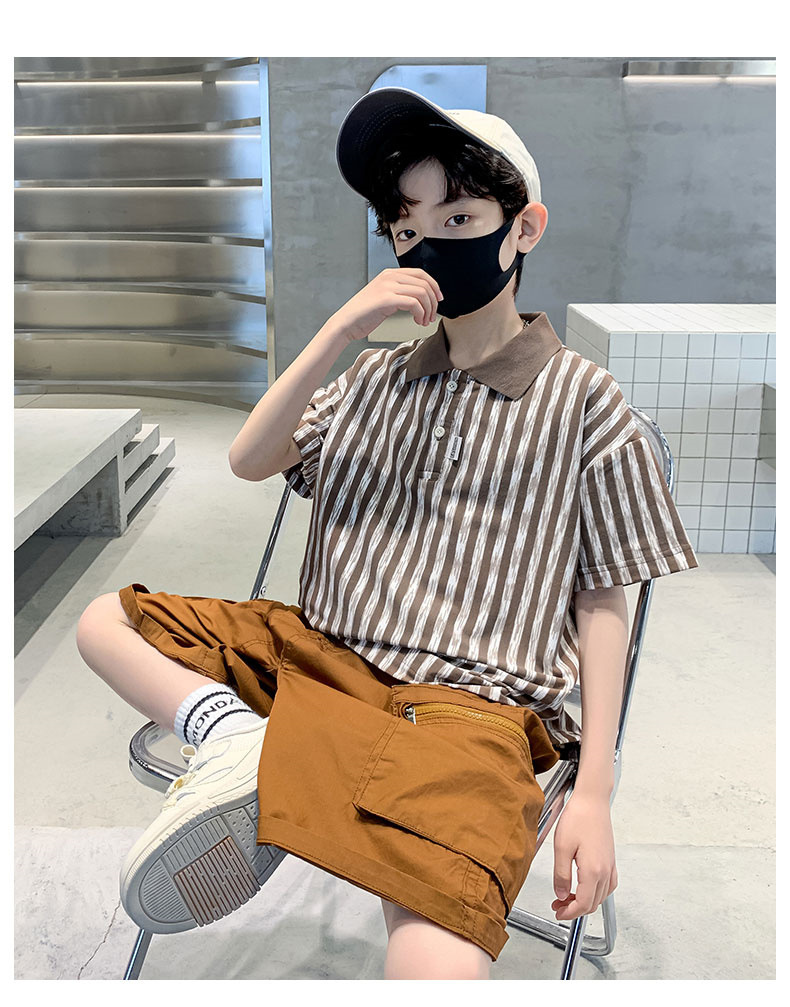 남학생의 여름 줄무늬 폴로 셔츠 반팔 바지 세트 2024 중대형 어린이를위한 새로운 여름 투피스 세트스토어 가기
