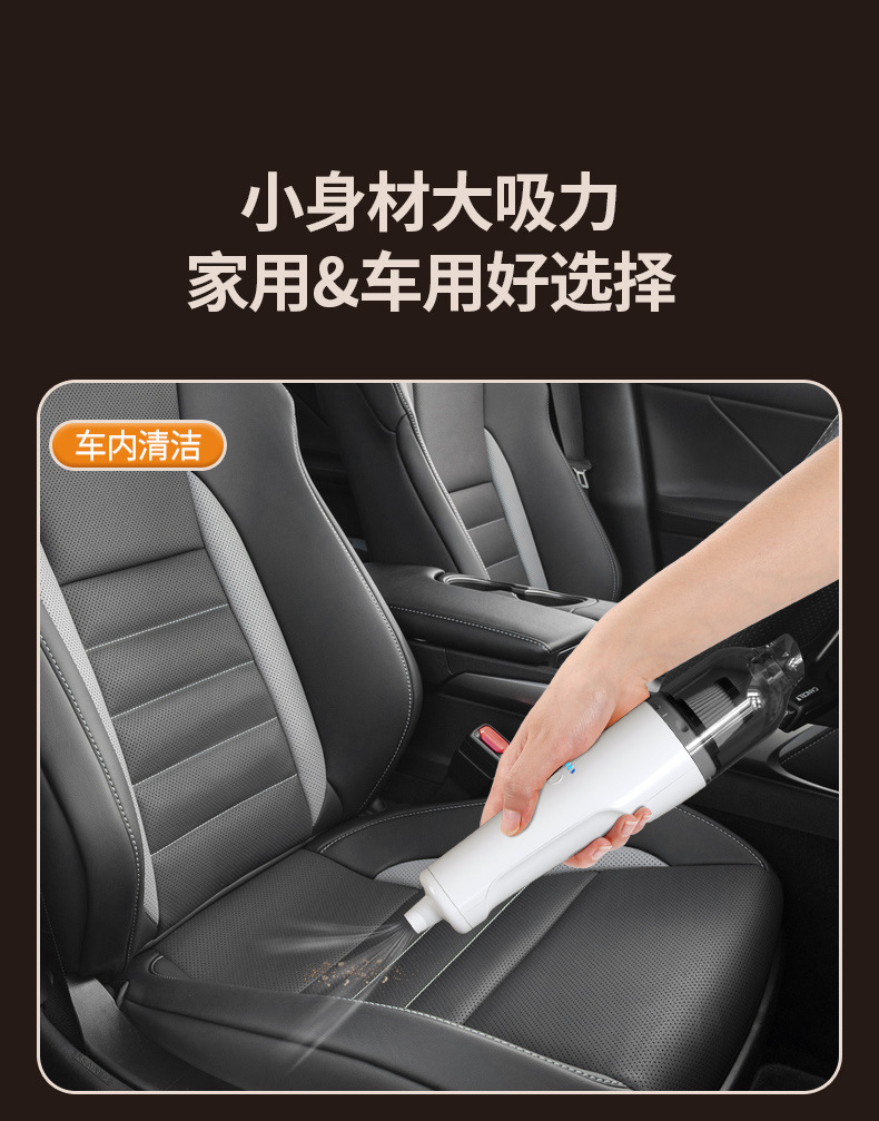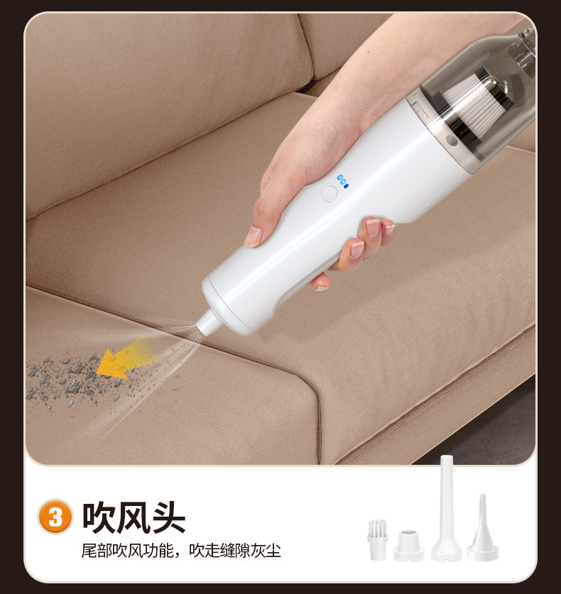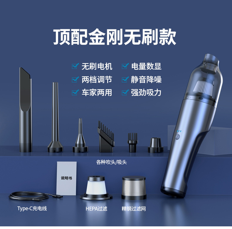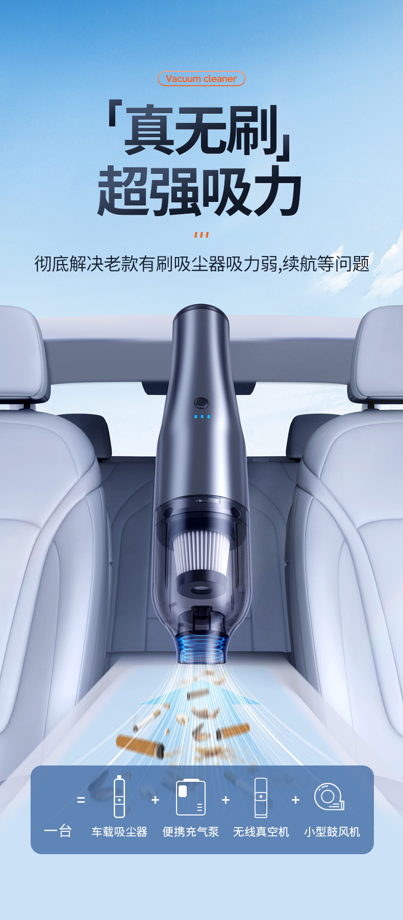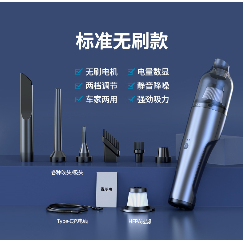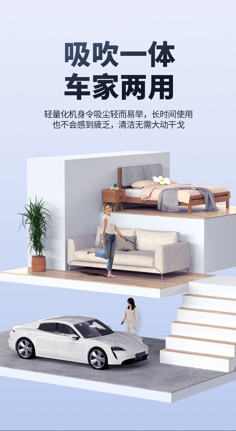 1.无线随手吸车载吸尘器,车家共享,吸抽吹一体式设计。