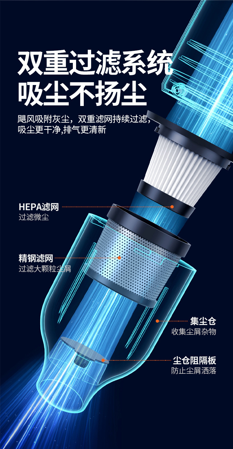 4.轻松可拆卸式集尘仓,内备纳米HEPA环保滤网,可反复水洗。