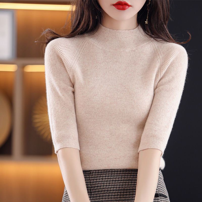 반 소매가 달린 외국식 세트 슬림핏 반 터틀넥 니트 스웨터베이스 레이어 셔츠 여성용 타이트한 중간 소매 솔리드 컬러 풀오버스토어 가기