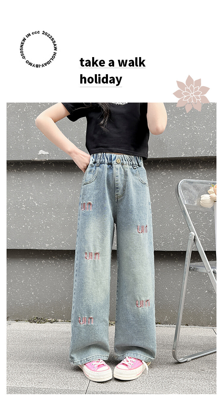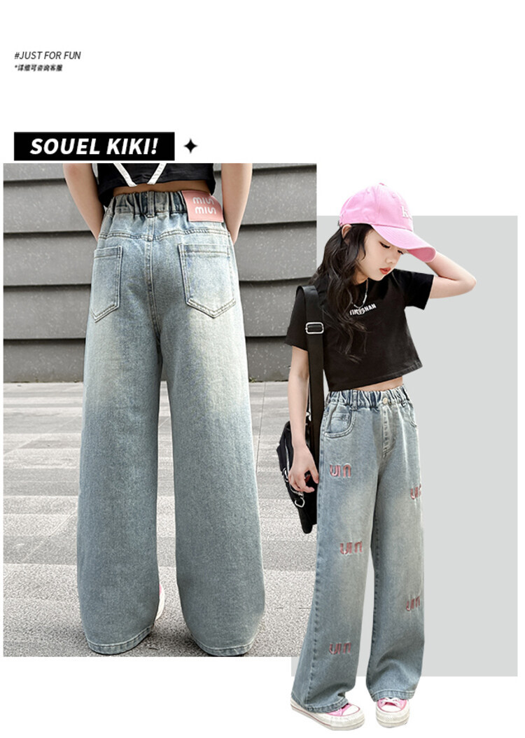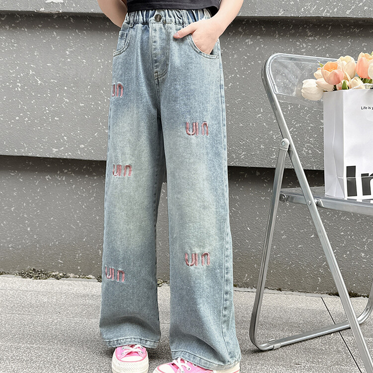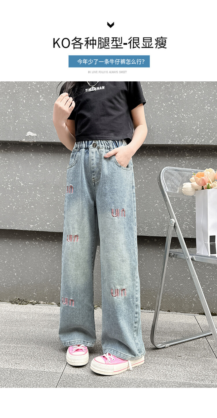 소녀 바지 봄과 가을 외부 착용 2024 새로운 스타일 중대형 어린이 캐주얼 스트레이트 와이드 다리 느슨한 봄 청바지스토어 가기
