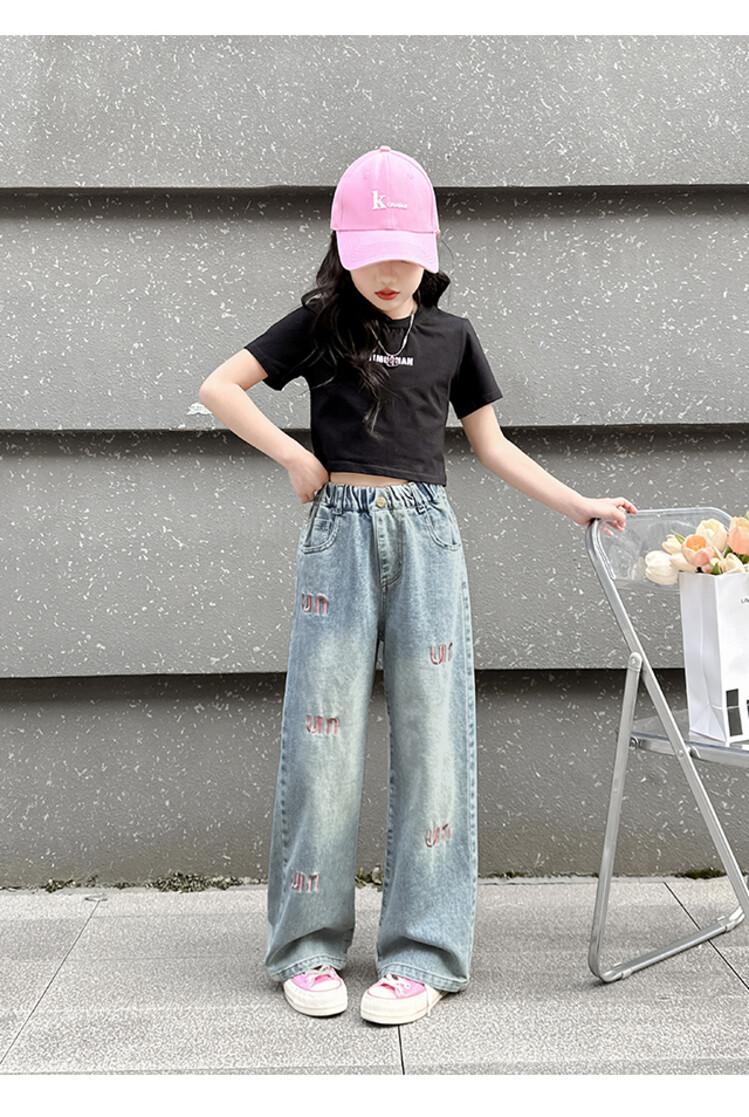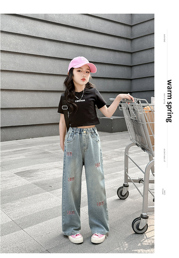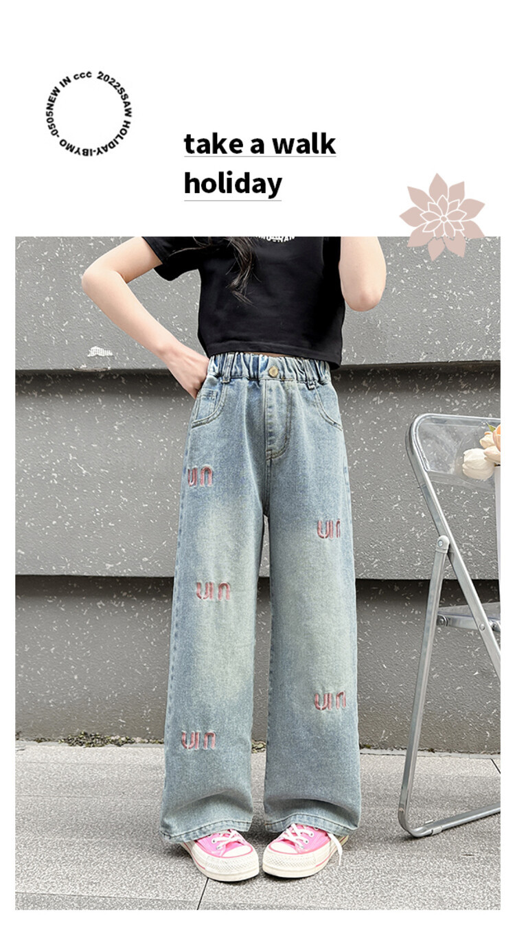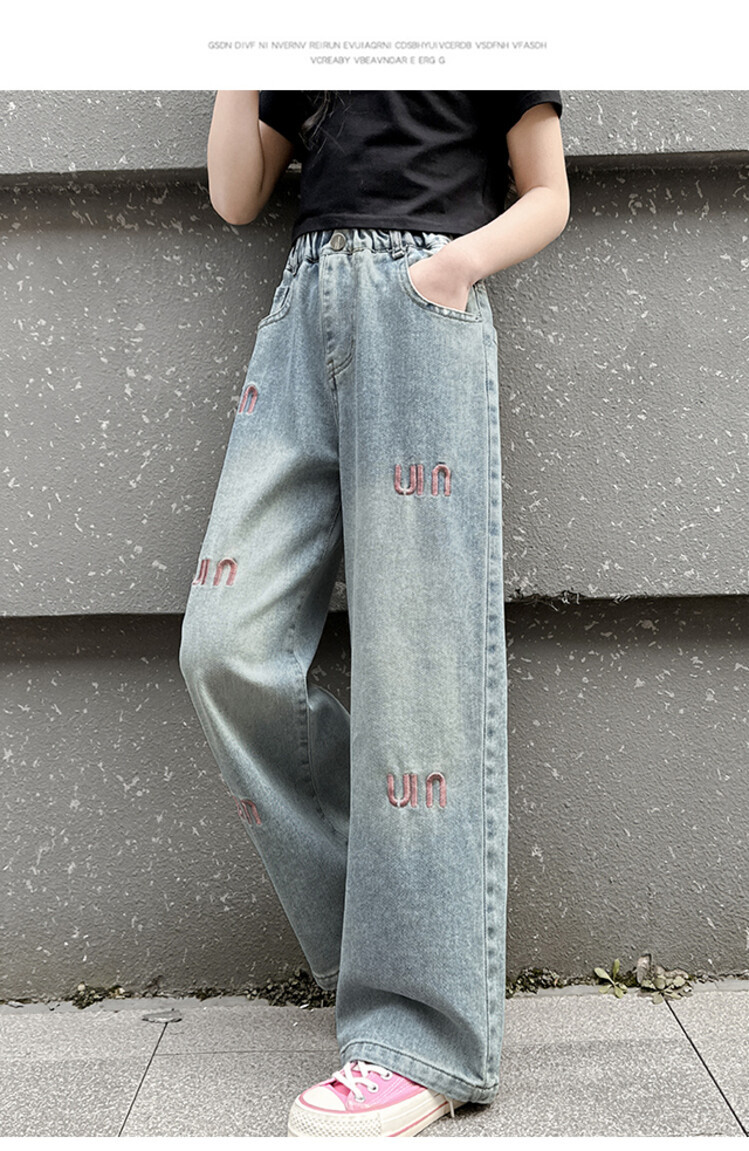 소녀 바지 봄과 가을 외부 착용 2024 새로운 스타일 중대형 어린이 캐주얼 스트레이트 와이드 다리 느슨한 봄 청바지