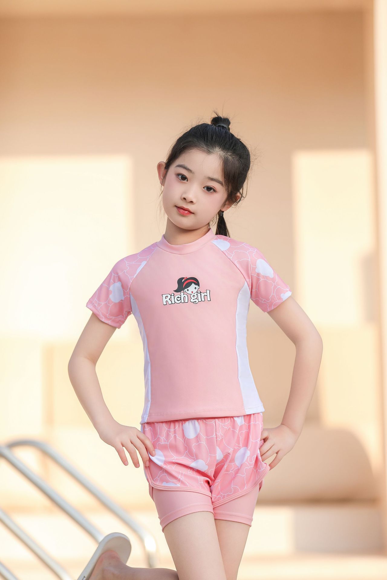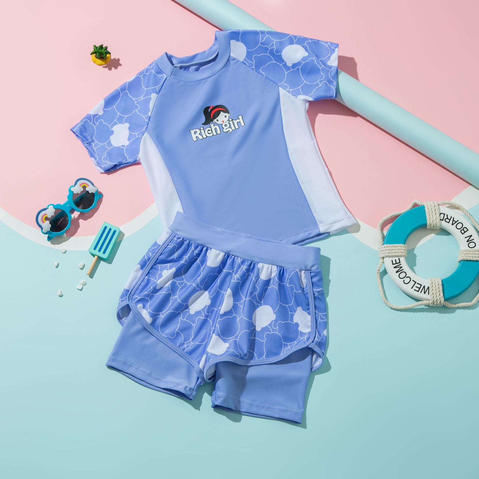 7)商品说明:动物图案数码印染不易脱落,久穿如新。卡通立体造型,童趣可爱。A类面料,面料安全柔软舒服,弹性佳,贴身舒适。防晒指标UPF50+,有效防止紫外线