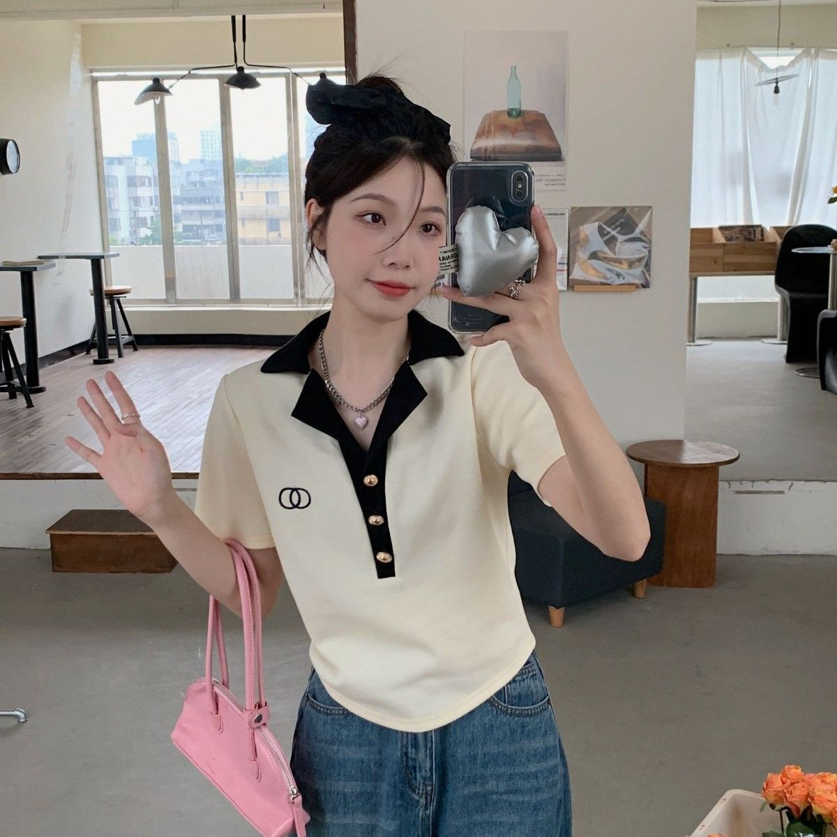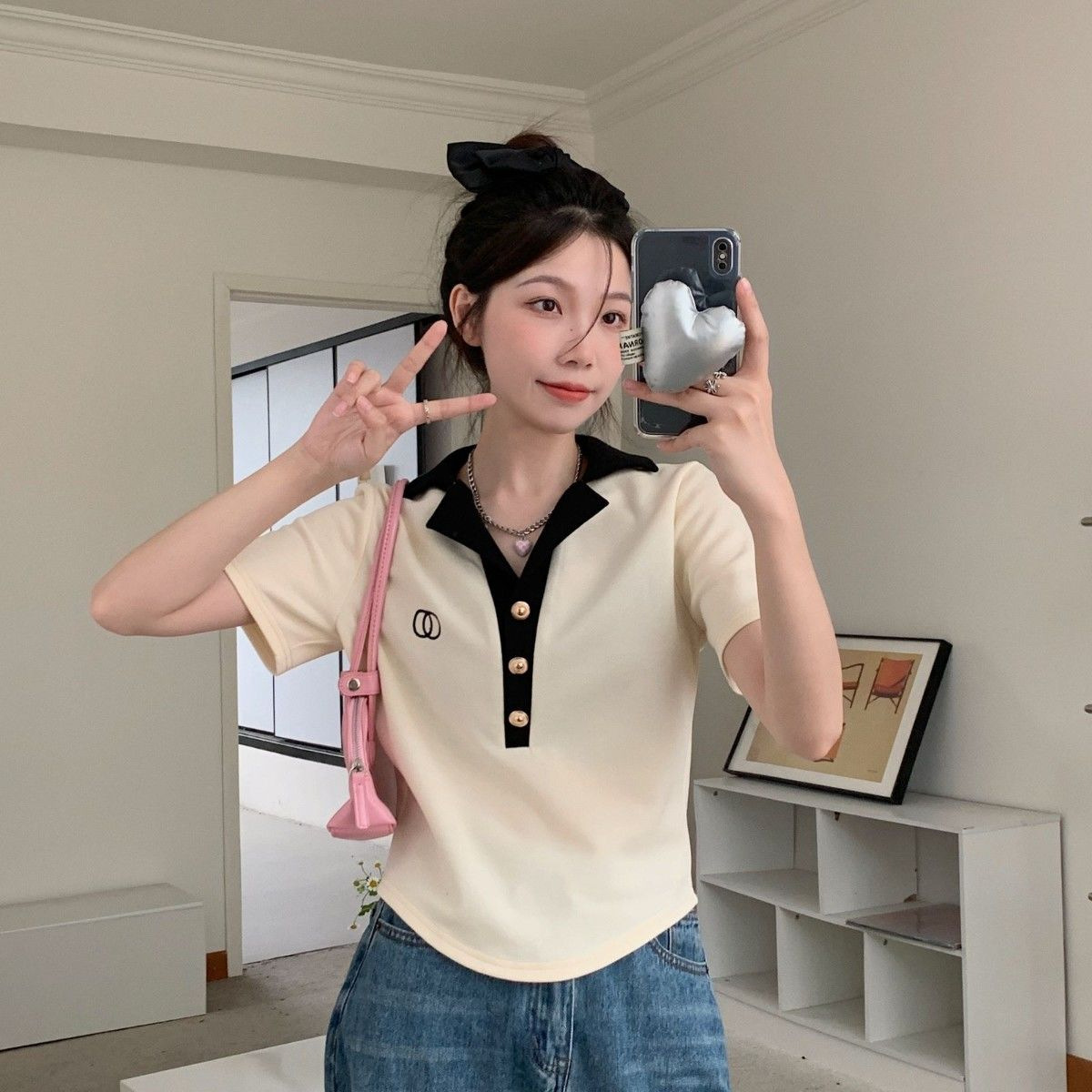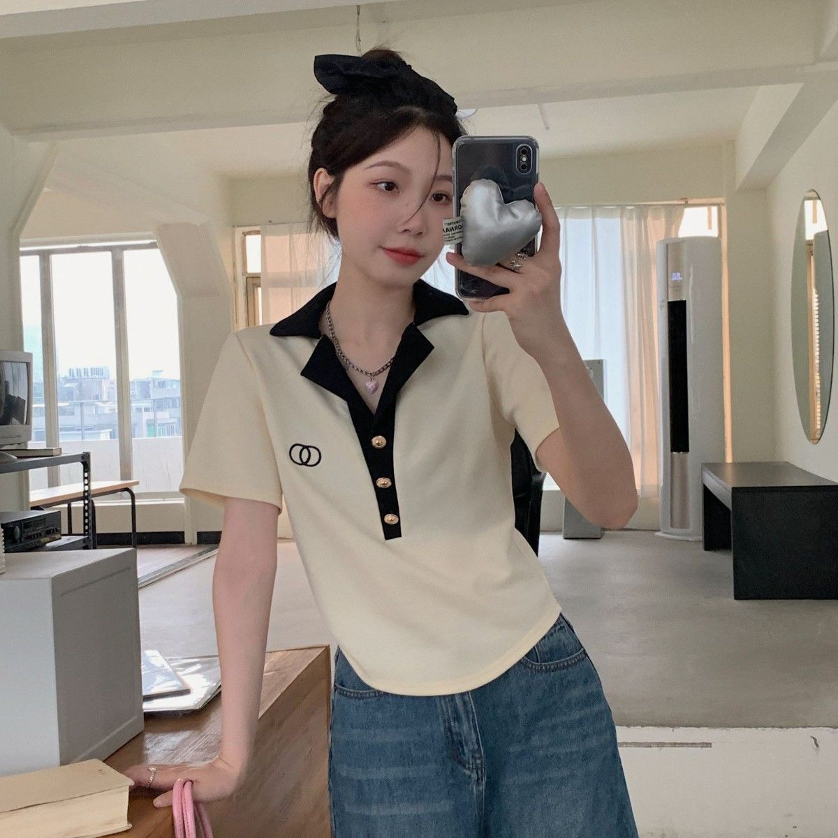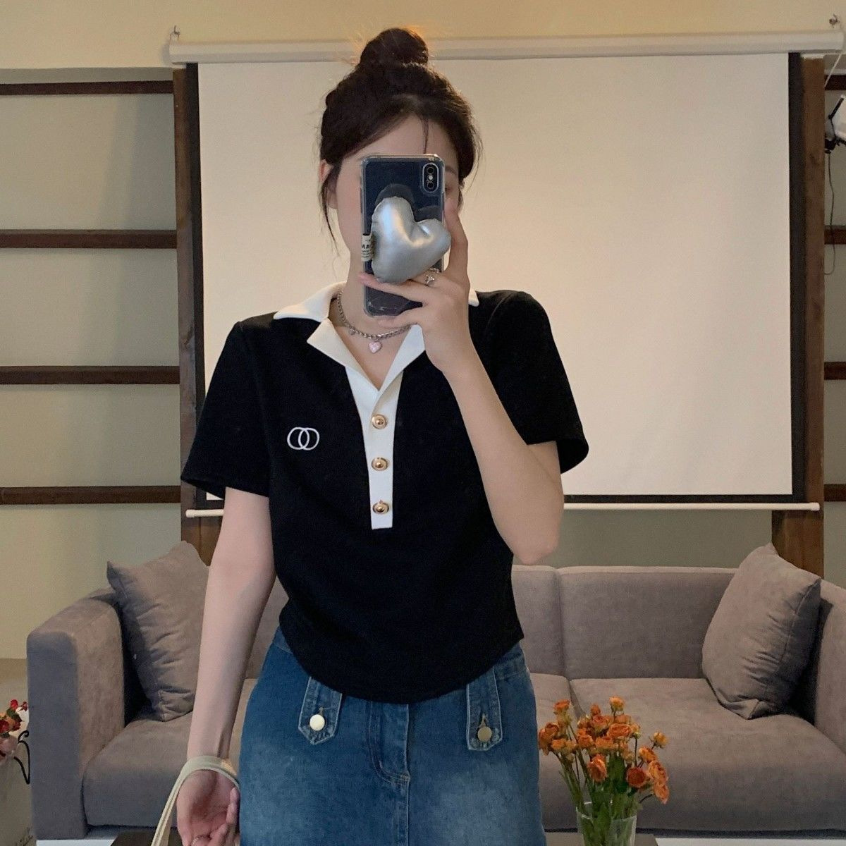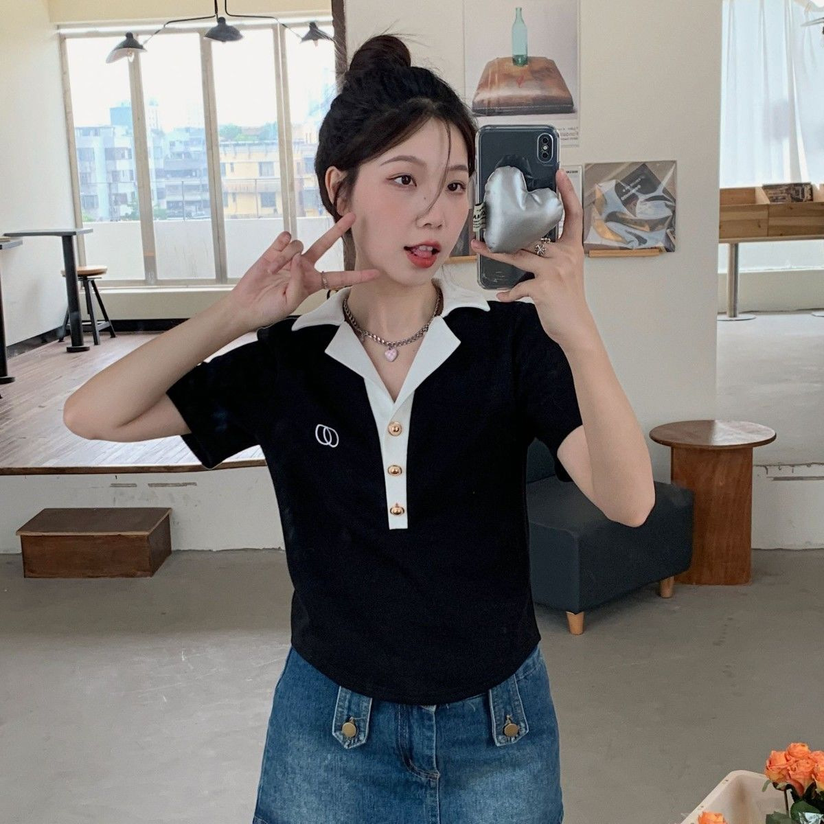 여름 프랑스 옷깃 폴로 셔츠 반팔 티셔츠 여성 패션 슬림 룩 웨스턴 스타일 올 매치 자수 대형 MM 탑스토어 가기
