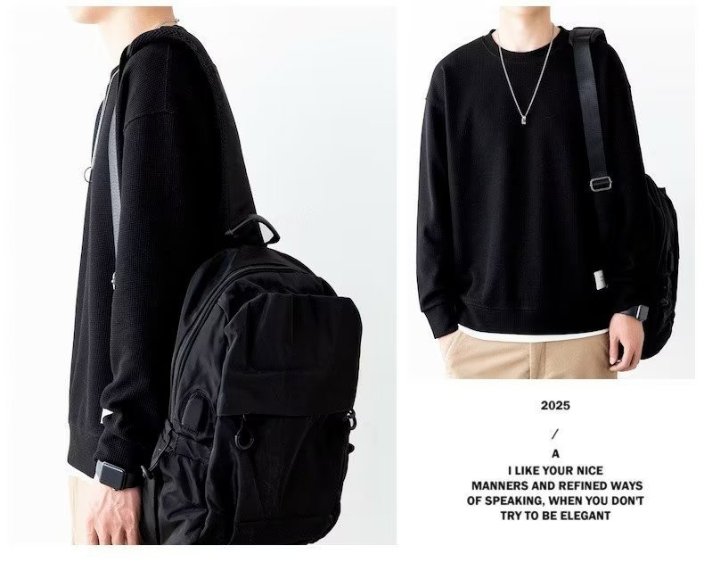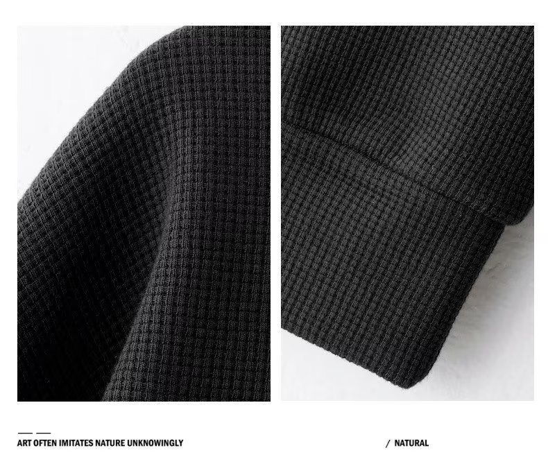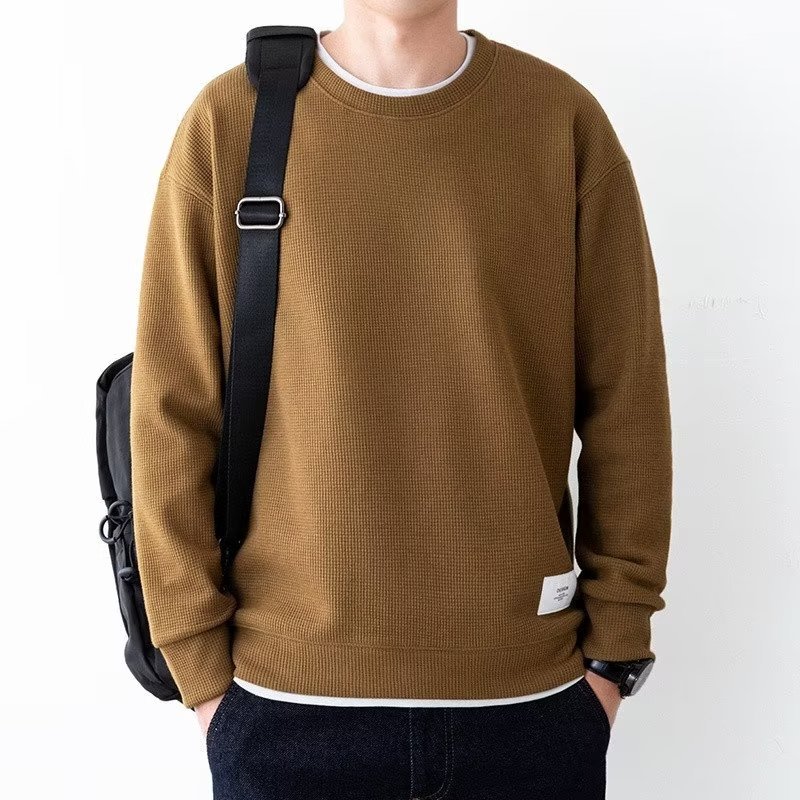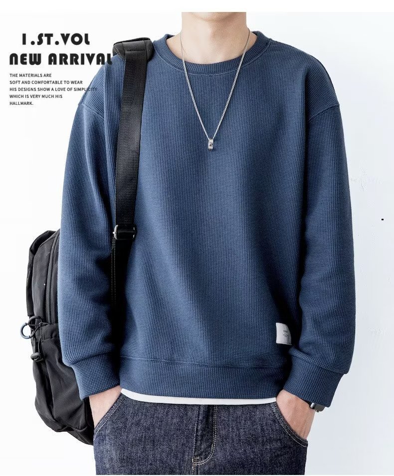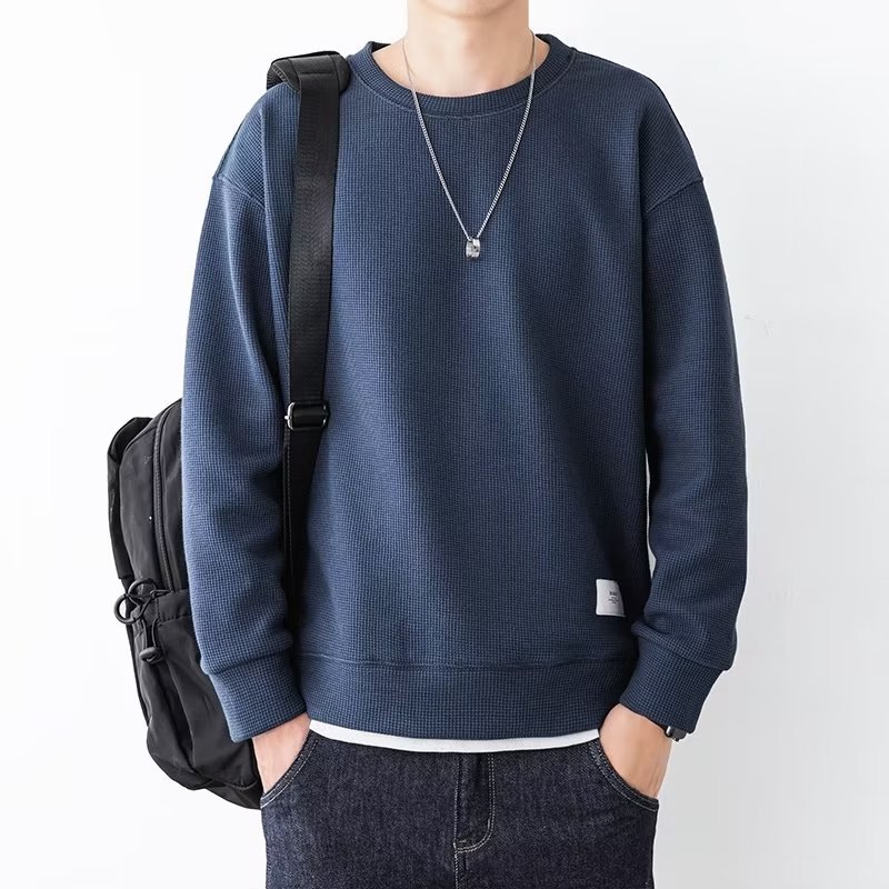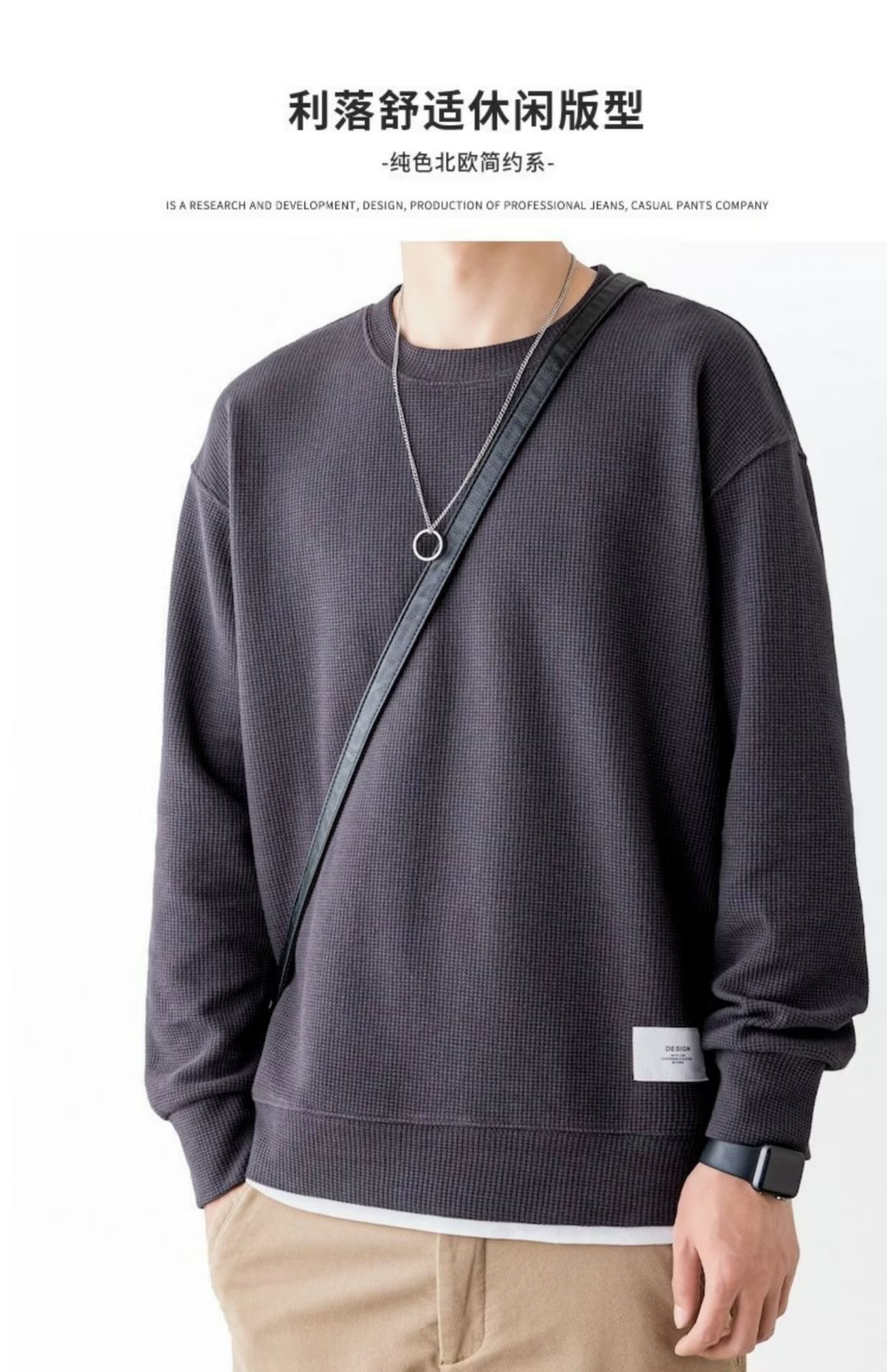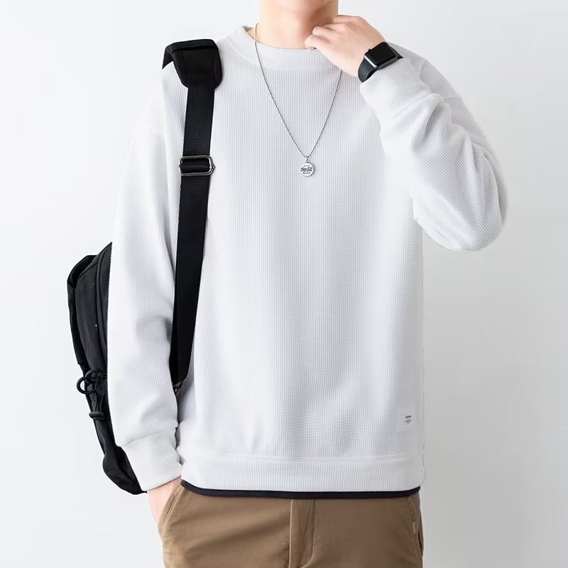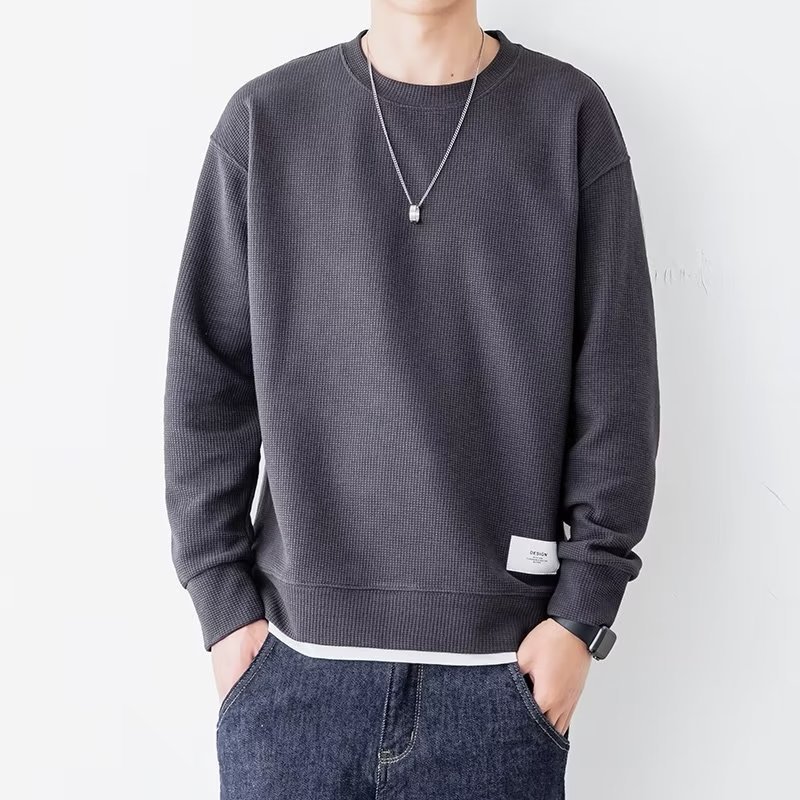 캐주얼 청소년 인기 스웨터 남성 유행 가짜 2 피스 와플 라벨 장식 풀오버 라운드 넥 느슨한 긴 소매 탑
