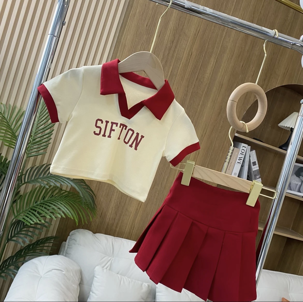 여아 여름 대학 스타일 정장 2025 새로운 패션 스타일 폴로 셔츠, 반팔 티셔츠, 어린이 및 중년 어린이를 위한 플리츠 스커트