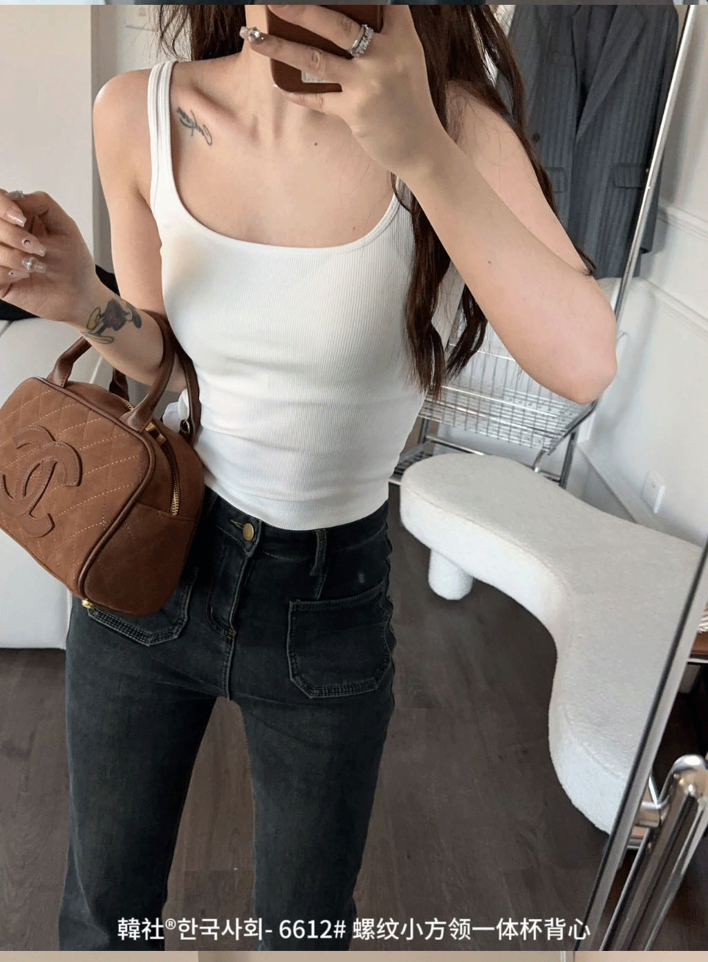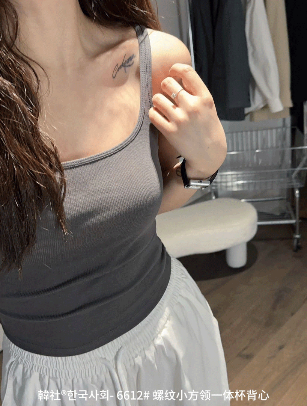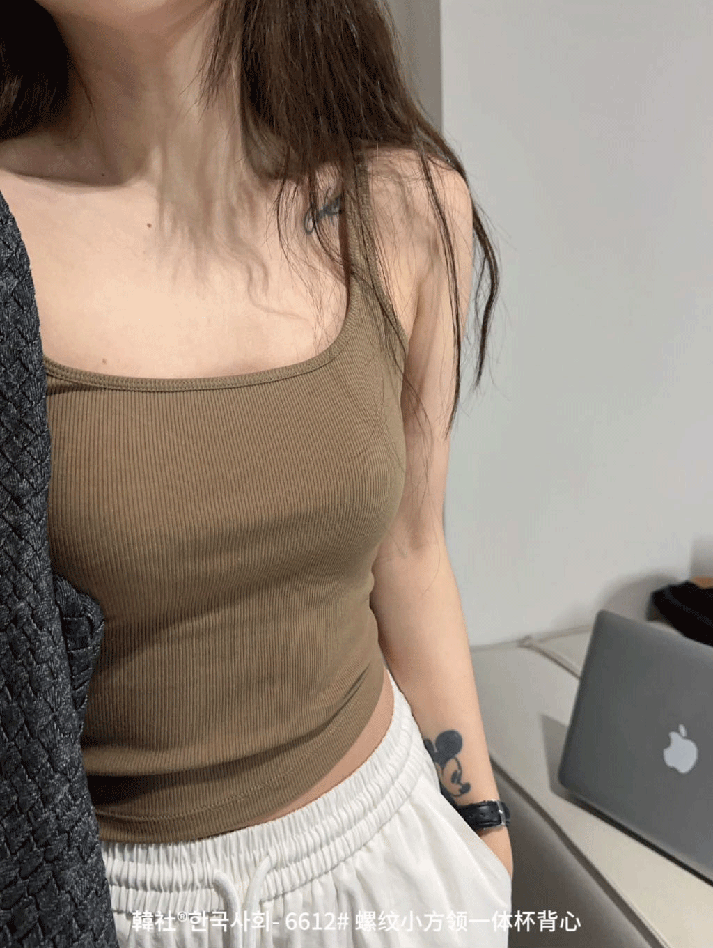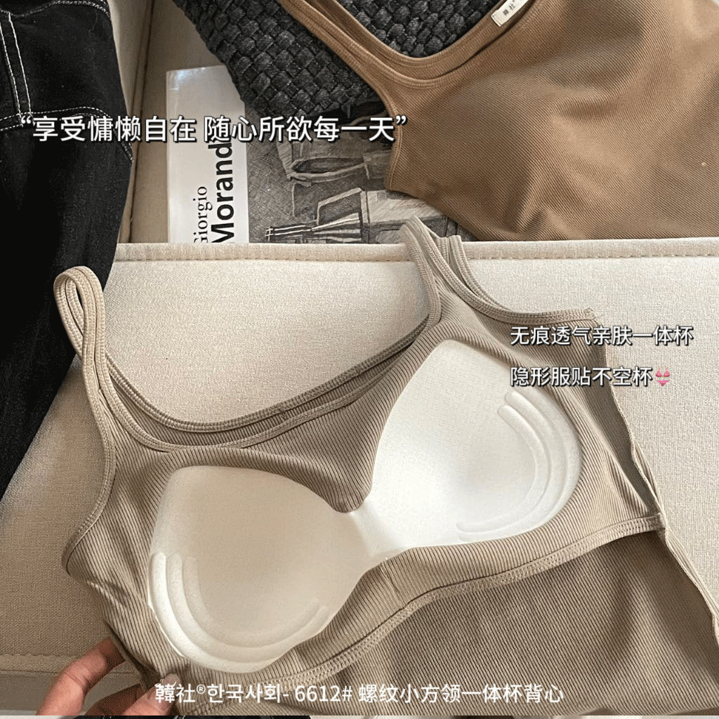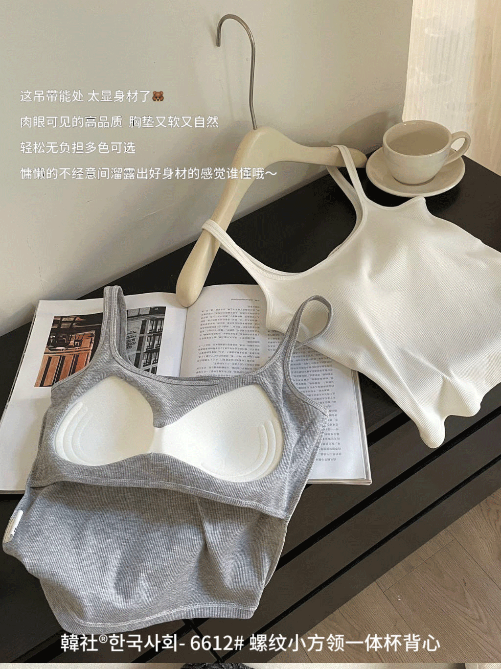6612 Threaded Small Square Collar Sling Fixed Cup Vest 여성용 슬림 핏 내복 외부 착용 슬림 해 보이는 파라 가슴을 덮는 아름다운 뒷 조끼스토어 가기