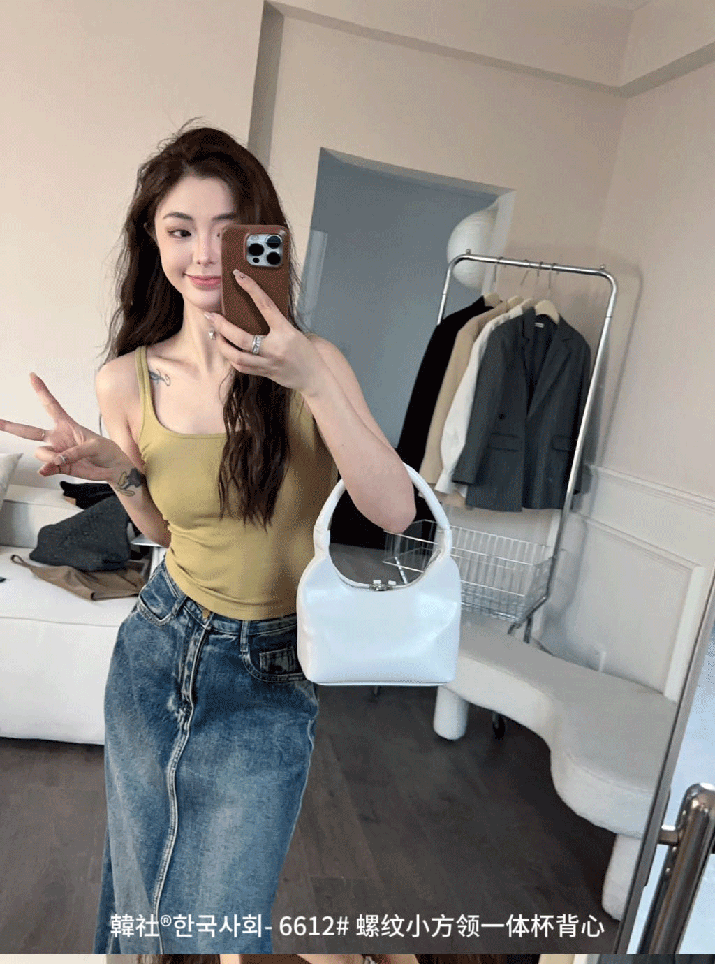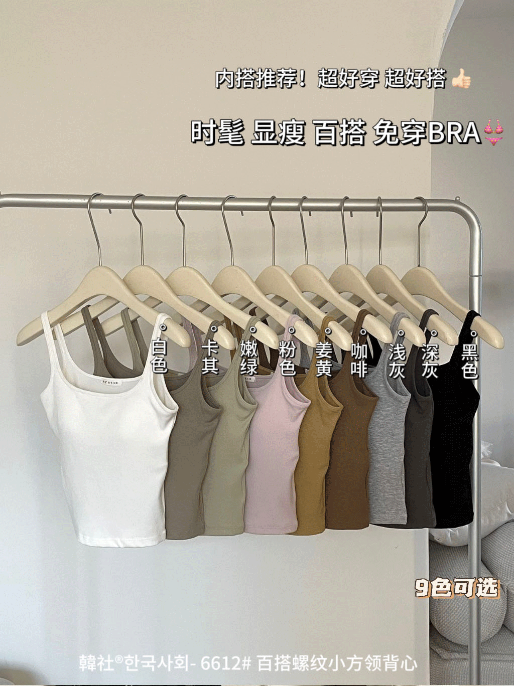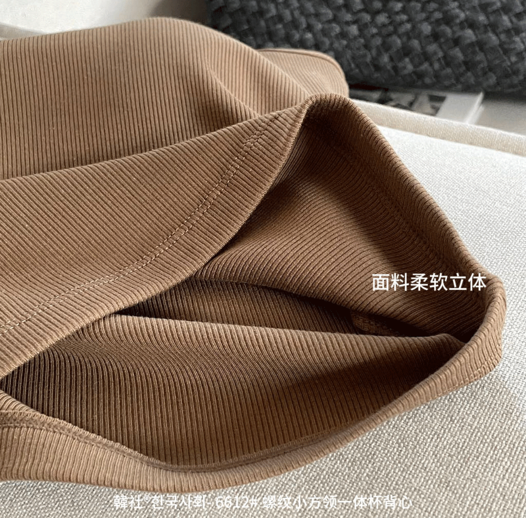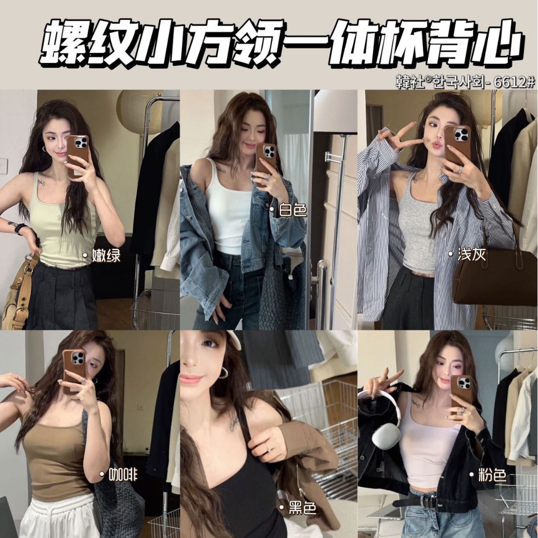6612 Threaded Small Square Collar Sling Fixed Cup Vest 여성용 슬림 핏 내복 외부 착용 슬림 해 보이는 파라 가슴을 덮는 아름다운 뒷 조끼스토어 가기